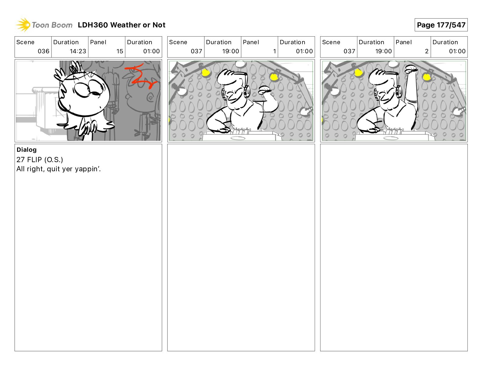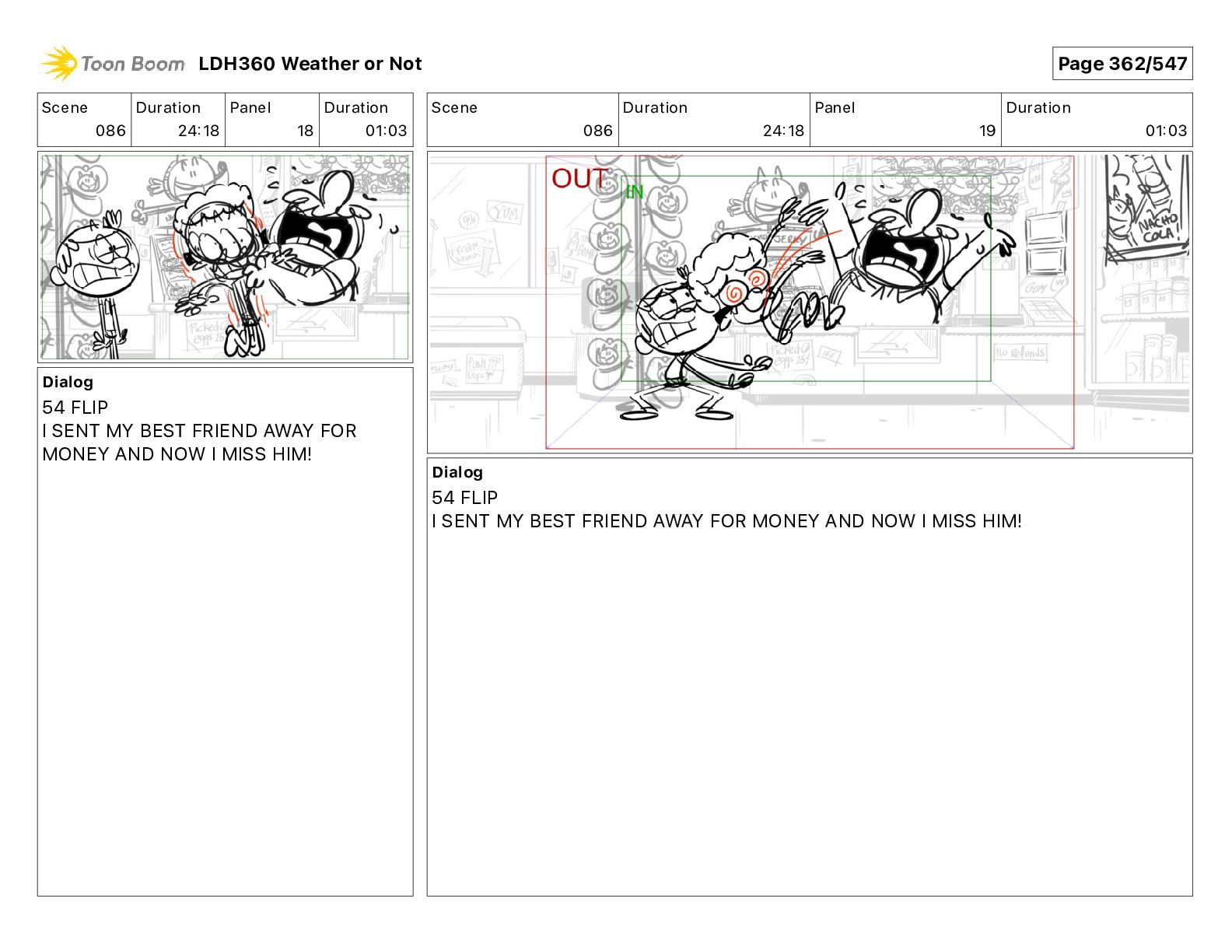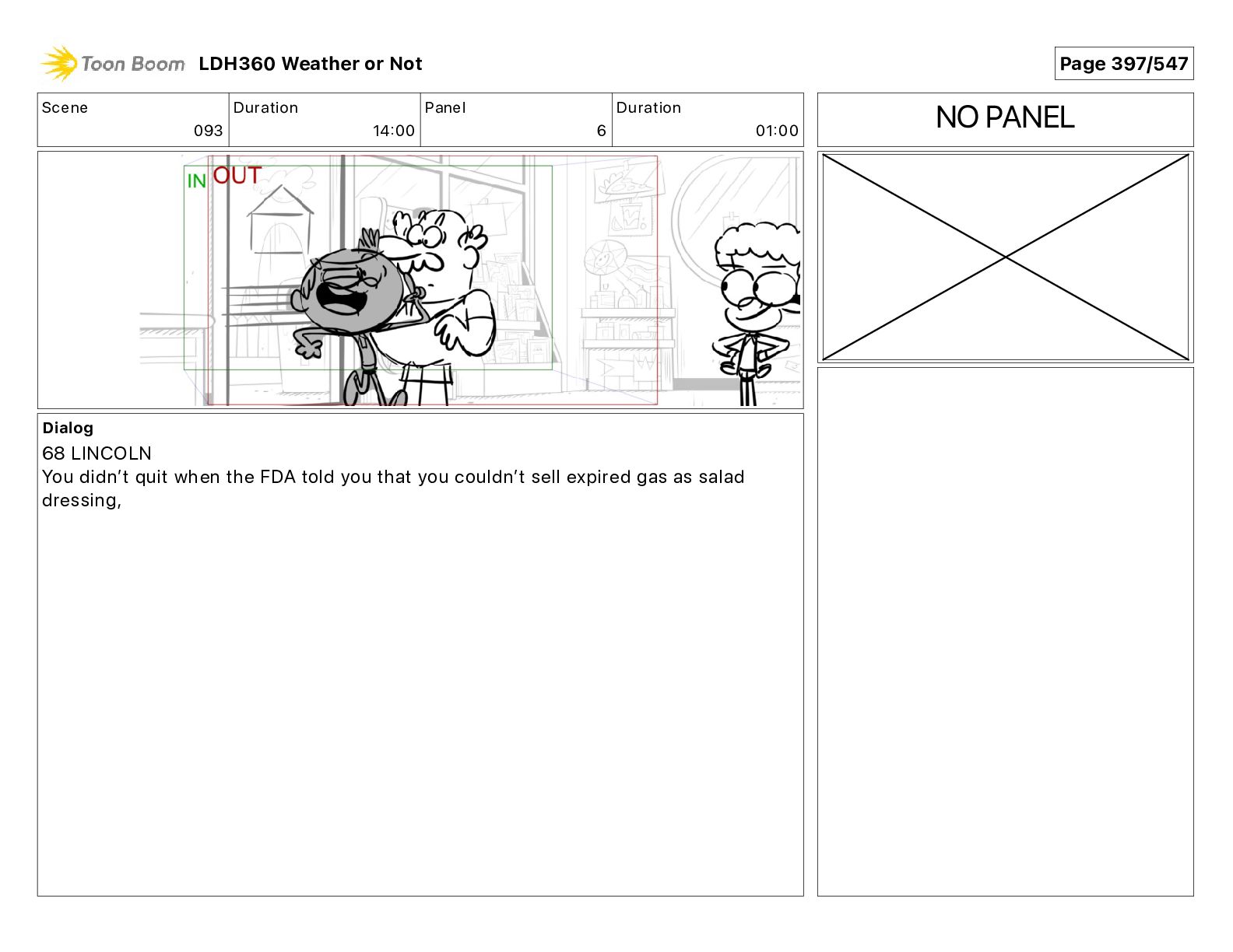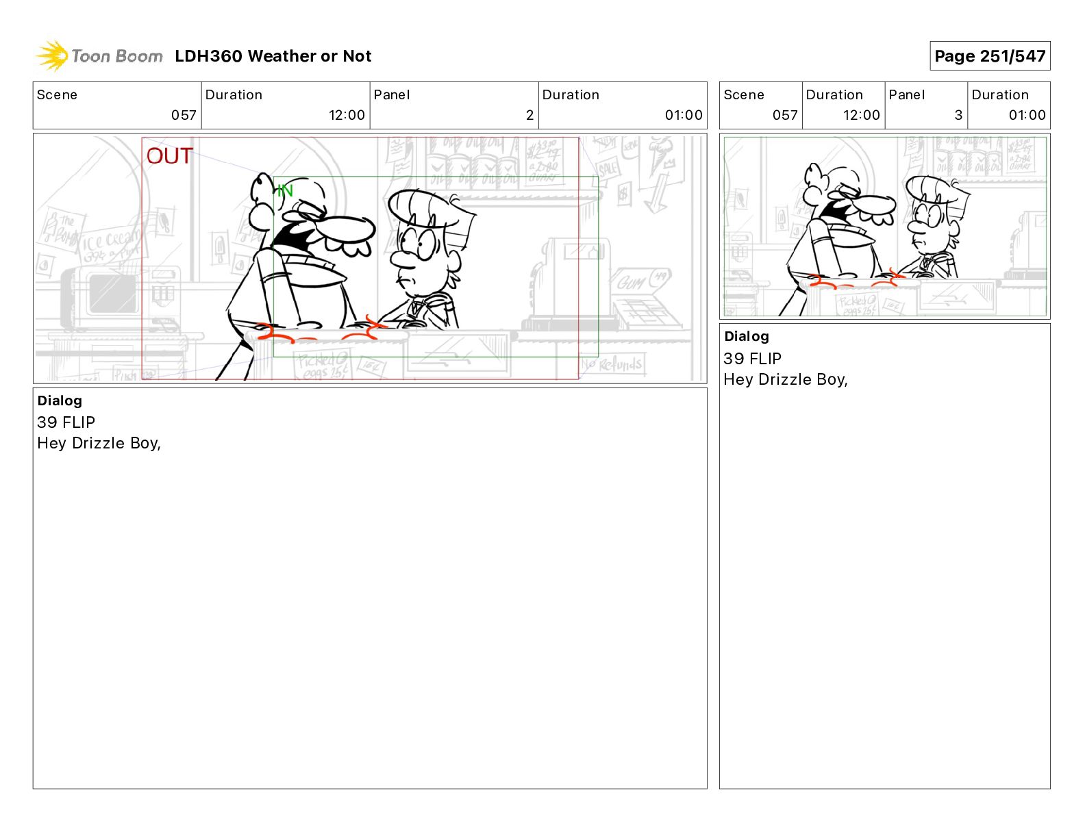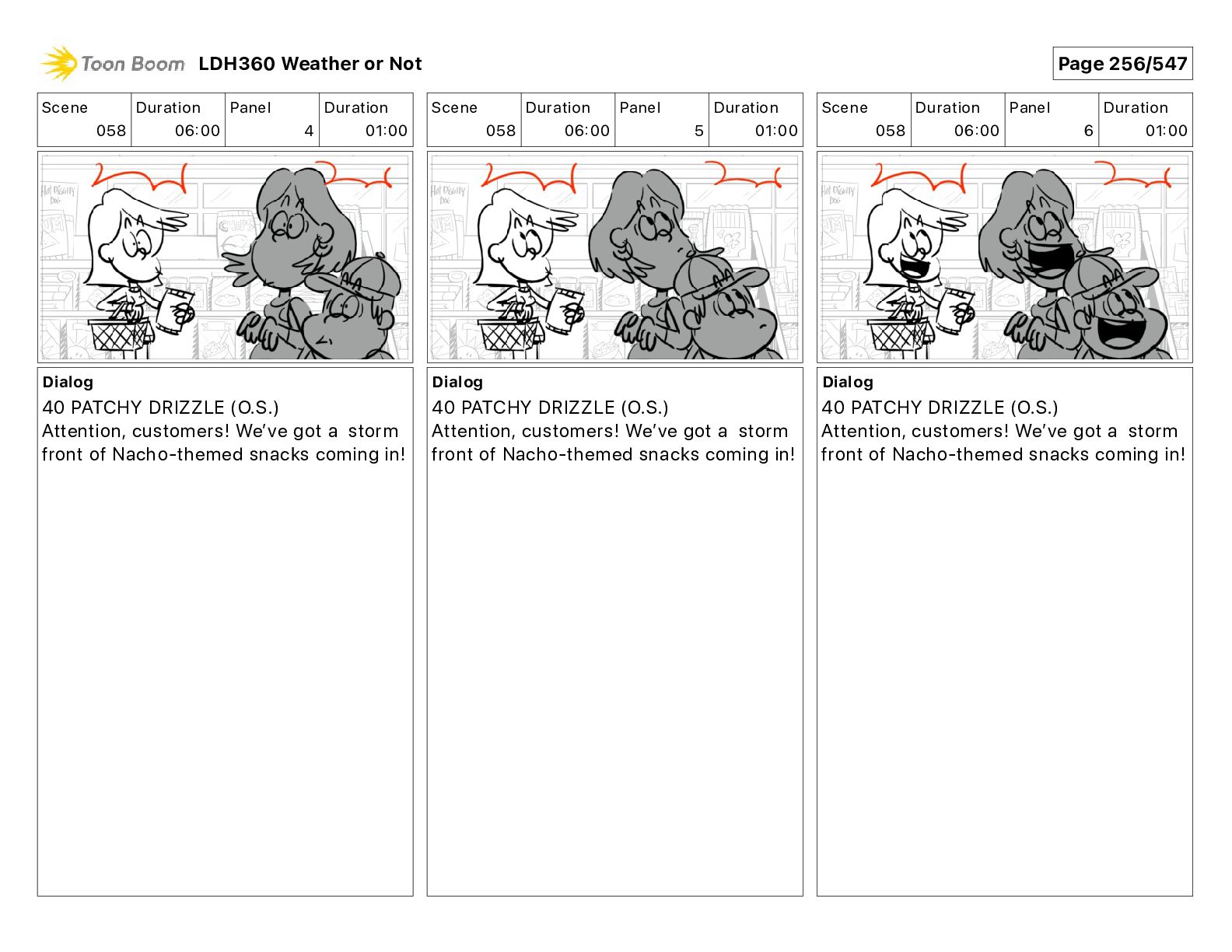 Dialog 7 FLIP I donʼt care. Scene 012 Duration 16 00 Panel 15 Duration 01 00 Dialog 8 LINCOLN We need some advice. Scene 012 Duration 16 00 Panel 16 Duration 01 00 LDH360 Weather or Not Page 56/547