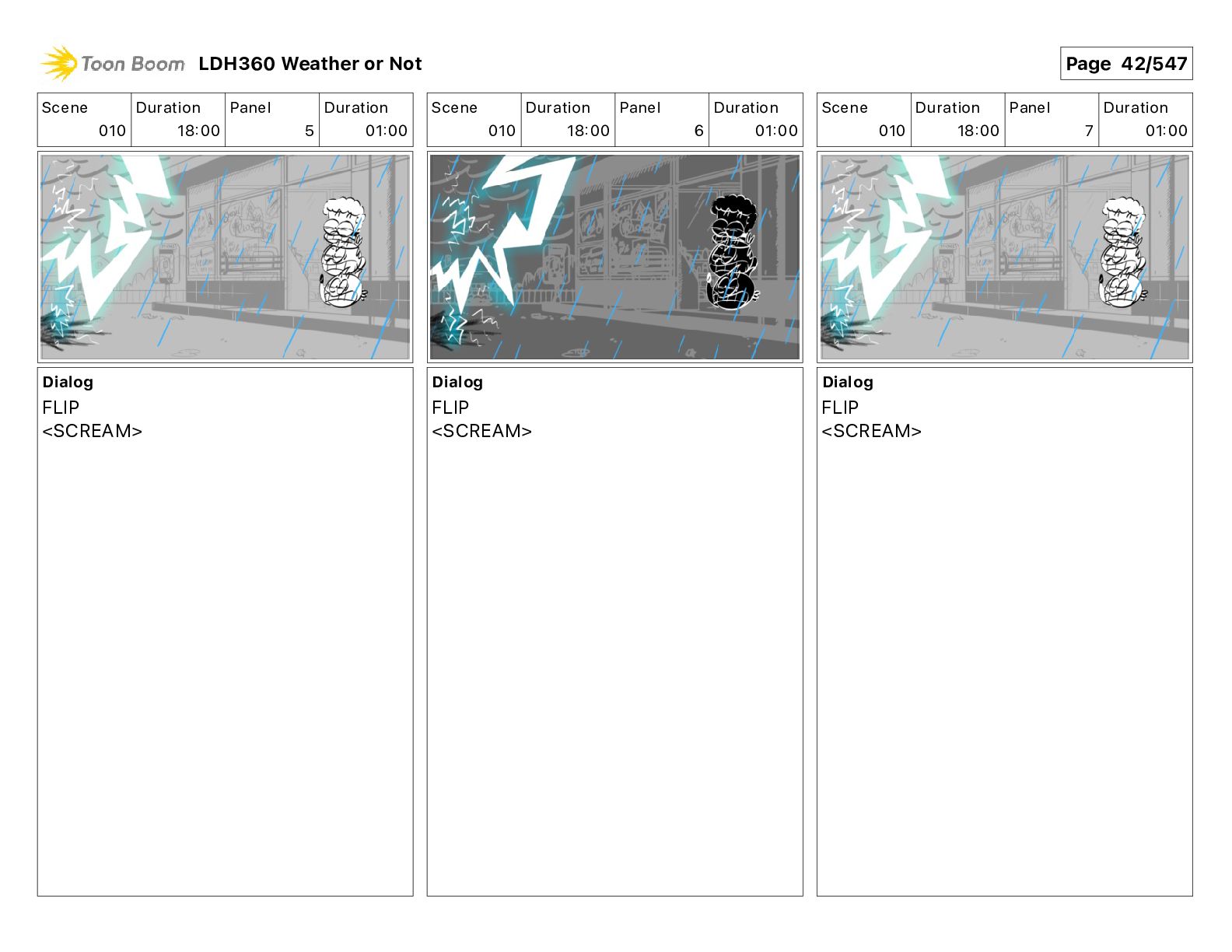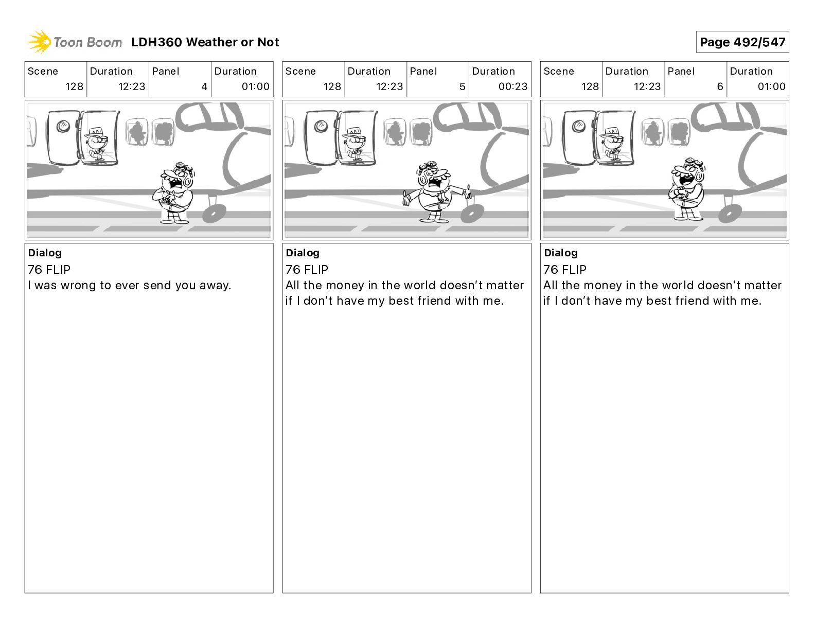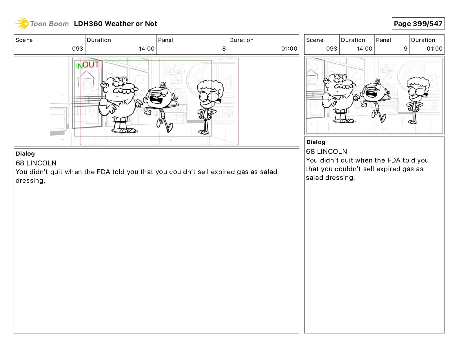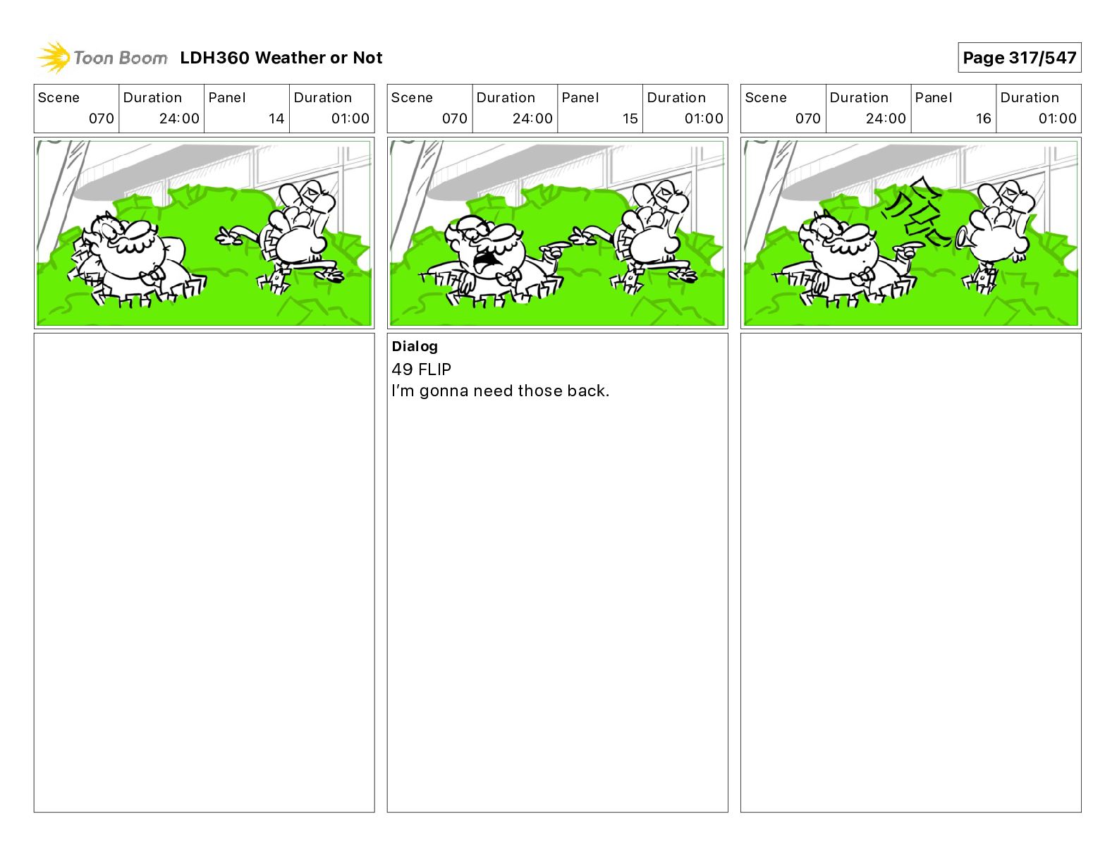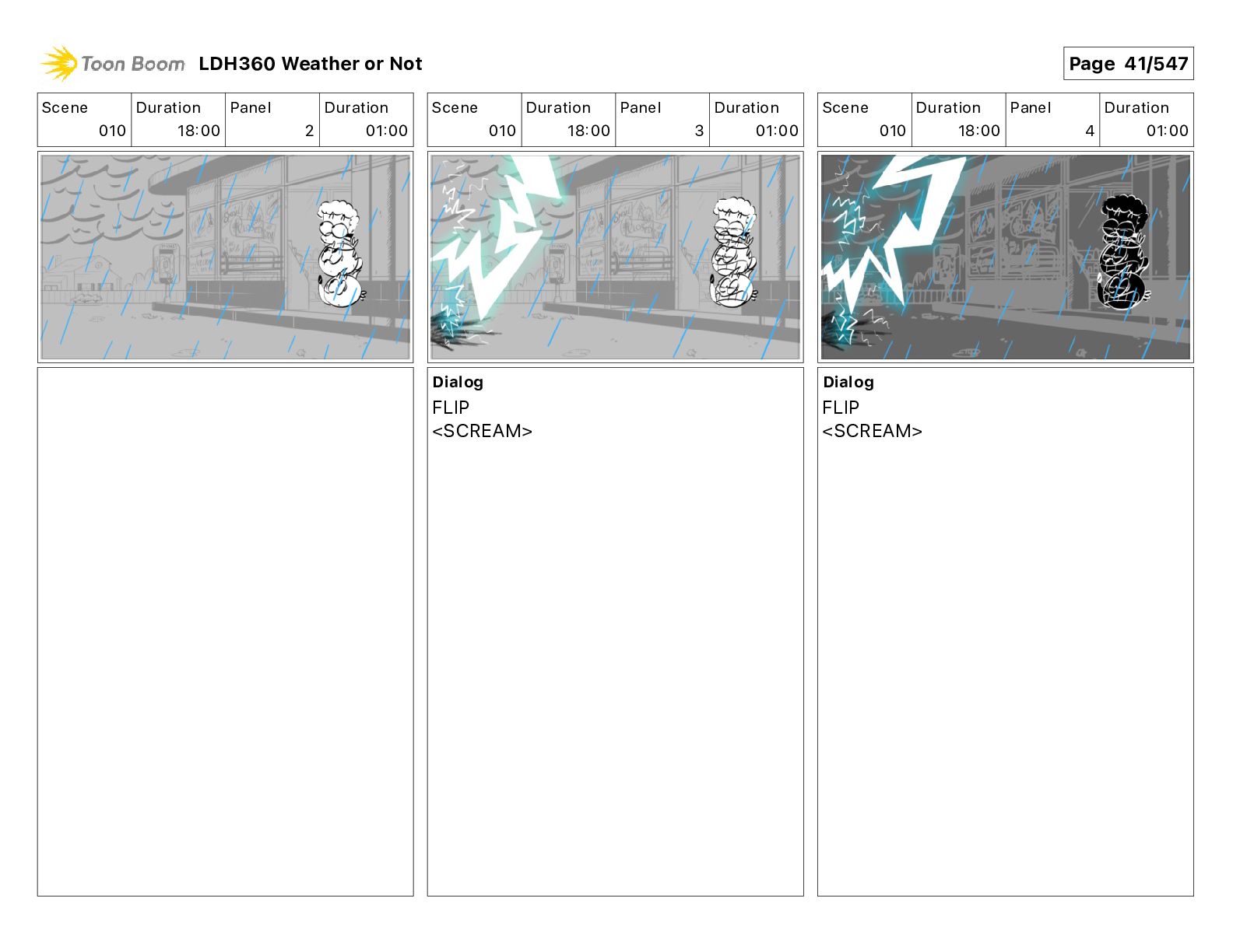 Dialog 7 FLIP I donʼt care. Scene 012 Duration 16 00 Panel 15 Duration 01 00 Dialog 8 LINCOLN We need some advice. Scene 012 Duration 16 00 Panel 16 Duration 01 00 LDH360 Weather or Not Page 56/547
