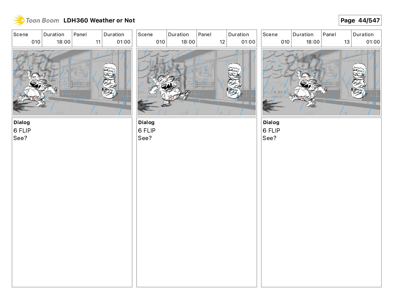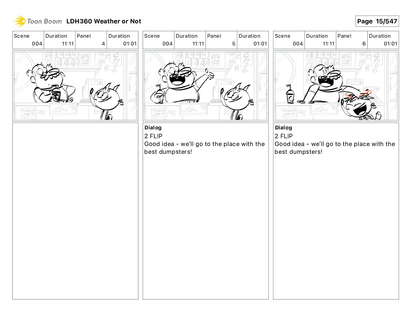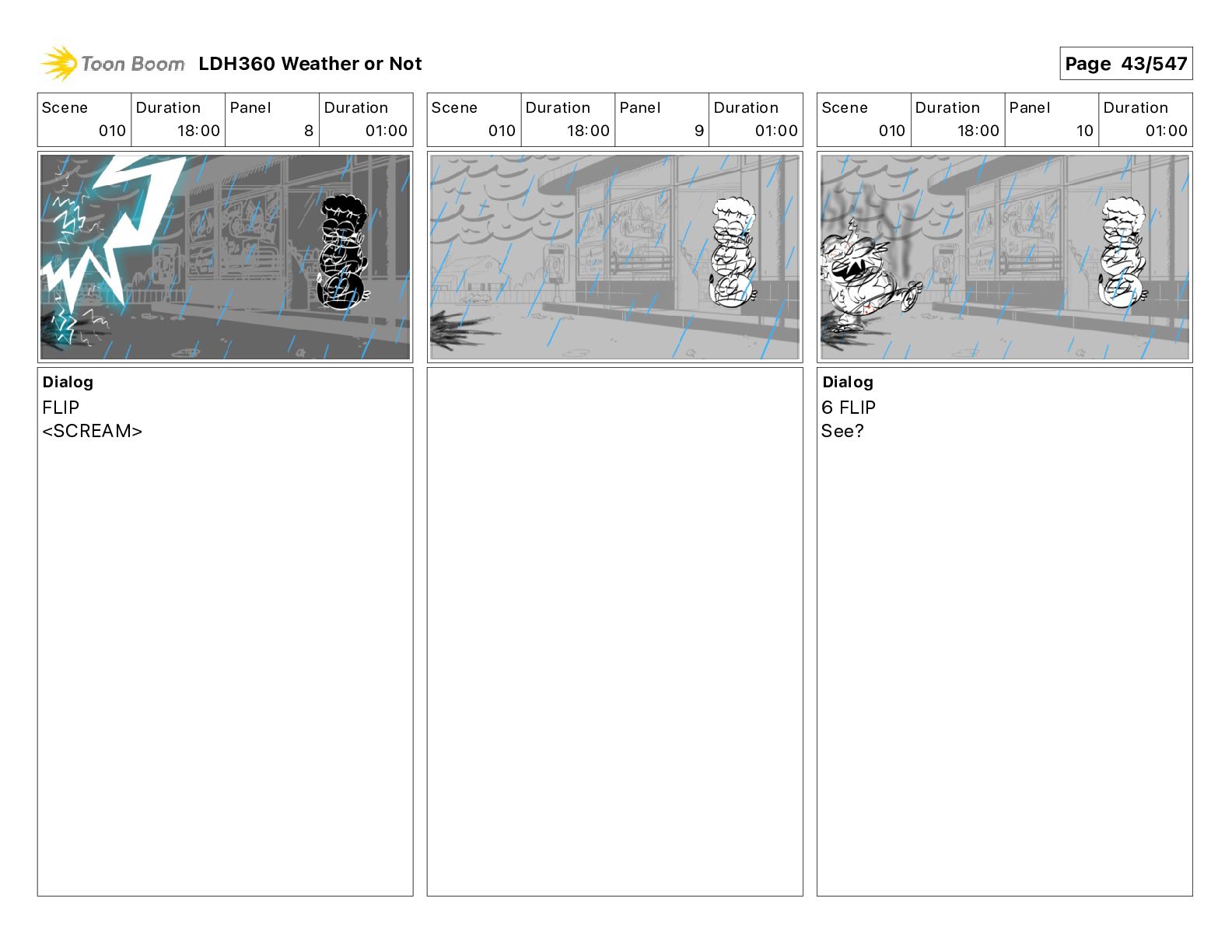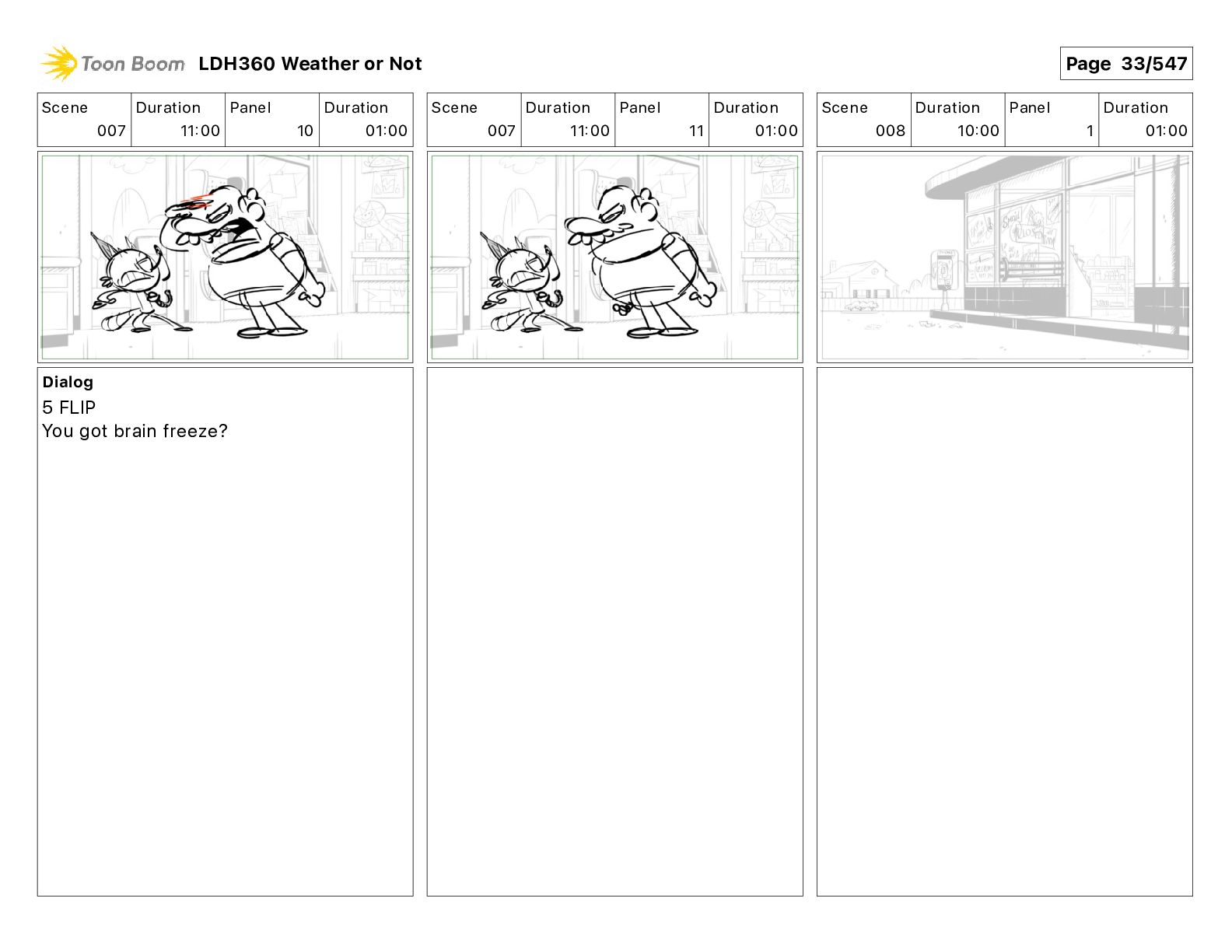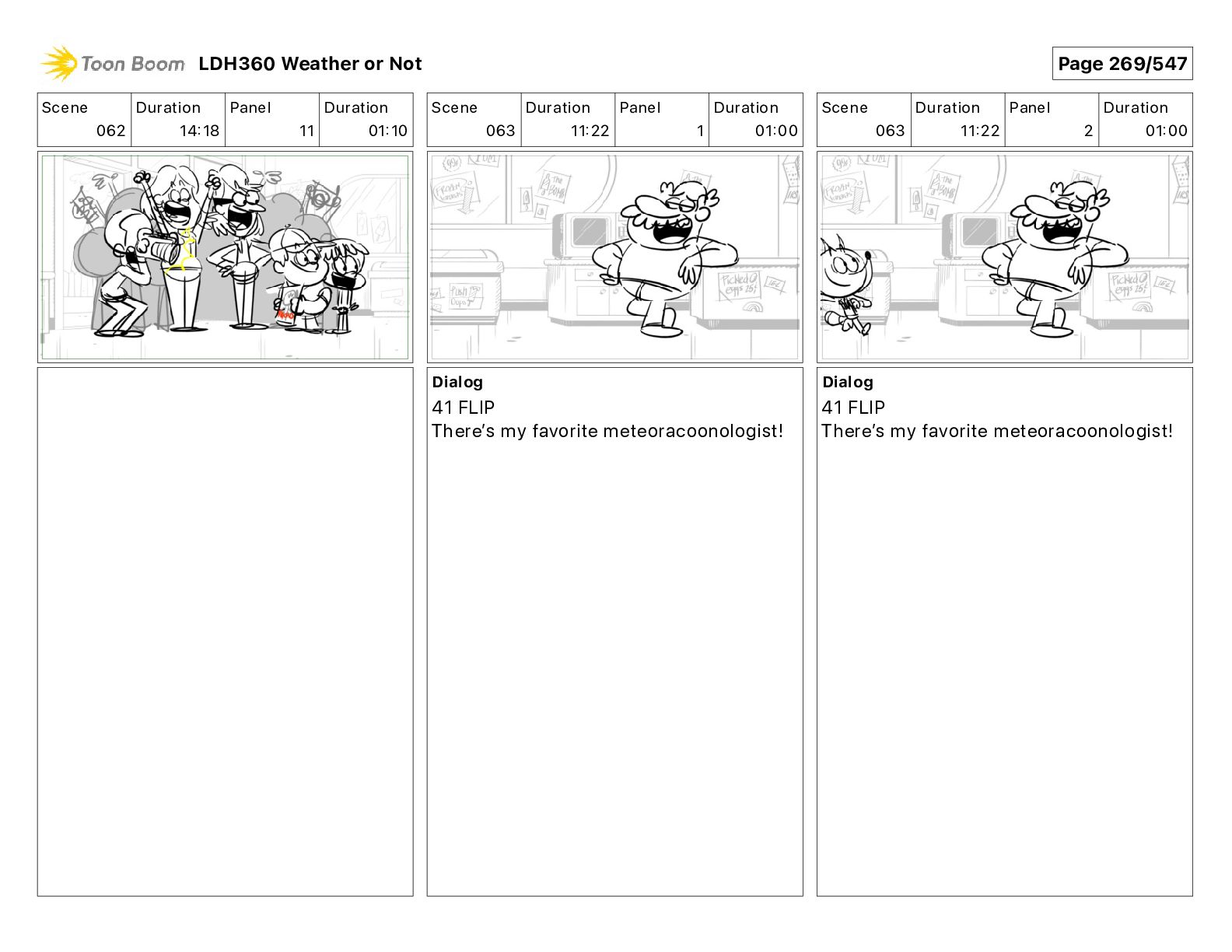 Dialog 7 FLIP I donʼt care. Scene 012 Duration 16 00 Panel 15 Duration 01 00 Dialog 8 LINCOLN We need some advice. Scene 012 Duration 16 00 Panel 16 Duration 01 00 LDH360 Weather or Not Page 56/547