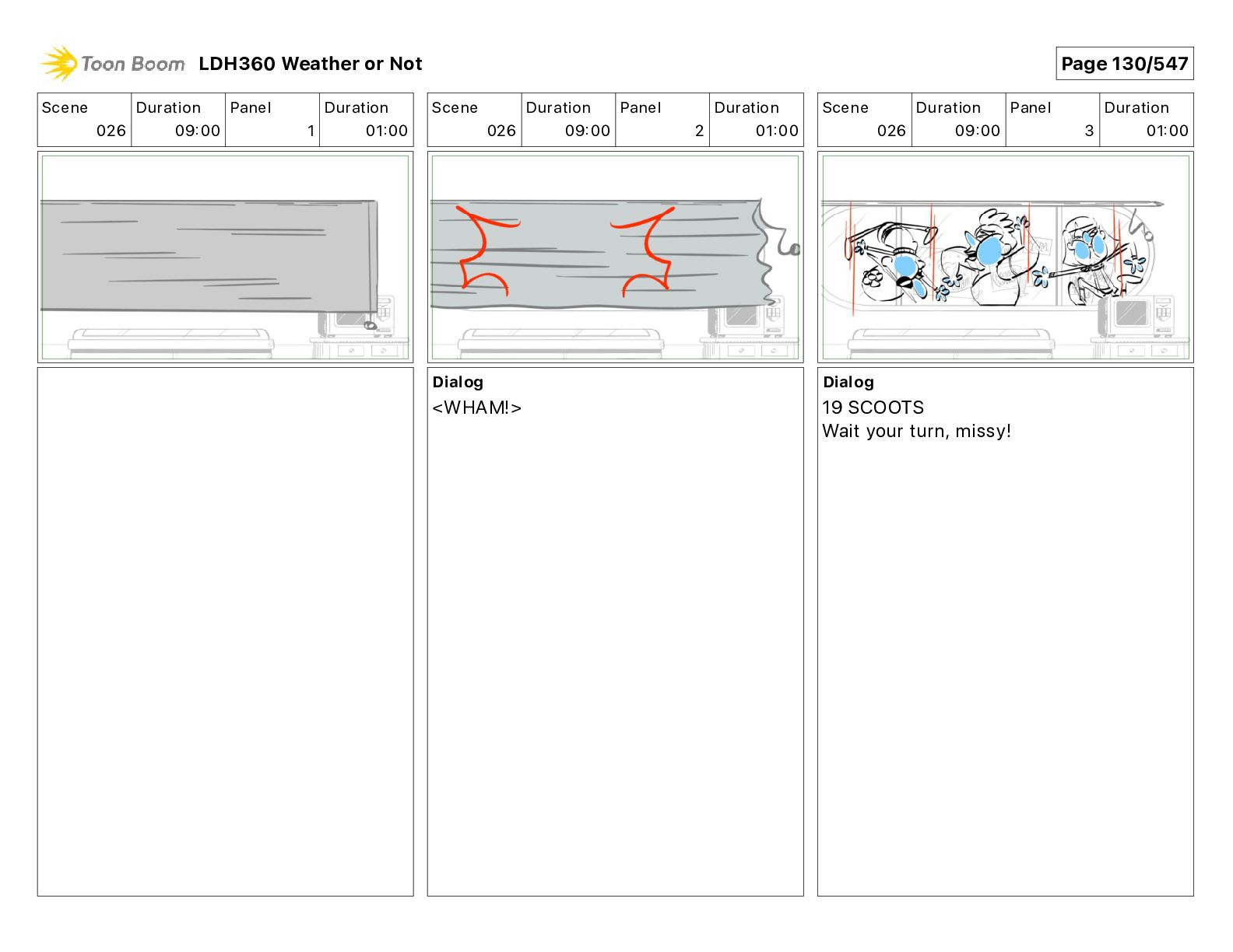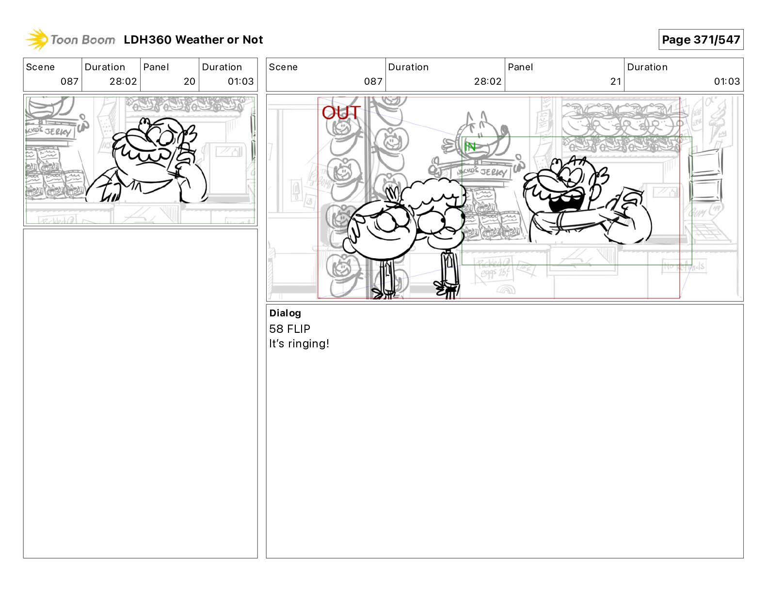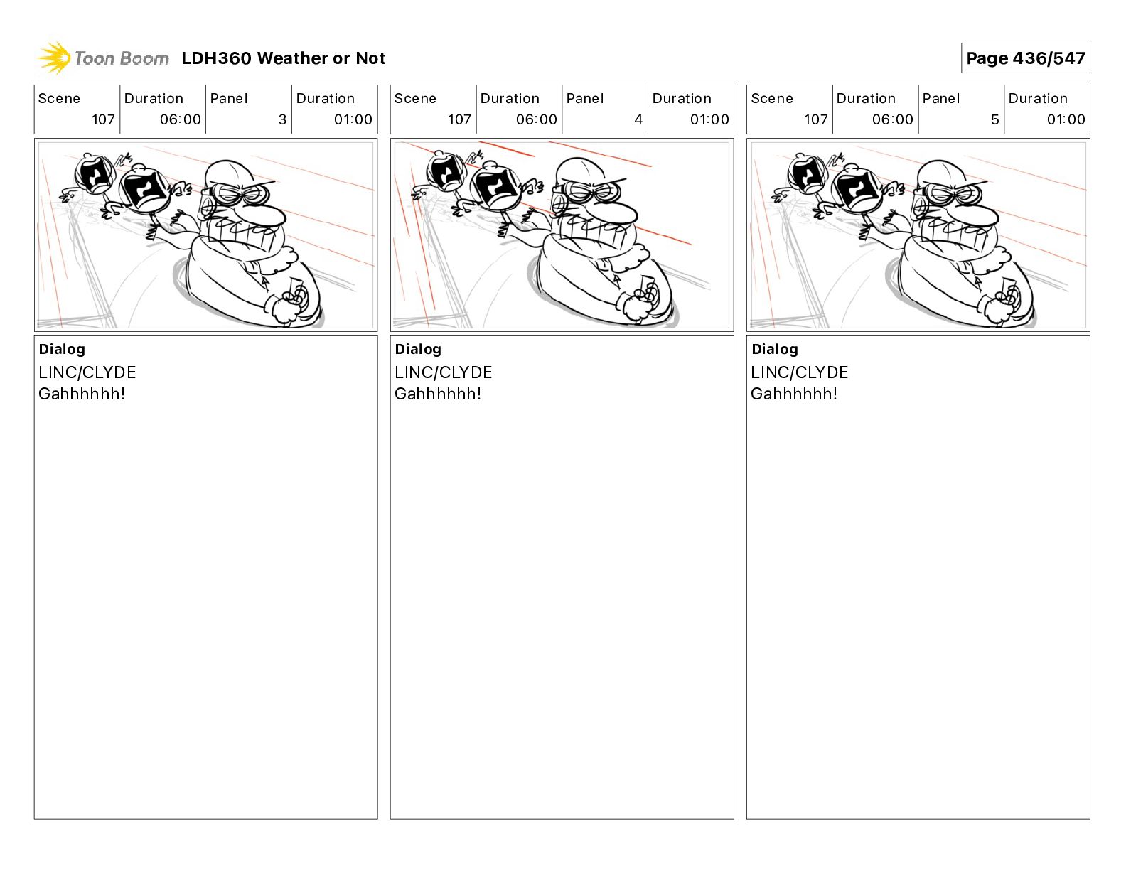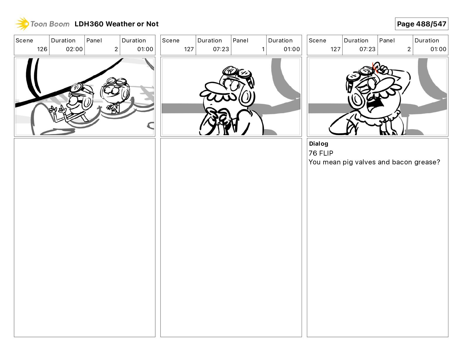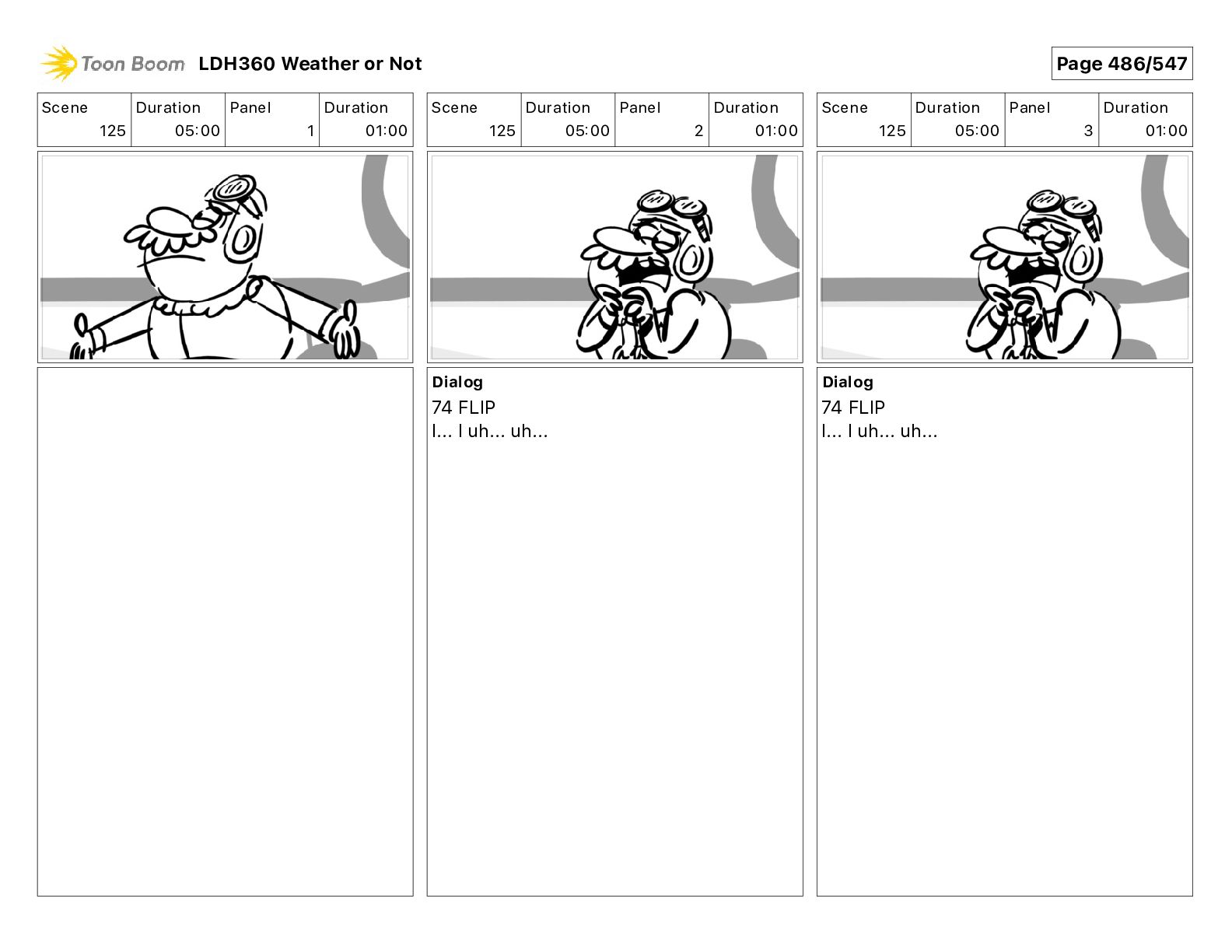 Dialog 7 FLIP I donʼt care. Scene 012 Duration 16 00 Panel 15 Duration 01 00 Dialog 8 LINCOLN We need some advice. Scene 012 Duration 16 00 Panel 16 Duration 01 00 LDH360 Weather or Not Page 56/547