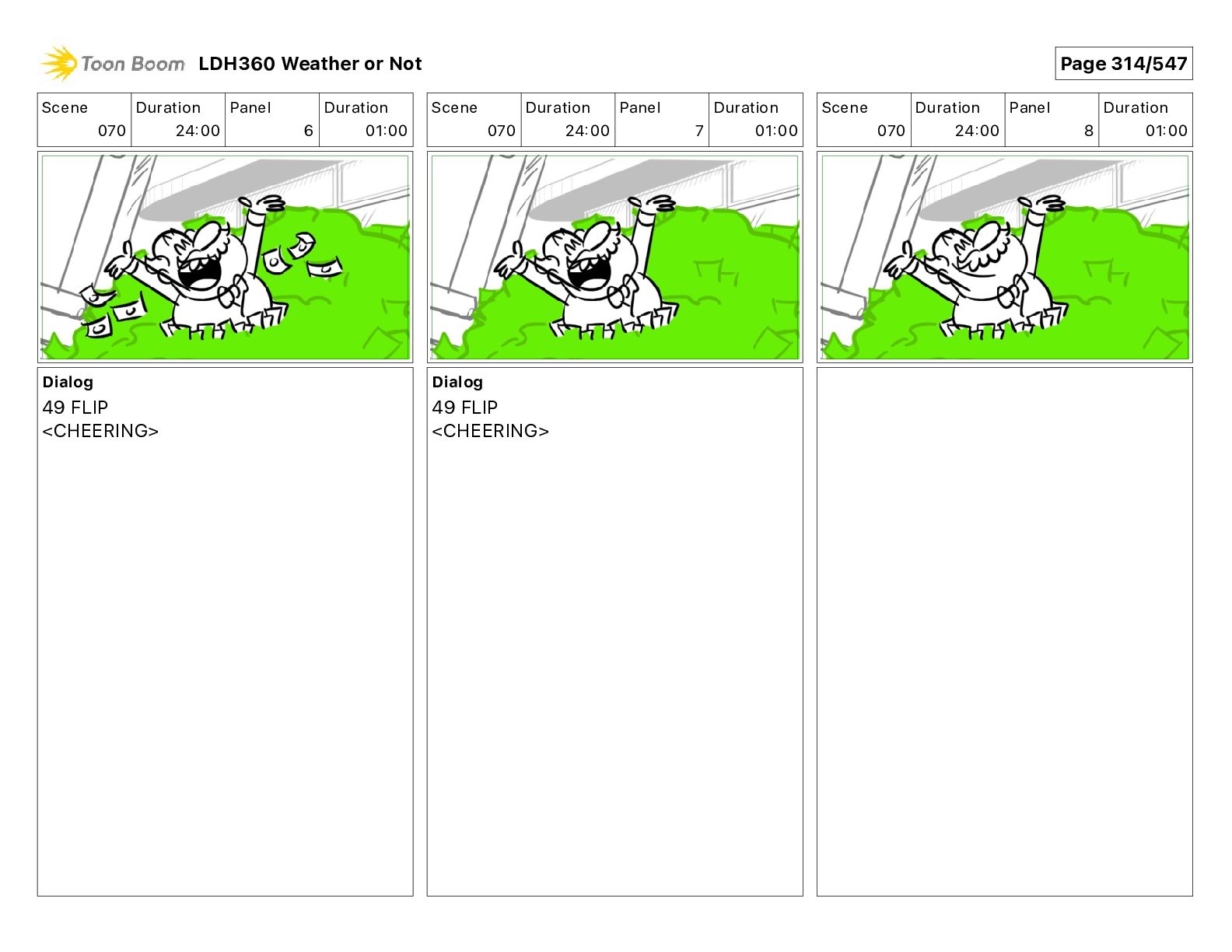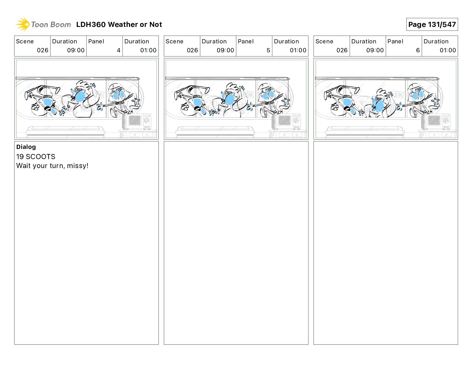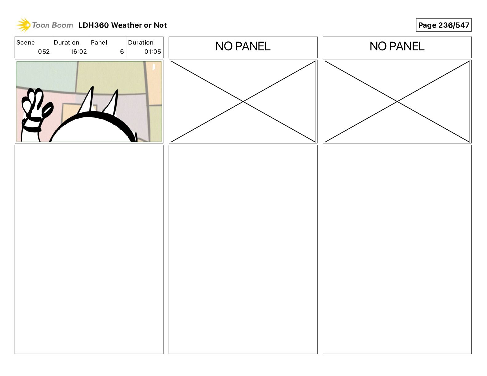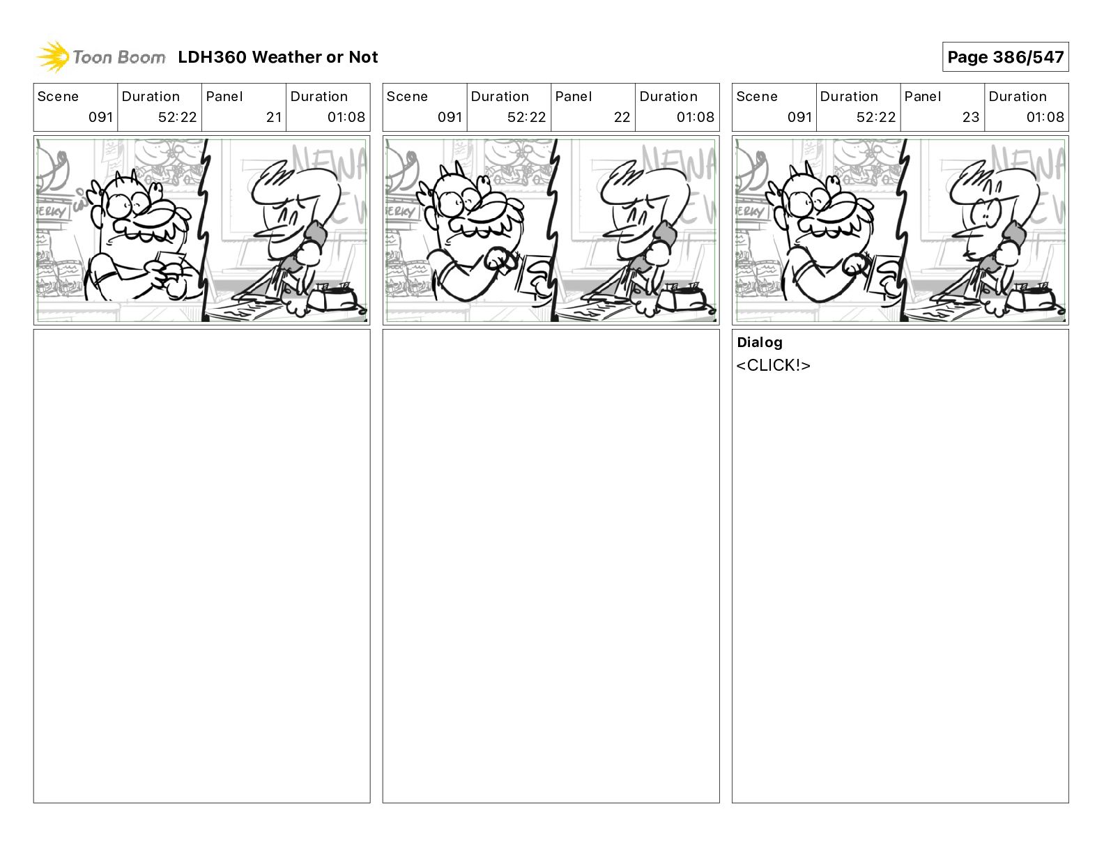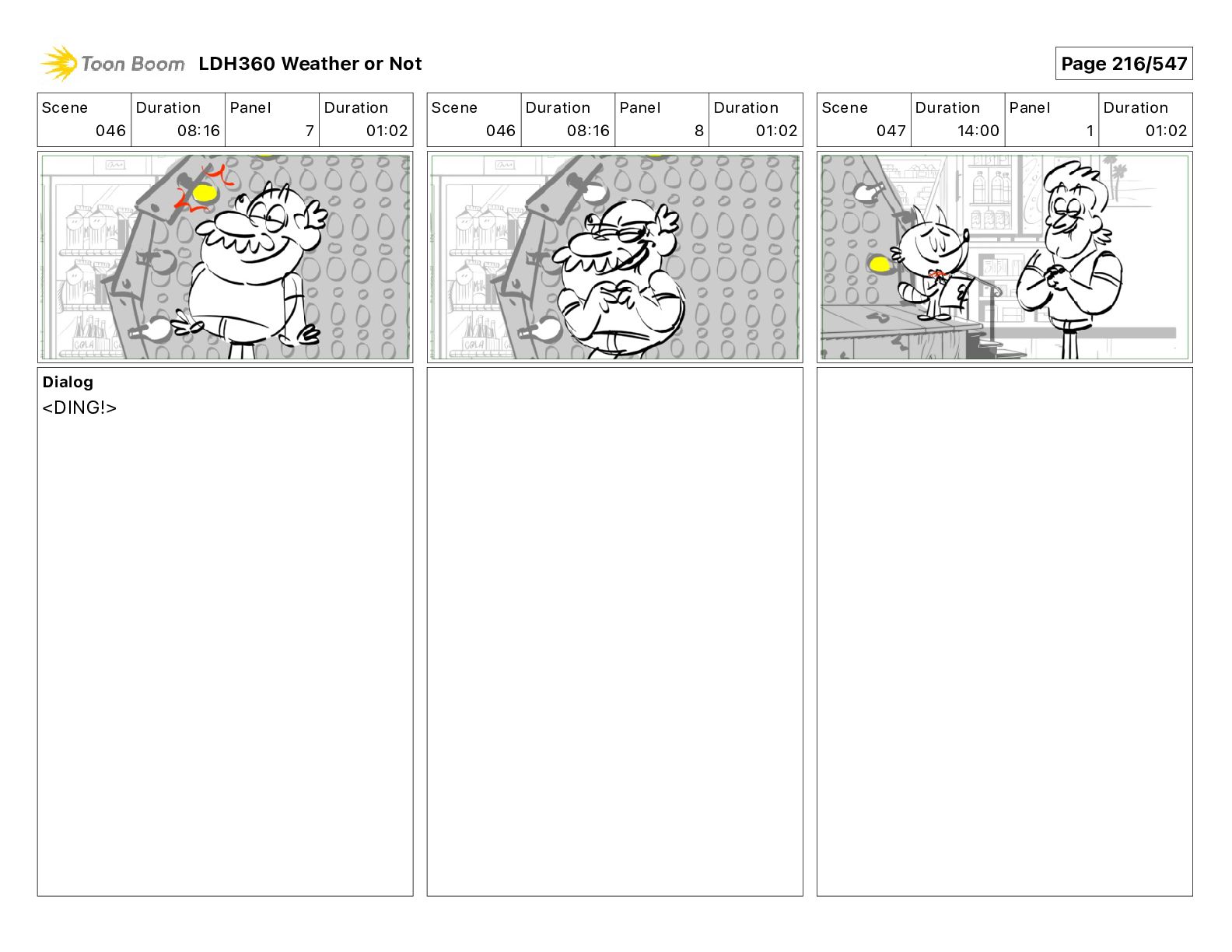 Dialog 7 FLIP I donʼt care. Scene 012 Duration 16 00 Panel 15 Duration 01 00 Dialog 8 LINCOLN We need some advice. Scene 012 Duration 16 00 Panel 16 Duration 01 00 LDH360 Weather or Not Page 56/547