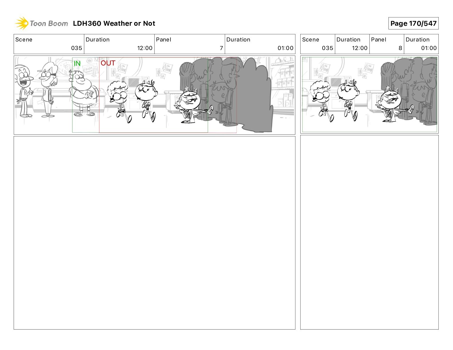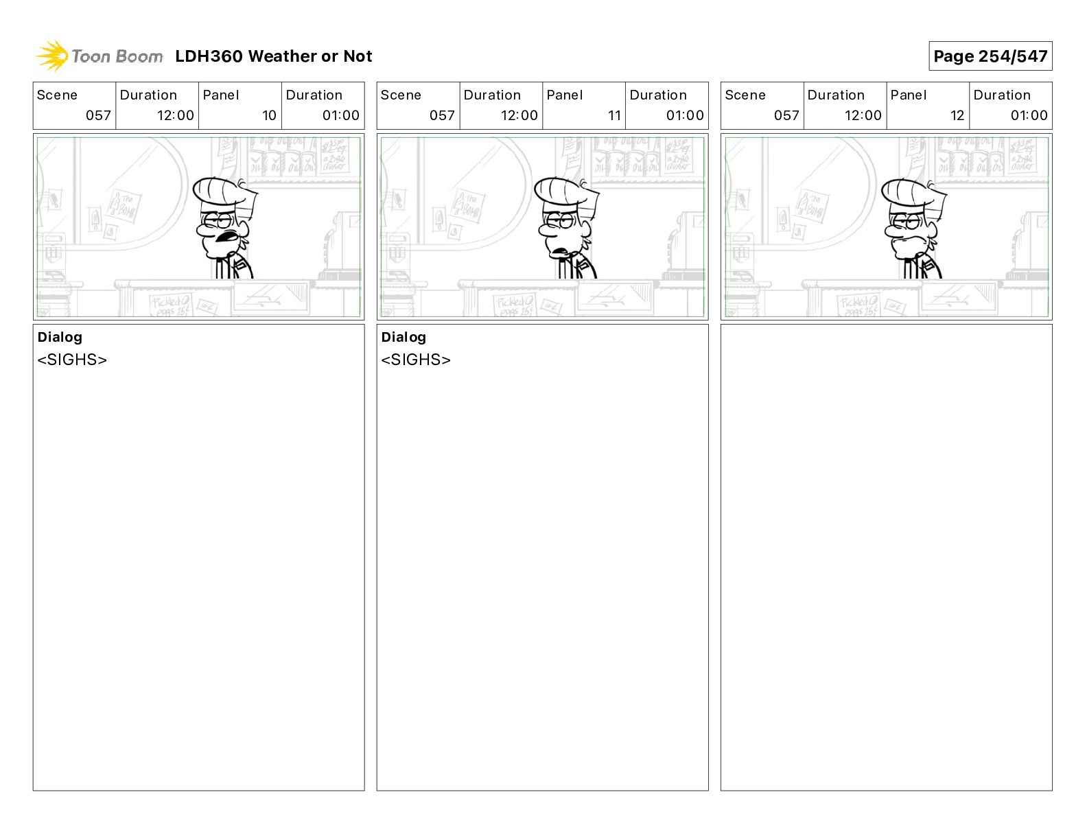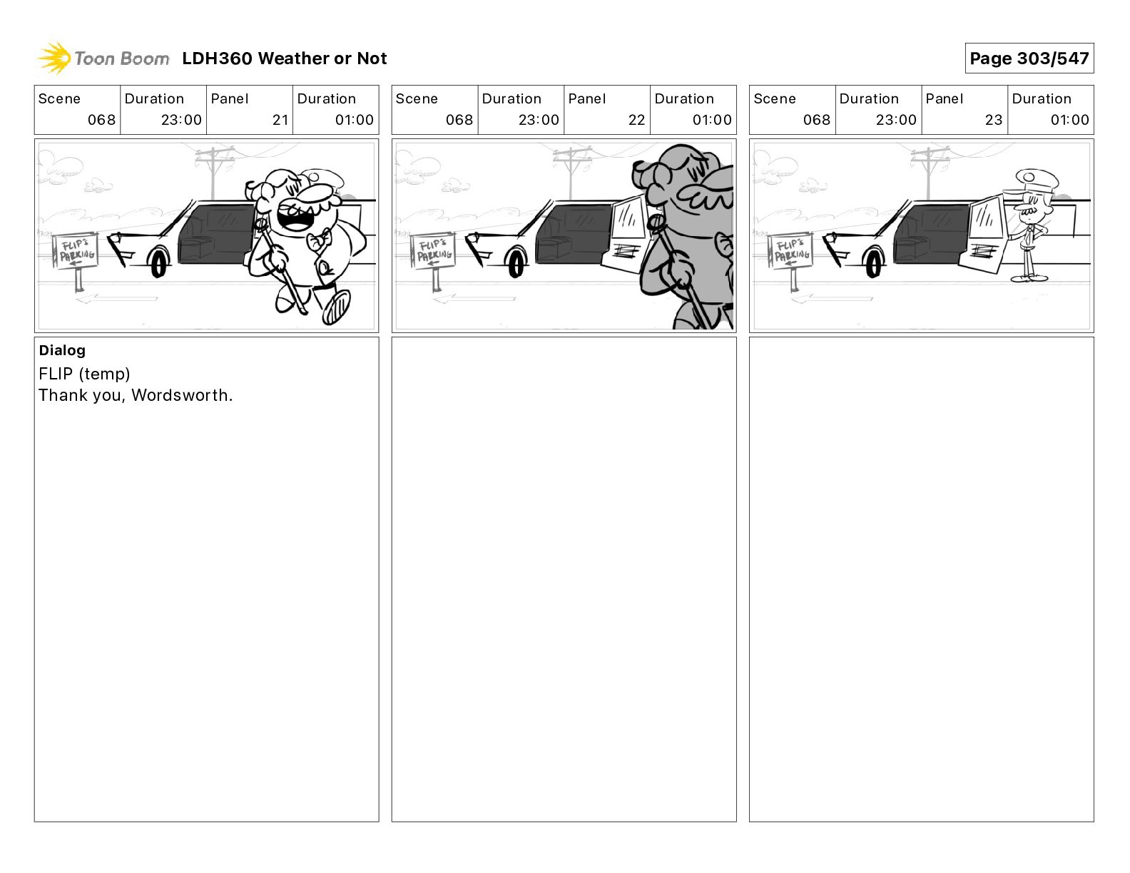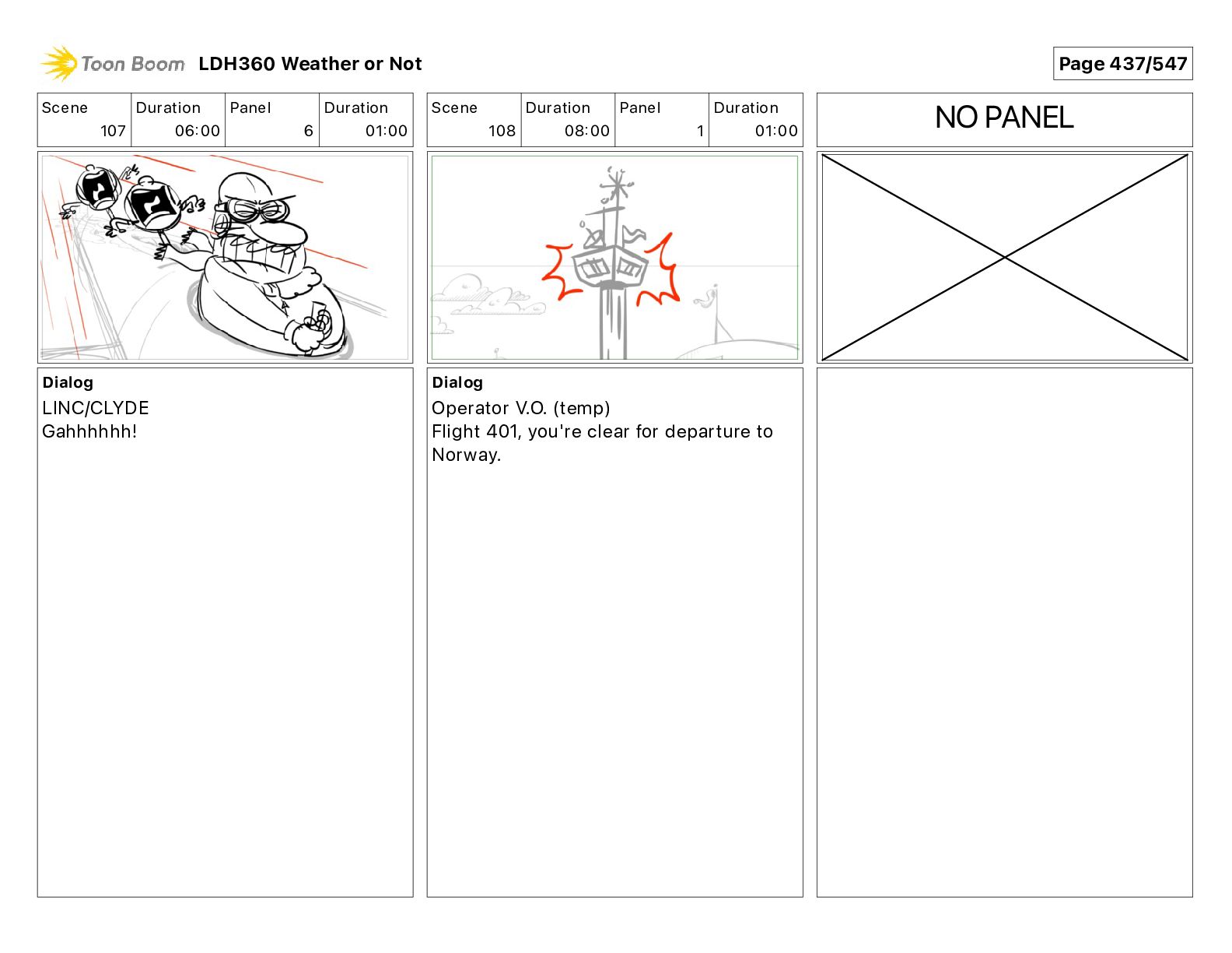 Dialog 7 FLIP I donʼt care. Scene 012 Duration 16 00 Panel 15 Duration 01 00 Dialog 8 LINCOLN We need some advice. Scene 012 Duration 16 00 Panel 16 Duration 01 00 LDH360 Weather or Not Page 56/547