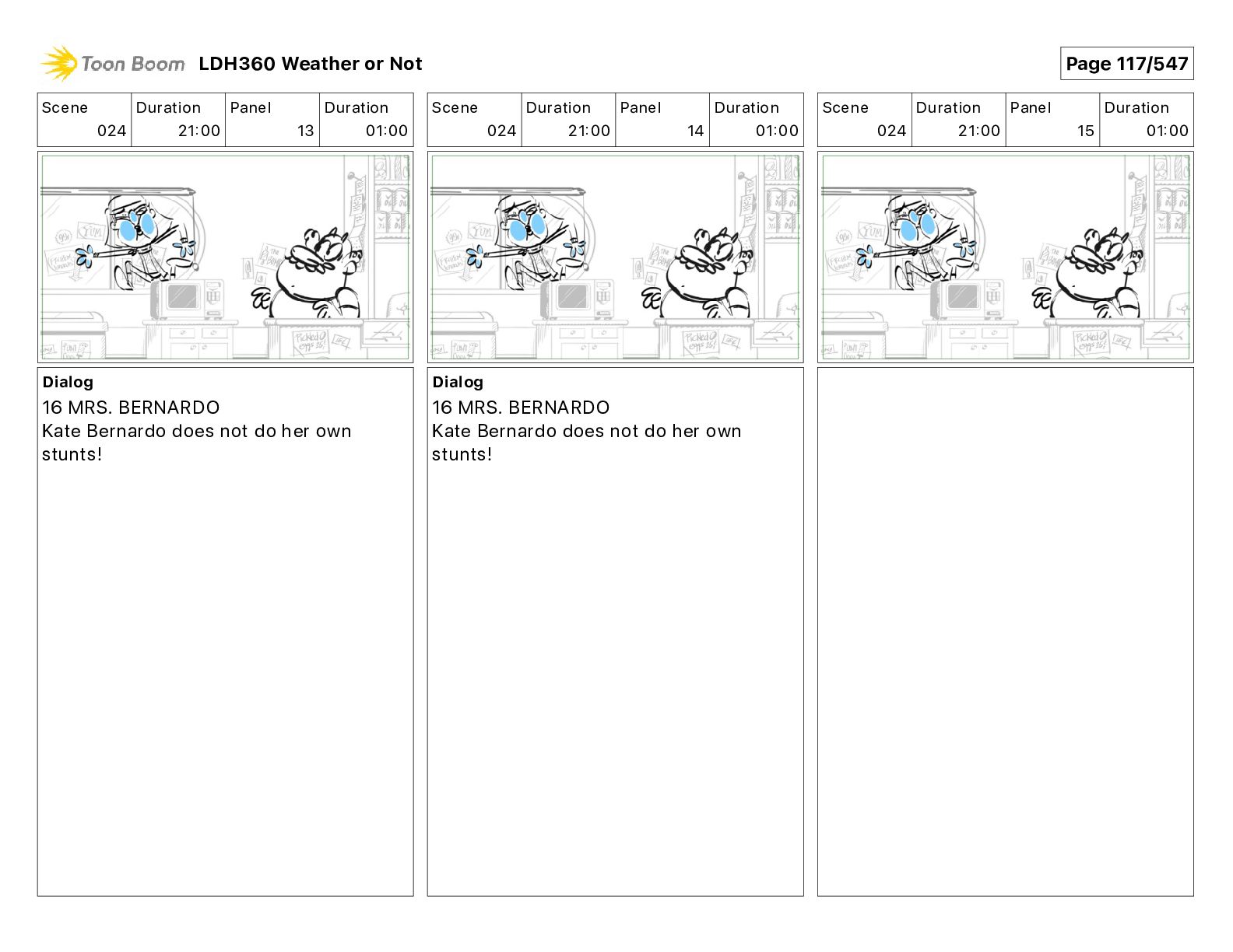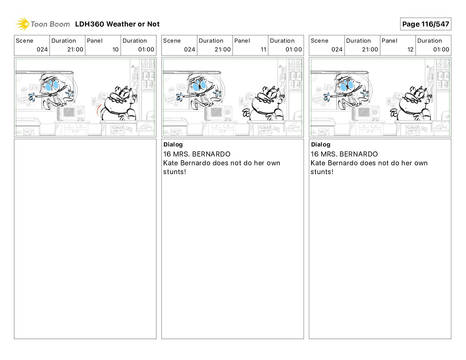 Scene 024 Duration 21 00 Panel 11 Duration 01 00 Dialog 16 MRS. BERNARDO Kate Bernardo does not do her own stunts! Scene 024 Duration 21 00 Panel 12 Duration 01 00 Dialog 16 MRS. BERNARDO Kate Bernardo does not do her own stunts! LDH360 Weather or Not Page 116/547
