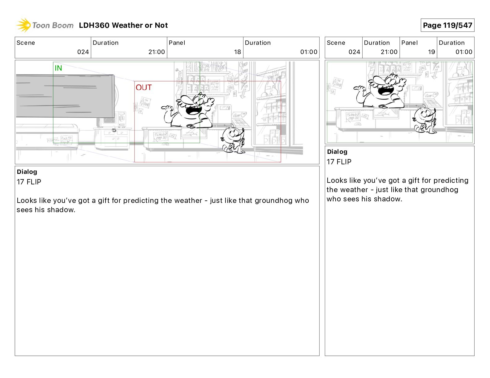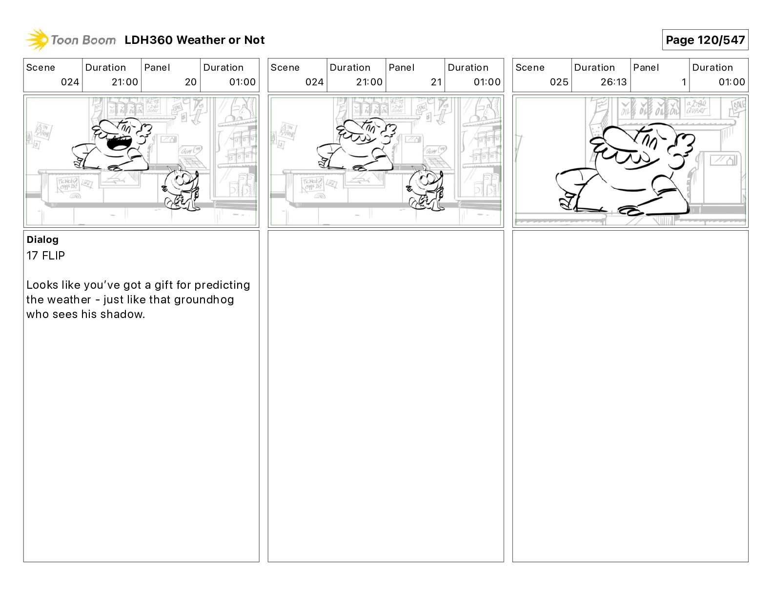 Dialog 17 FLIP Looks like youʼve got a gift for predicting the weather - just like that groundhog who sees his shadow. Scene 024 Duration 21 00 Panel 21 Duration 01 00 Scene 025 Duration 26 13 Panel 1 Duration 01 00 LDH360 Weather or Not Page 120/547