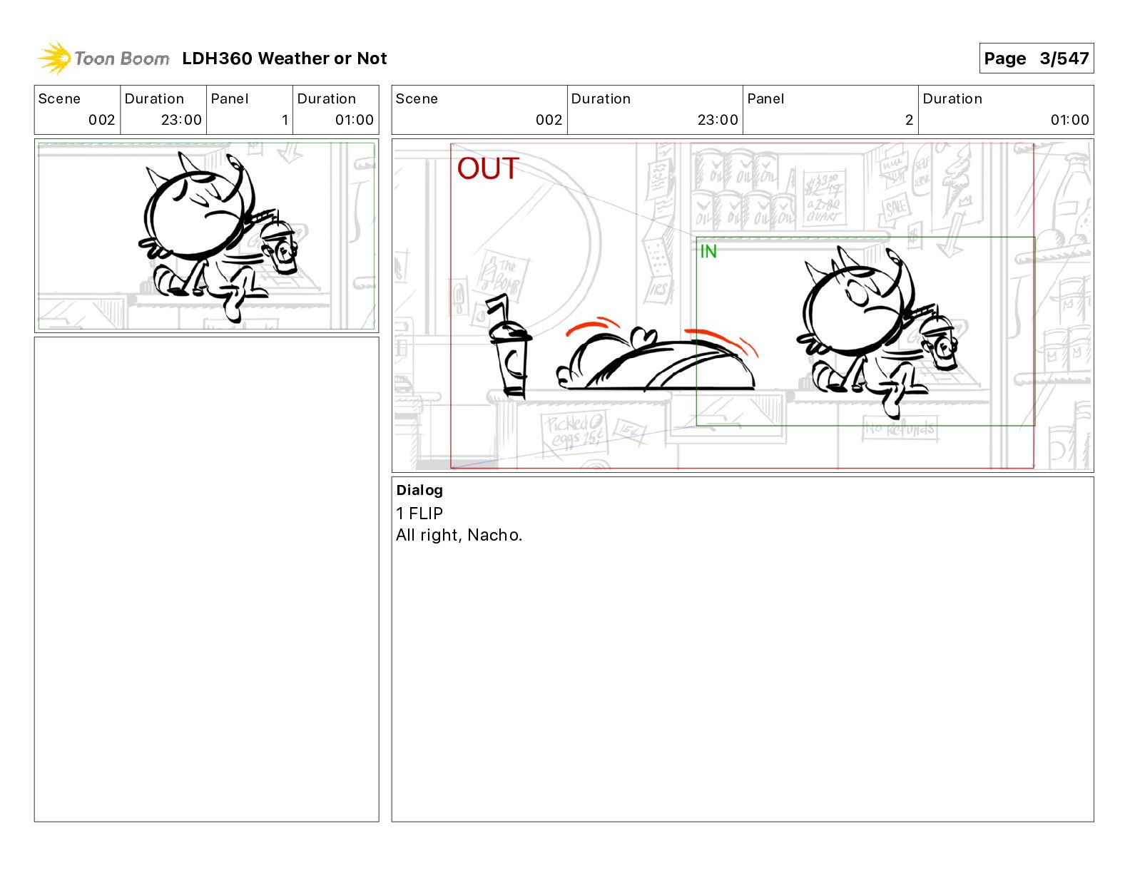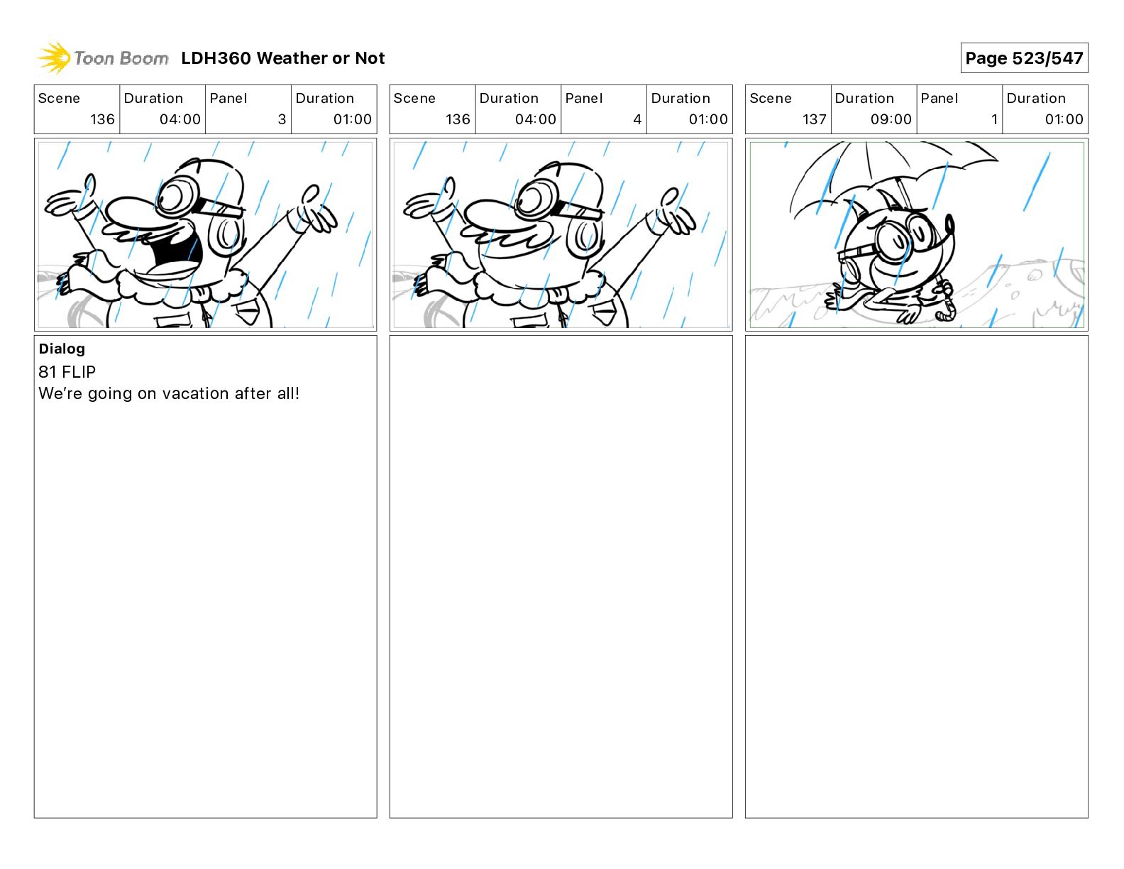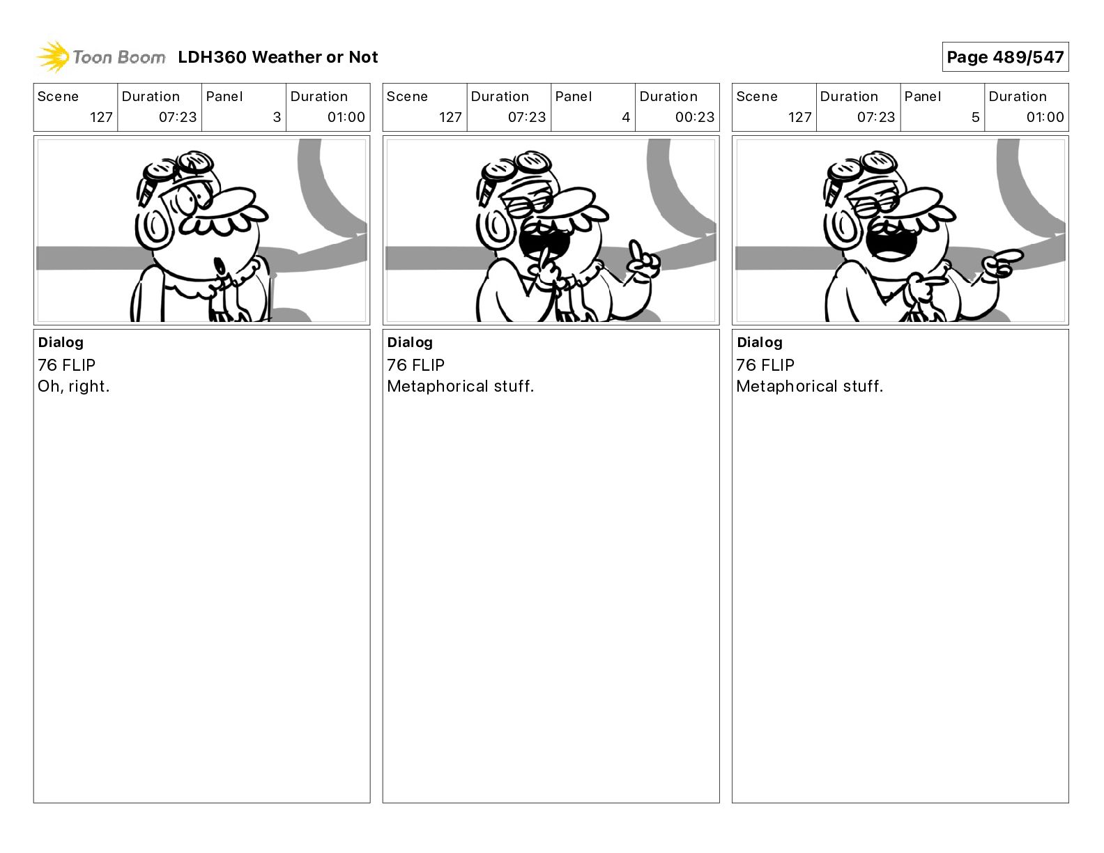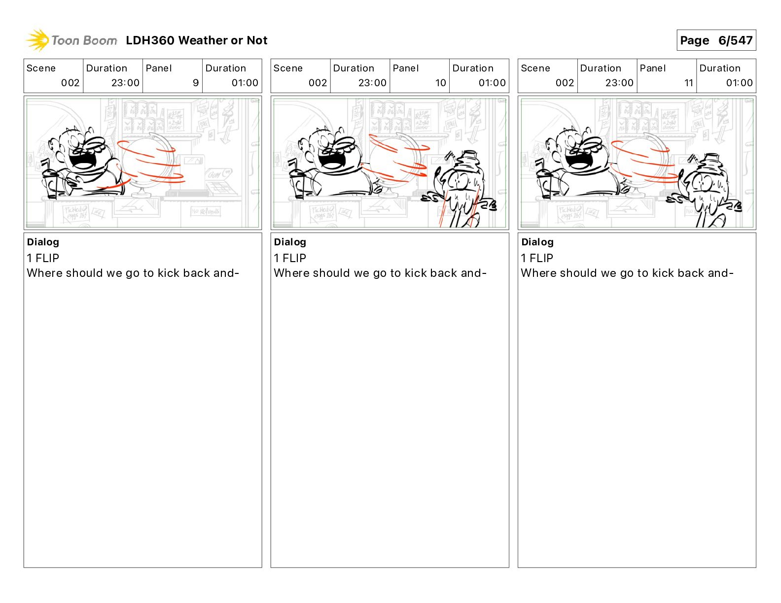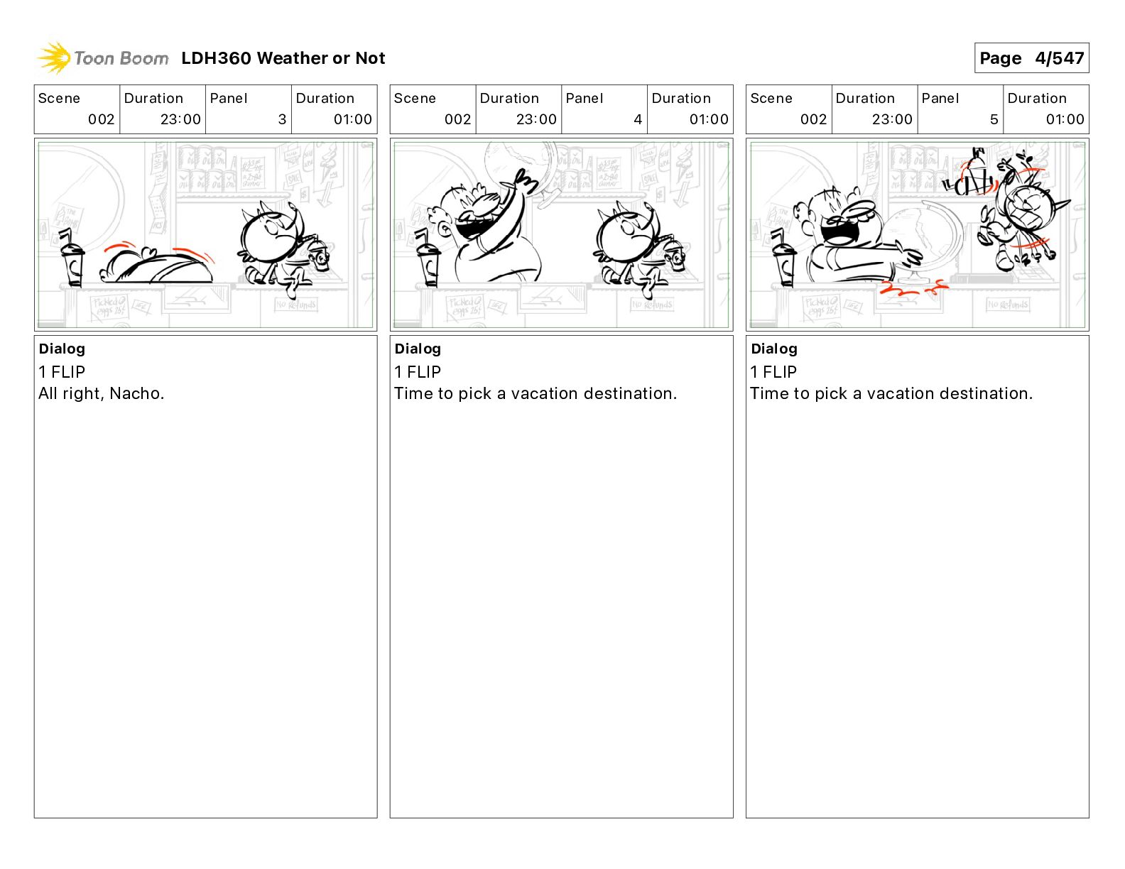Dialog 1 FLIP All right, Nacho. Scene 002 Duration 23 00 Panel 4 Duration 01 00 Dialog 1 FLIP Time to pick a vacation destination. Scene 002 Duration 23 00 Panel 5 Duration 01 00 Dialog 1 FLIP Time to pick a vacation destination. LDH360 Weather or Not Page 4/547