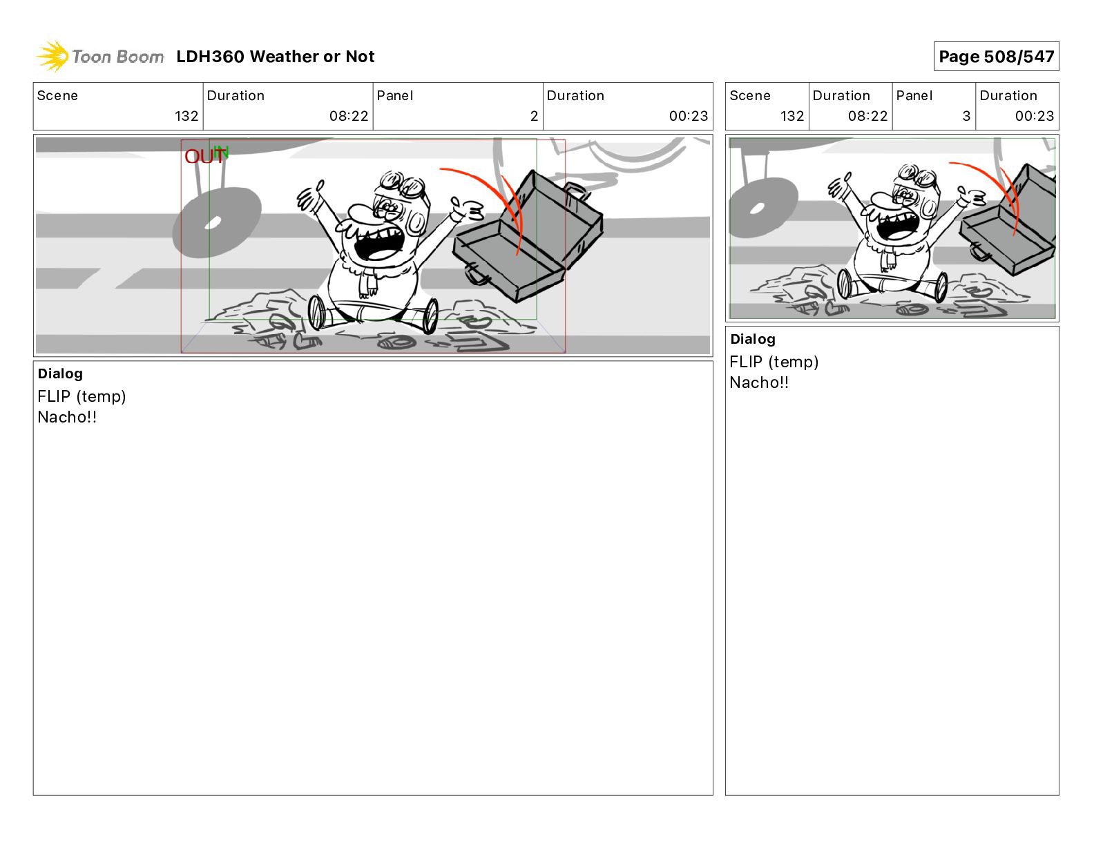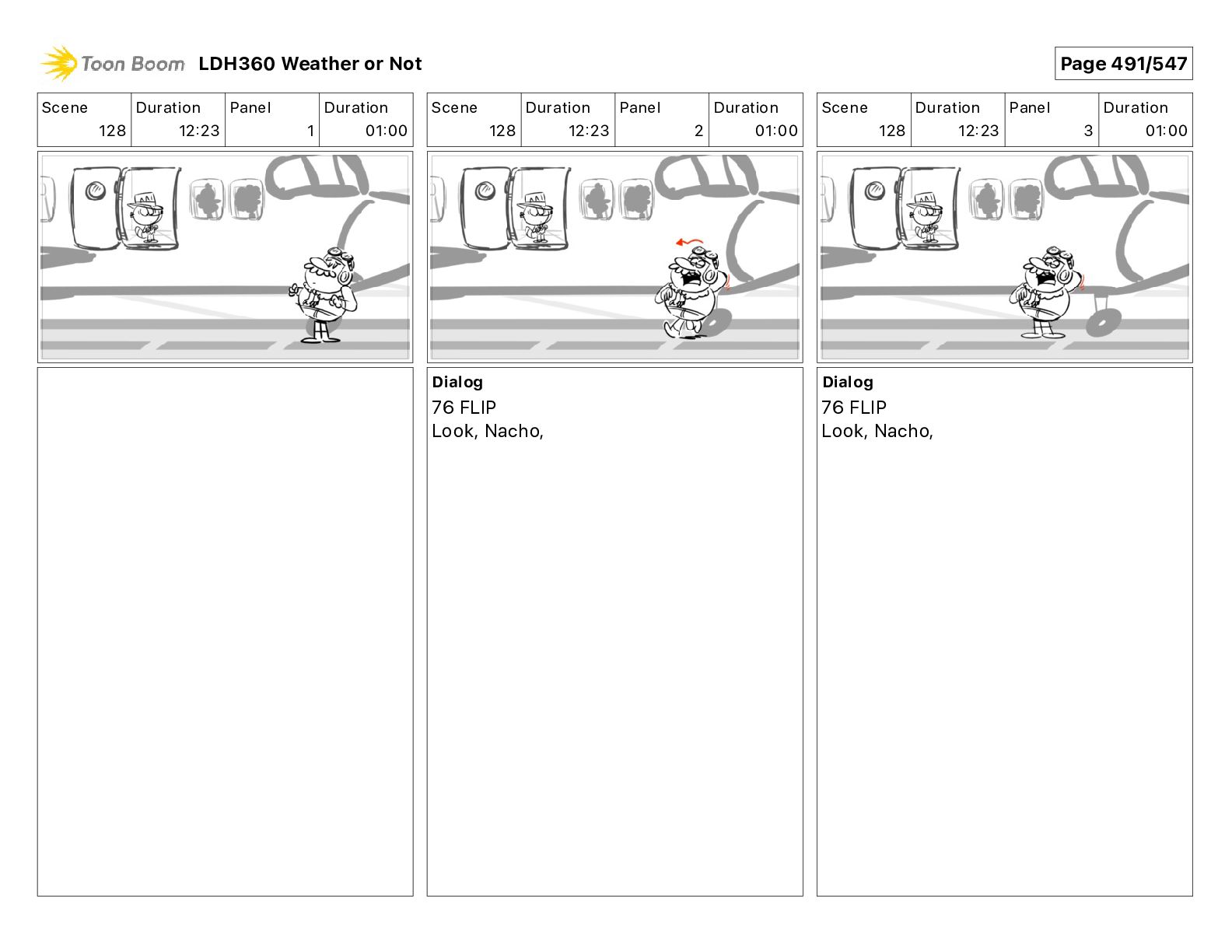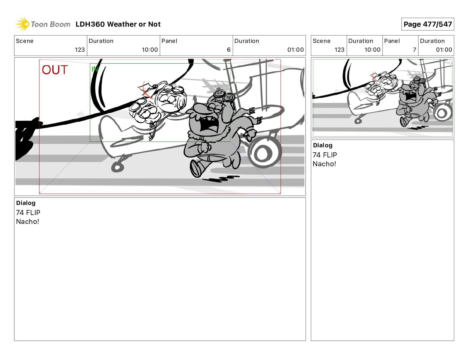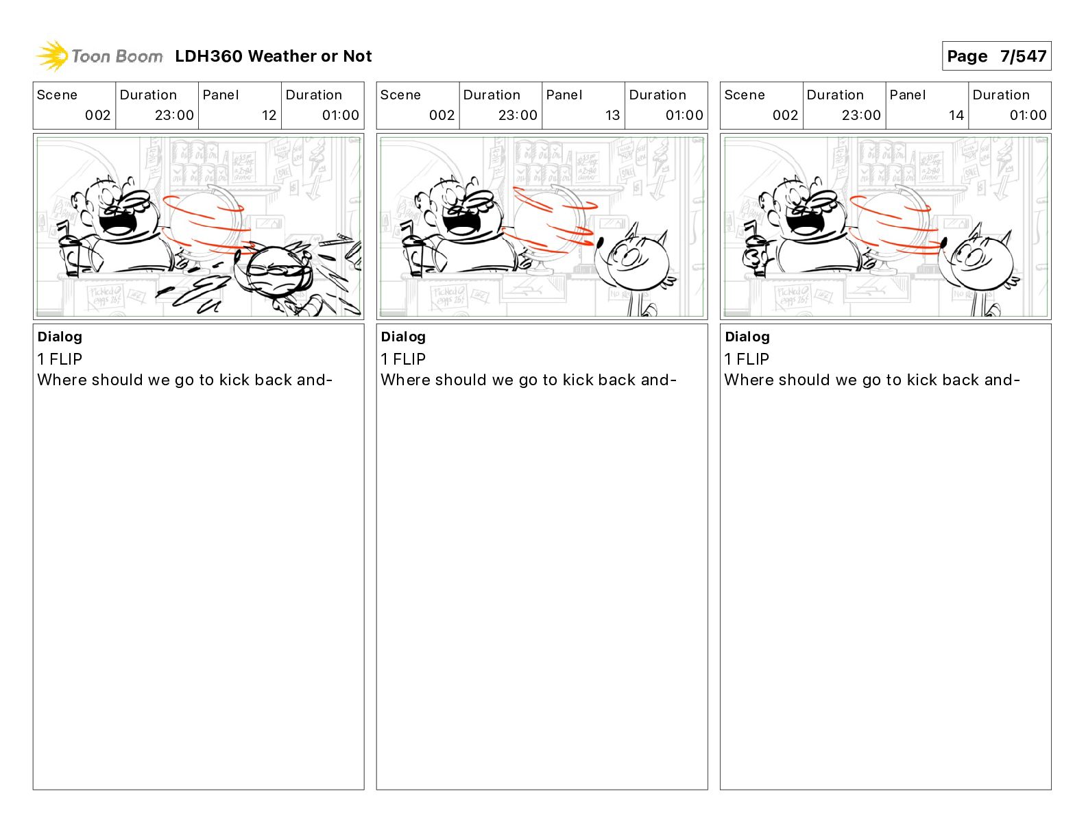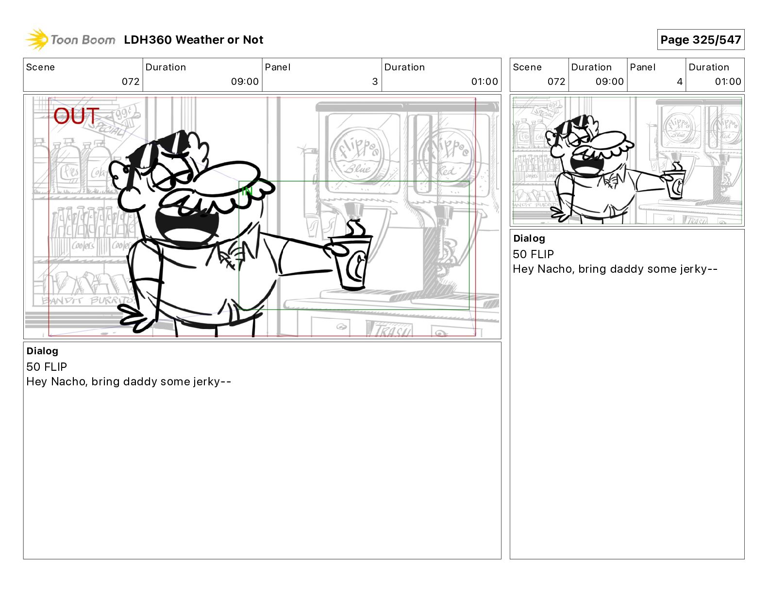 Dialog 1 FLIP All right, Nacho. Scene 002 Duration 23 00 Panel 4 Duration 01 00 Dialog 1 FLIP Time to pick a vacation destination. Scene 002 Duration 23 00 Panel 5 Duration 01 00 Dialog 1 FLIP Time to pick a vacation destination. LDH360 Weather or Not Page 4/547