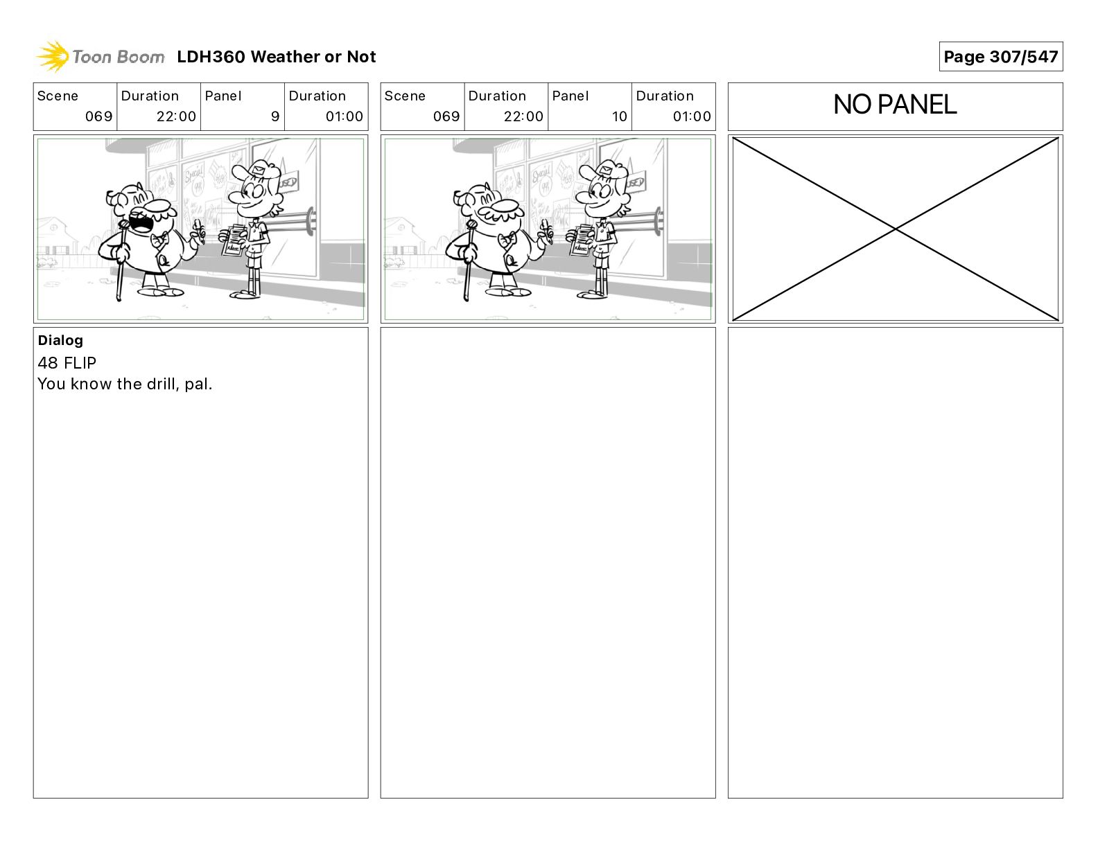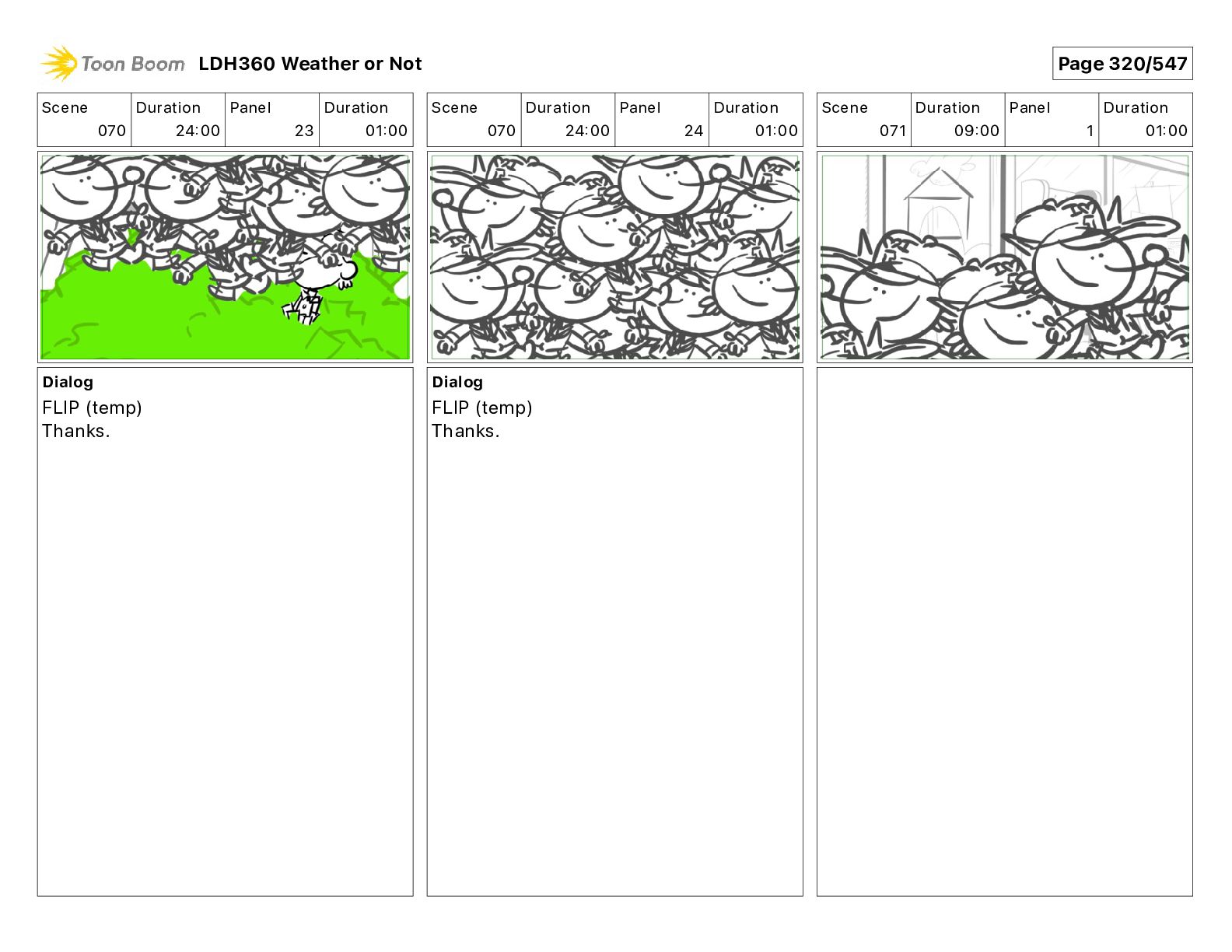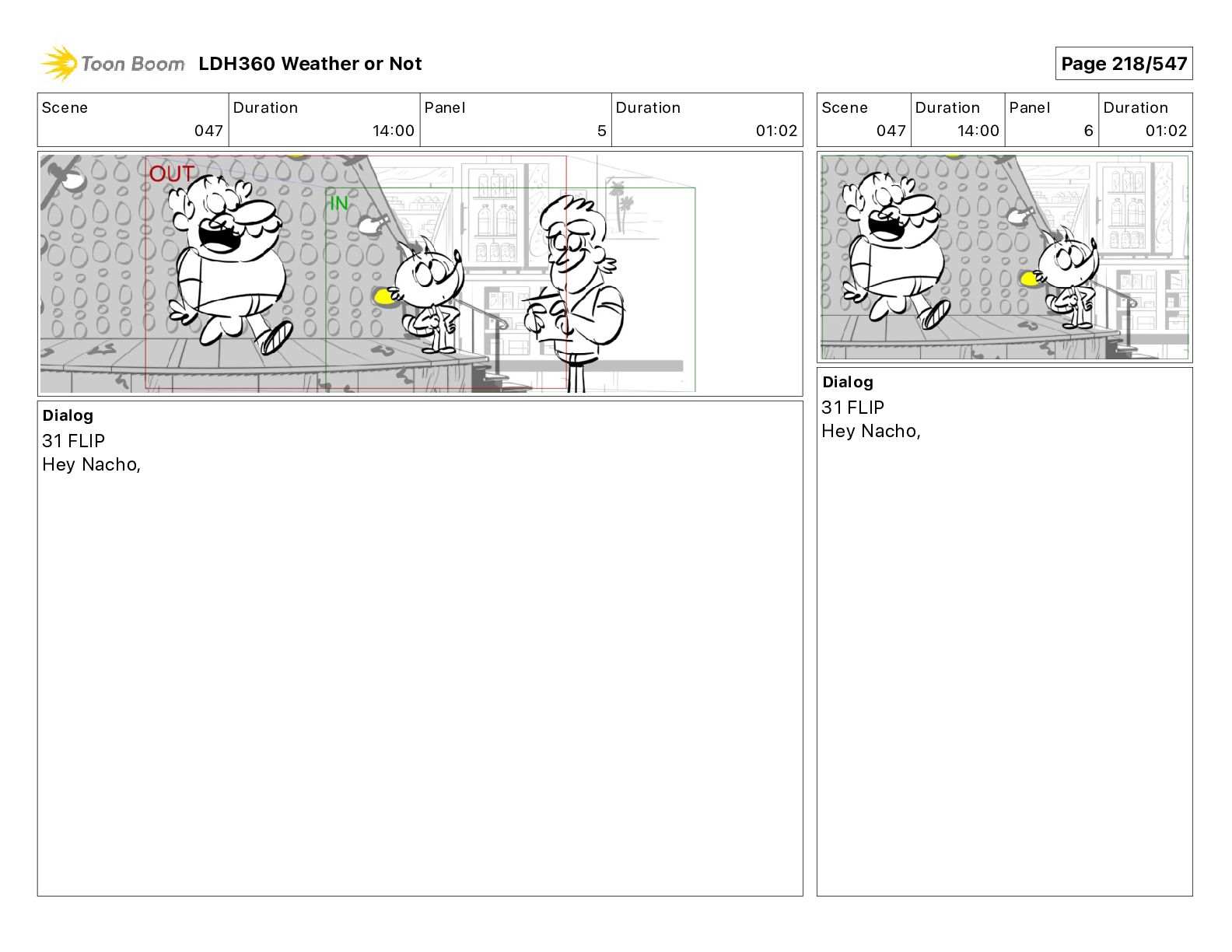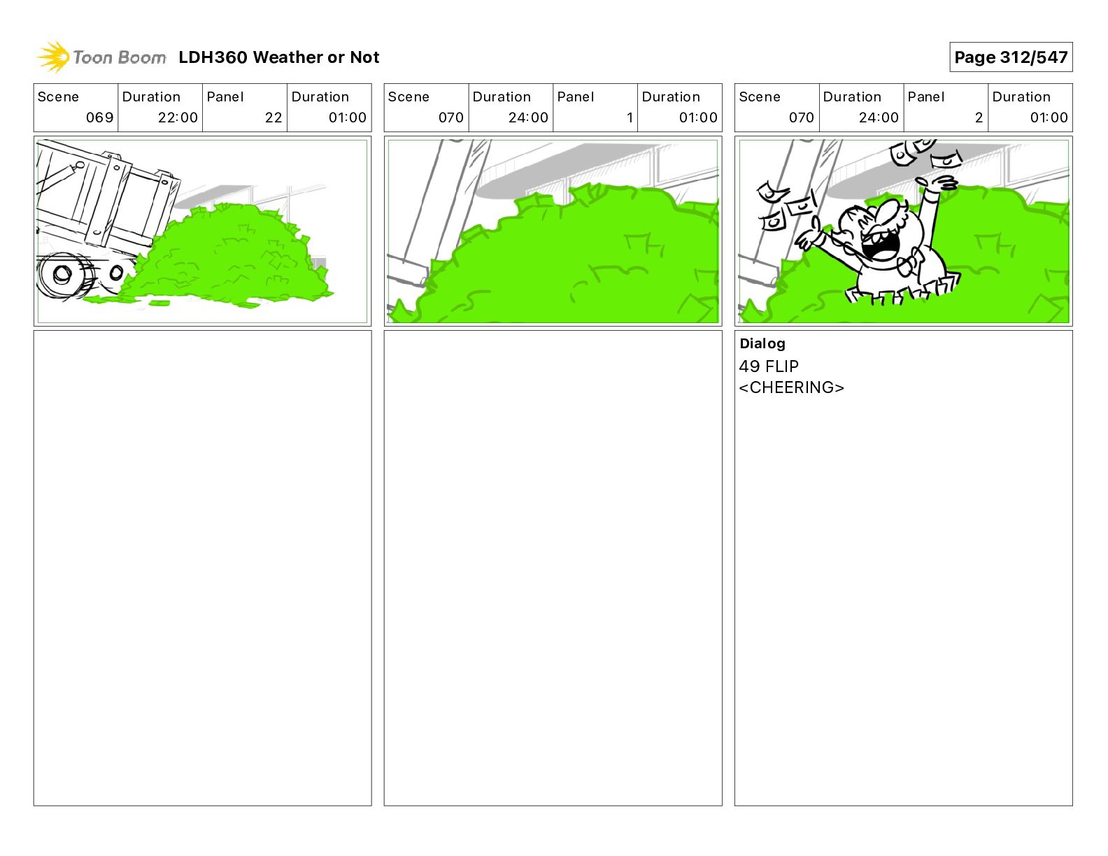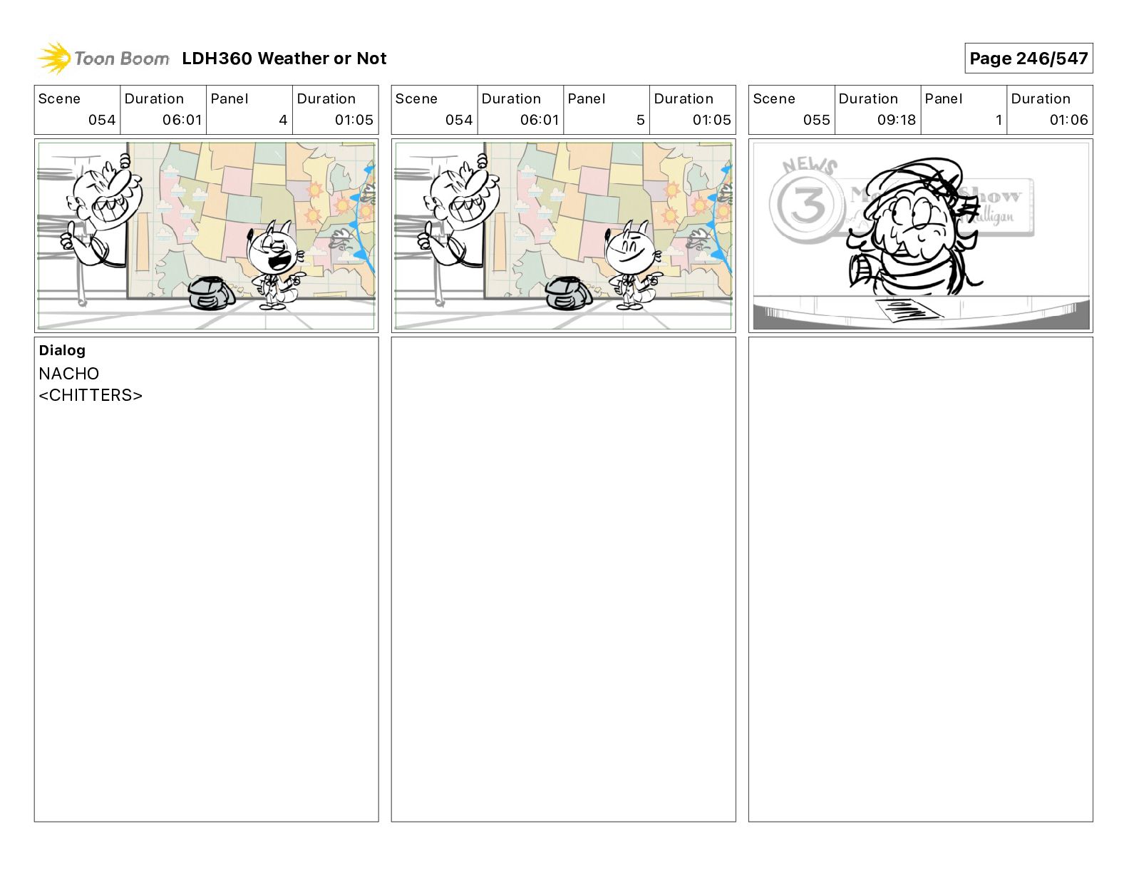 Dialog 1 FLIP All right, Nacho. Scene 002 Duration 23 00 Panel 4 Duration 01 00 Dialog 1 FLIP Time to pick a vacation destination. Scene 002 Duration 23 00 Panel 5 Duration 01 00 Dialog 1 FLIP Time to pick a vacation destination. LDH360 Weather or Not Page 4/547