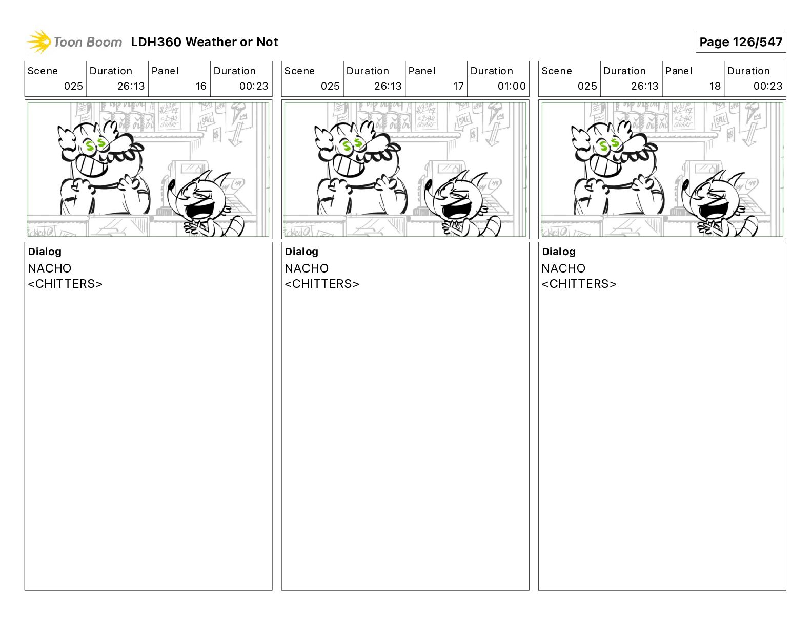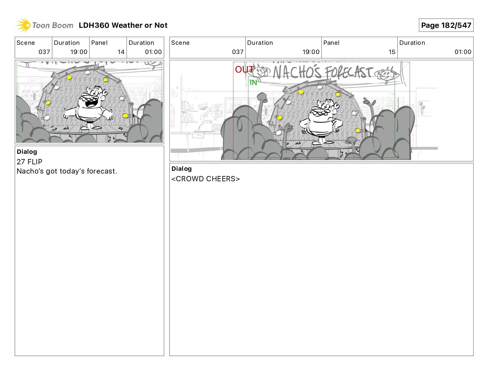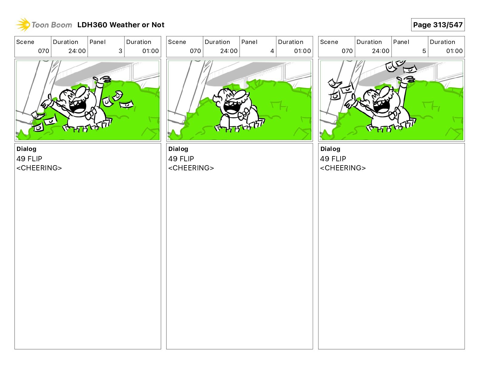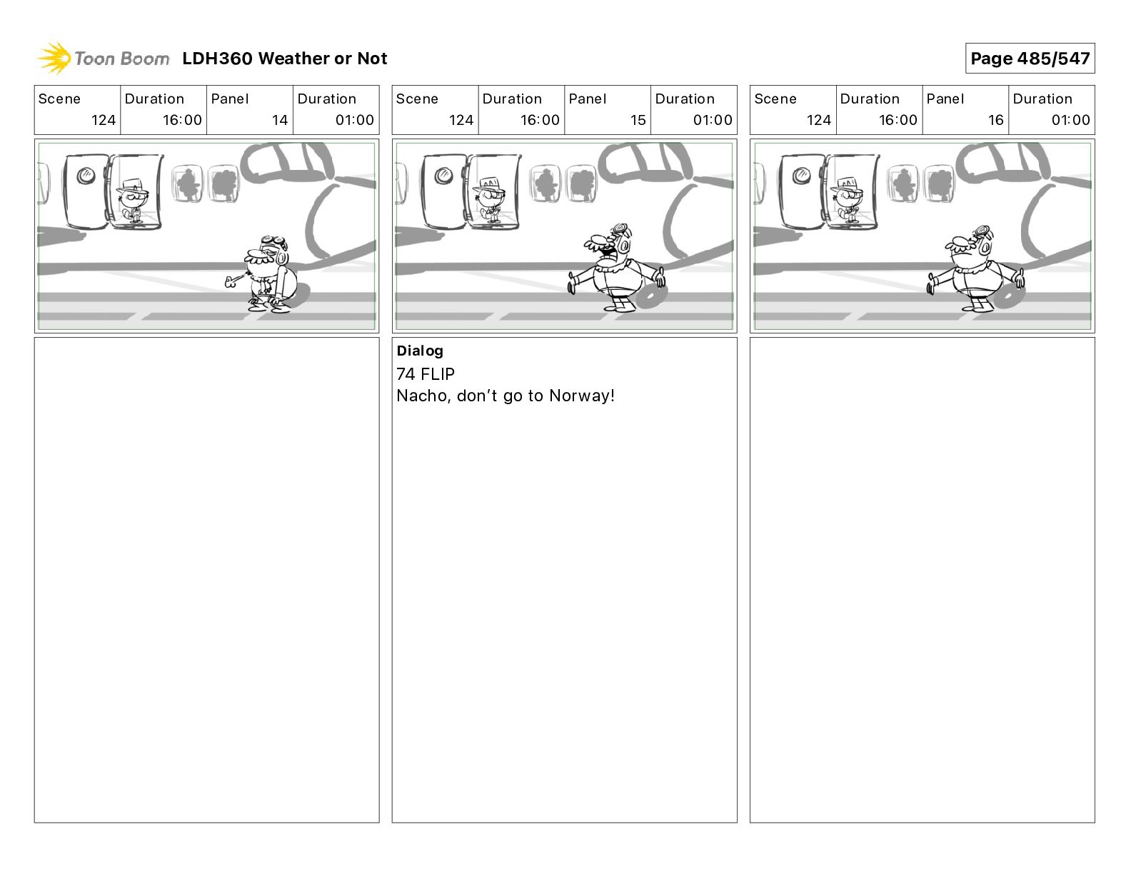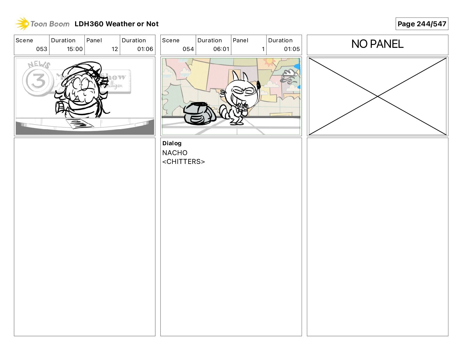 Dialog 1 FLIP All right, Nacho. Scene 002 Duration 23 00 Panel 4 Duration 01 00 Dialog 1 FLIP Time to pick a vacation destination. Scene 002 Duration 23 00 Panel 5 Duration 01 00 Dialog 1 FLIP Time to pick a vacation destination. LDH360 Weather or Not Page 4/547