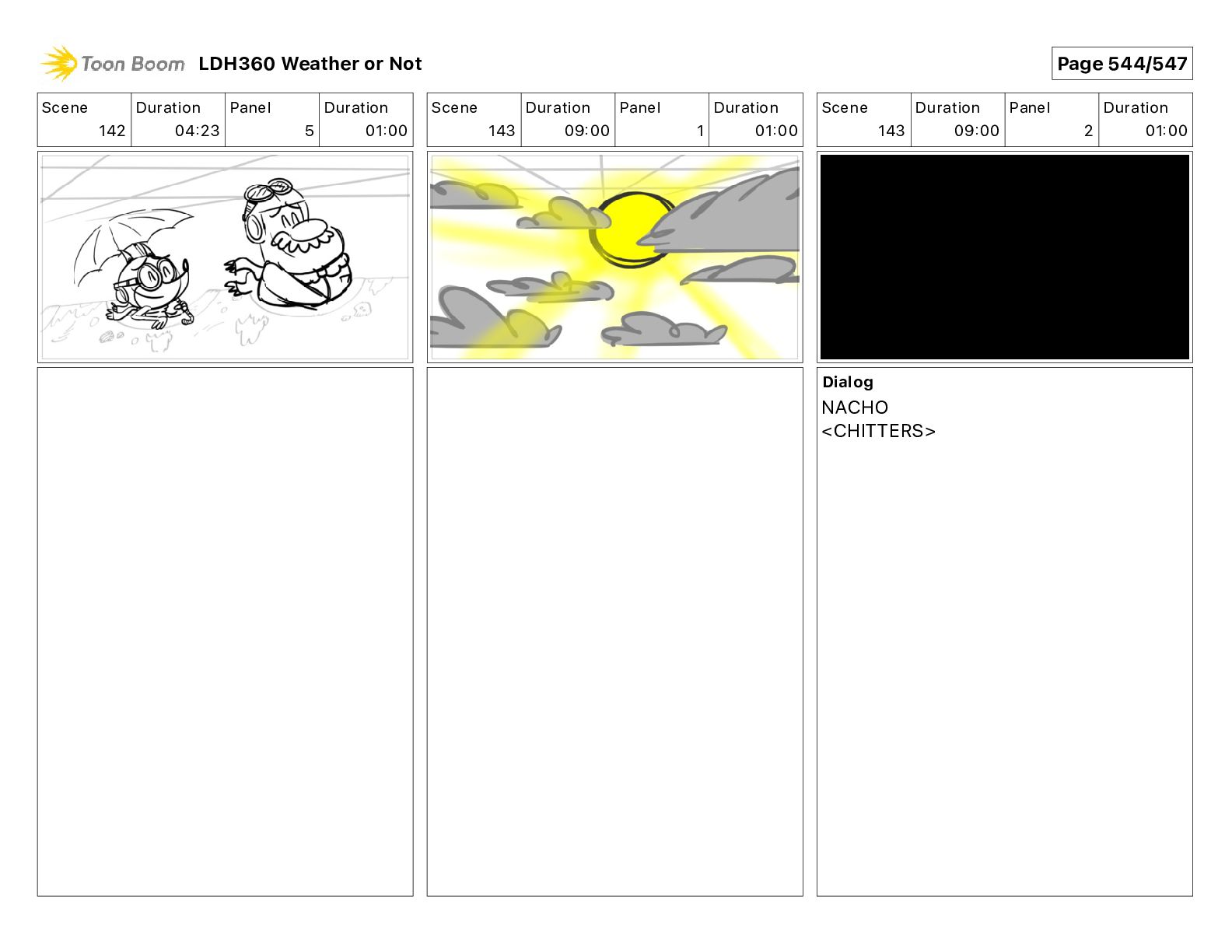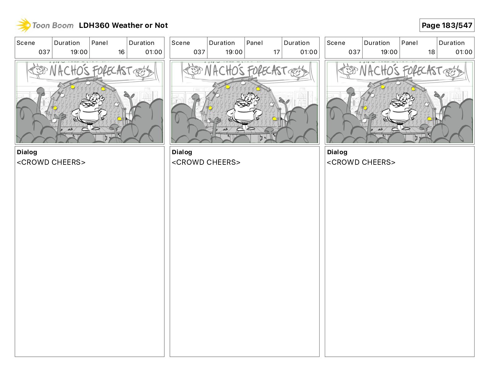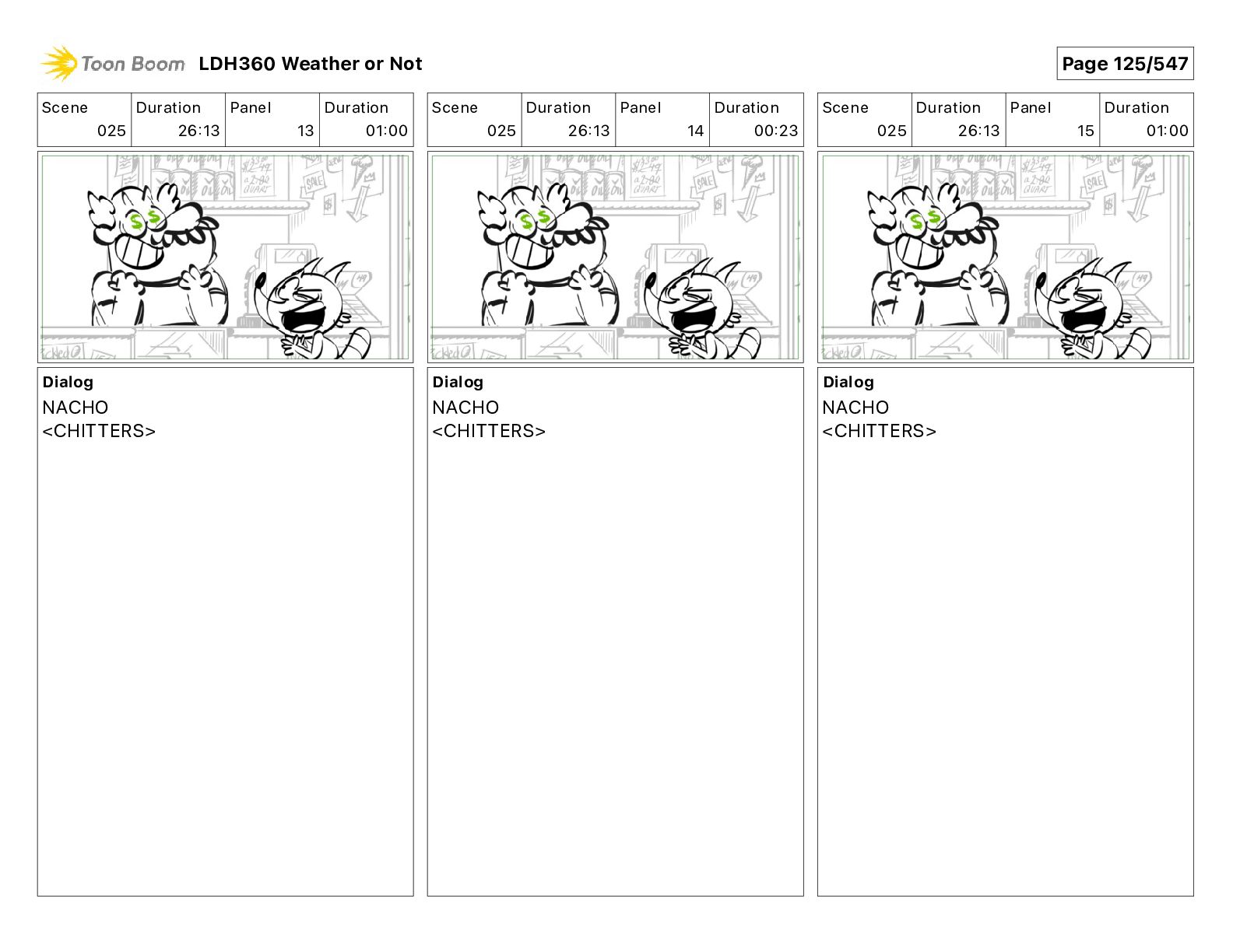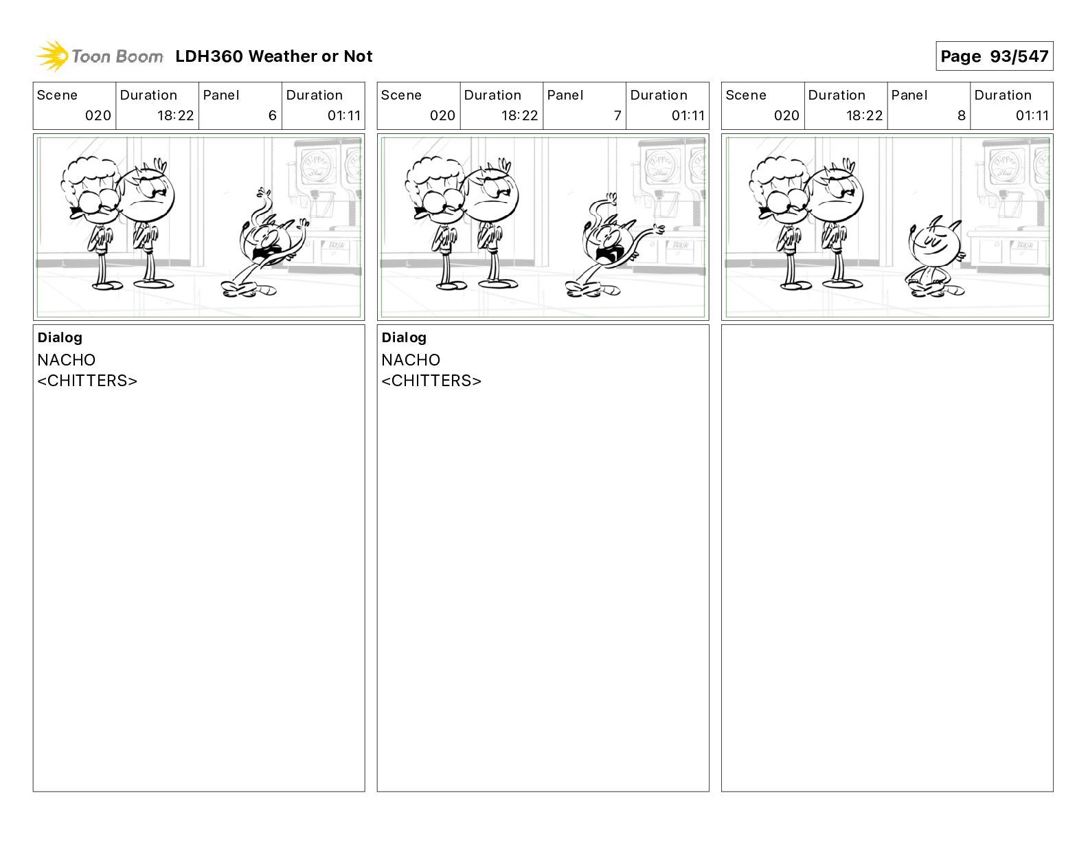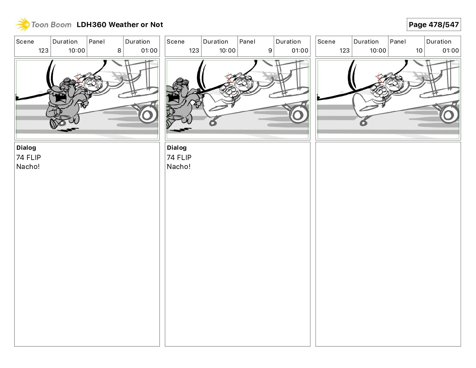 Dialog 1 FLIP All right, Nacho. Scene 002 Duration 23 00 Panel 4 Duration 01 00 Dialog 1 FLIP Time to pick a vacation destination. Scene 002 Duration 23 00 Panel 5 Duration 01 00 Dialog 1 FLIP Time to pick a vacation destination. LDH360 Weather or Not Page 4/547