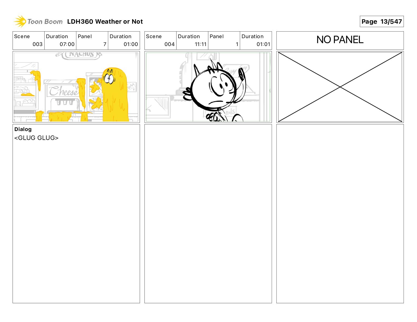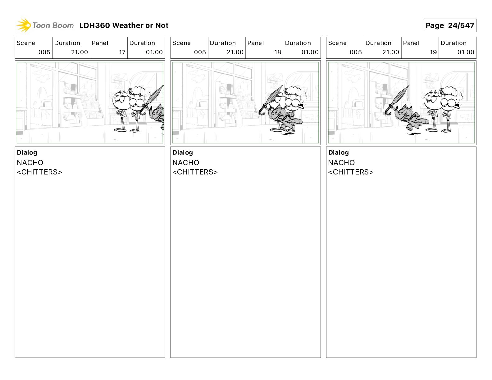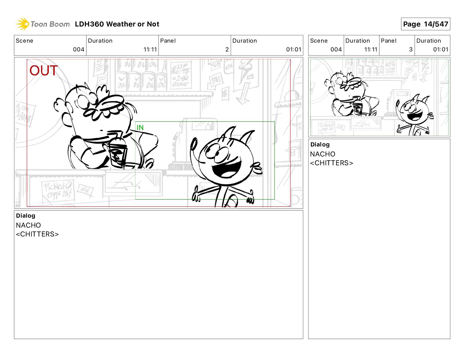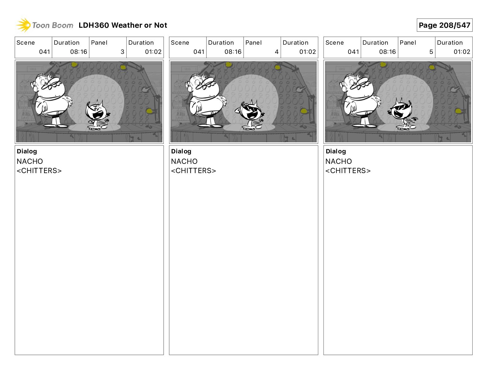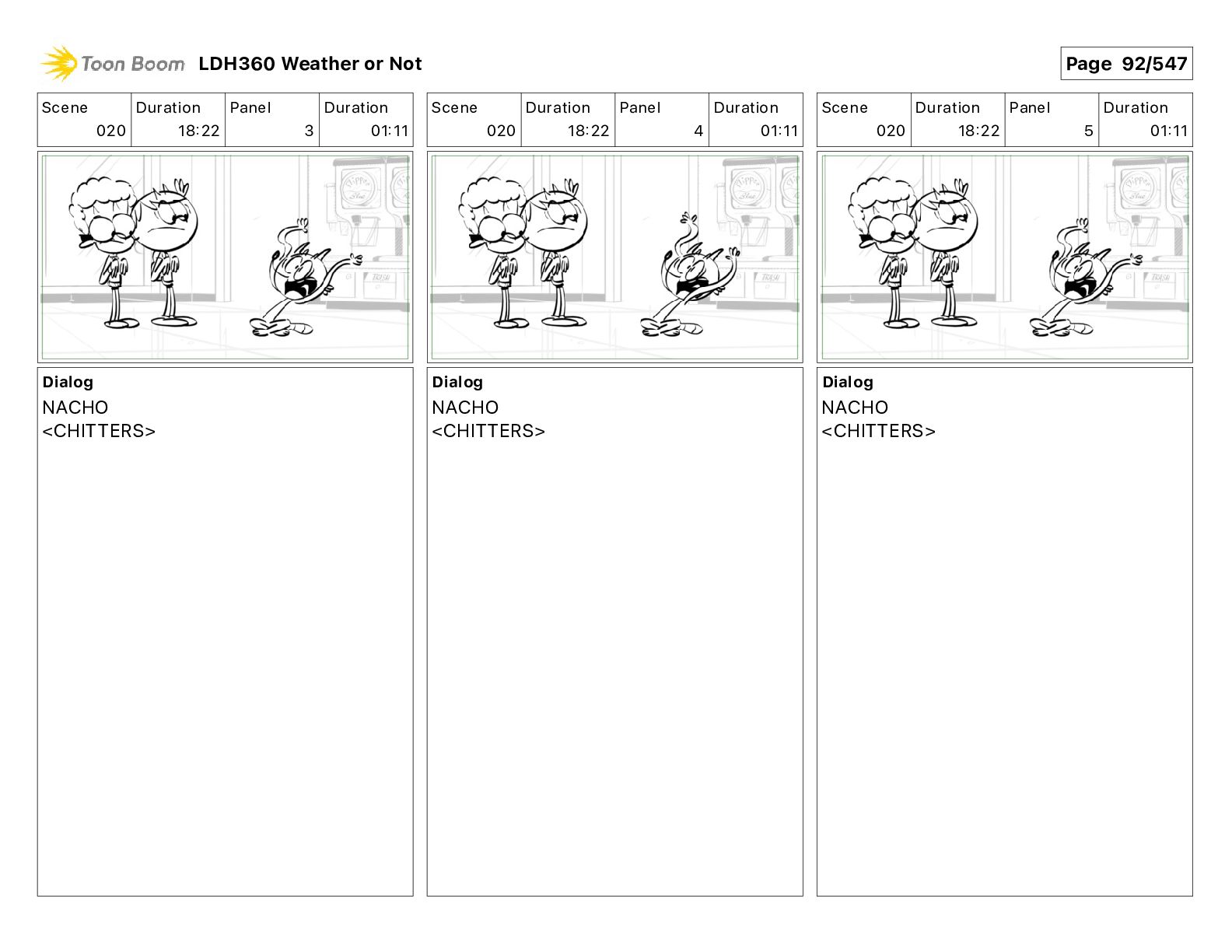 Dialog 1 FLIP All right, Nacho. Scene 002 Duration 23 00 Panel 4 Duration 01 00 Dialog 1 FLIP Time to pick a vacation destination. Scene 002 Duration 23 00 Panel 5 Duration 01 00 Dialog 1 FLIP Time to pick a vacation destination. LDH360 Weather or Not Page 4/547
