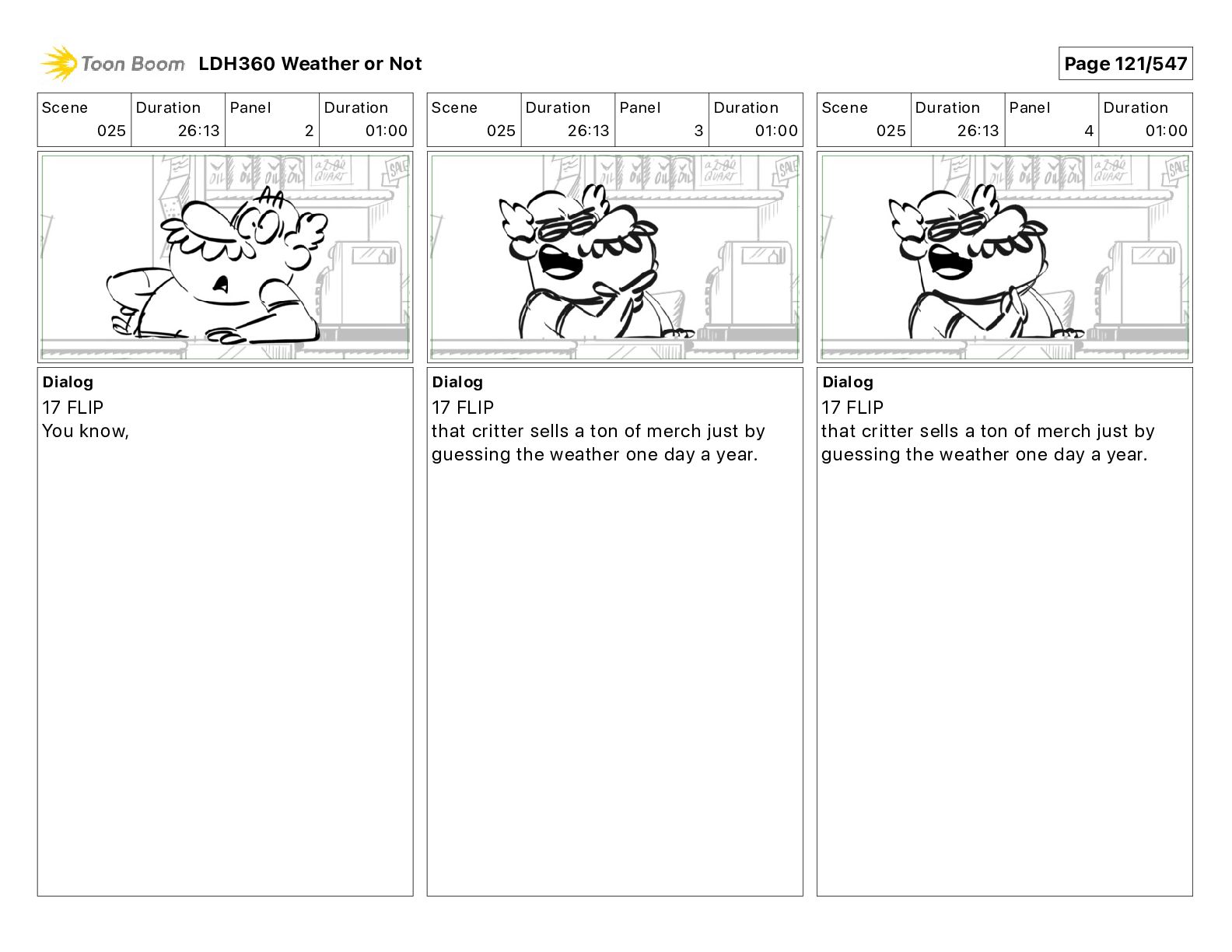 Dialog 17 FLIP You know, Scene 025 Duration 26 13 Panel 3 Duration 01 00 Dialog 17 FLIP that critter sells a ton of merch just by guessing the weather one day a year. Scene 025 Duration 26 13 Panel 4 Duration 01 00 Dialog 17 FLIP that critter sells a ton of merch just by guessing the weather one day a year. LDH360 Weather or Not Page 121/547