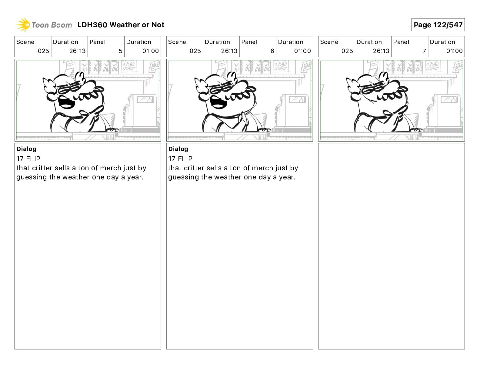 Dialog 17 FLIP that critter sells a ton of merch just by guessing the weather one day a year. Scene 025 Duration 26 13 Panel 6 Duration 01 00 Dialog 17 FLIP that critter sells a ton of merch just by guessing the weather one day a year. Scene 025 Duration 26 13 Panel 7 Duration 01 00 LDH360 Weather or Not Page 122/547