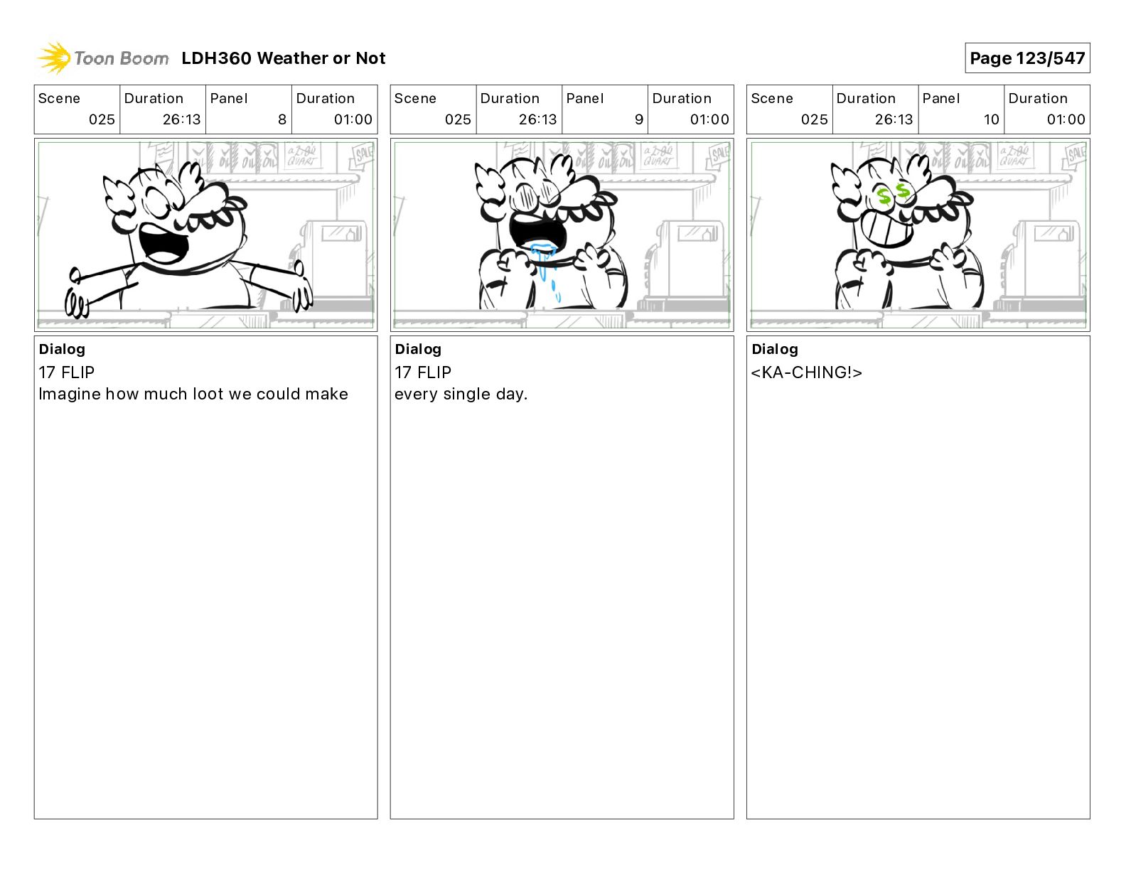 Dialog 17 FLIP Imagine how much loot we could make Scene 025 Duration 26 13 Panel 9 Duration 01 00 Dialog 17 FLIP every single day. Scene 025 Duration 26 13 Panel 10 Duration 01 00 Dialog <KA-CHING!> LDH360 Weather or Not Page 123/547