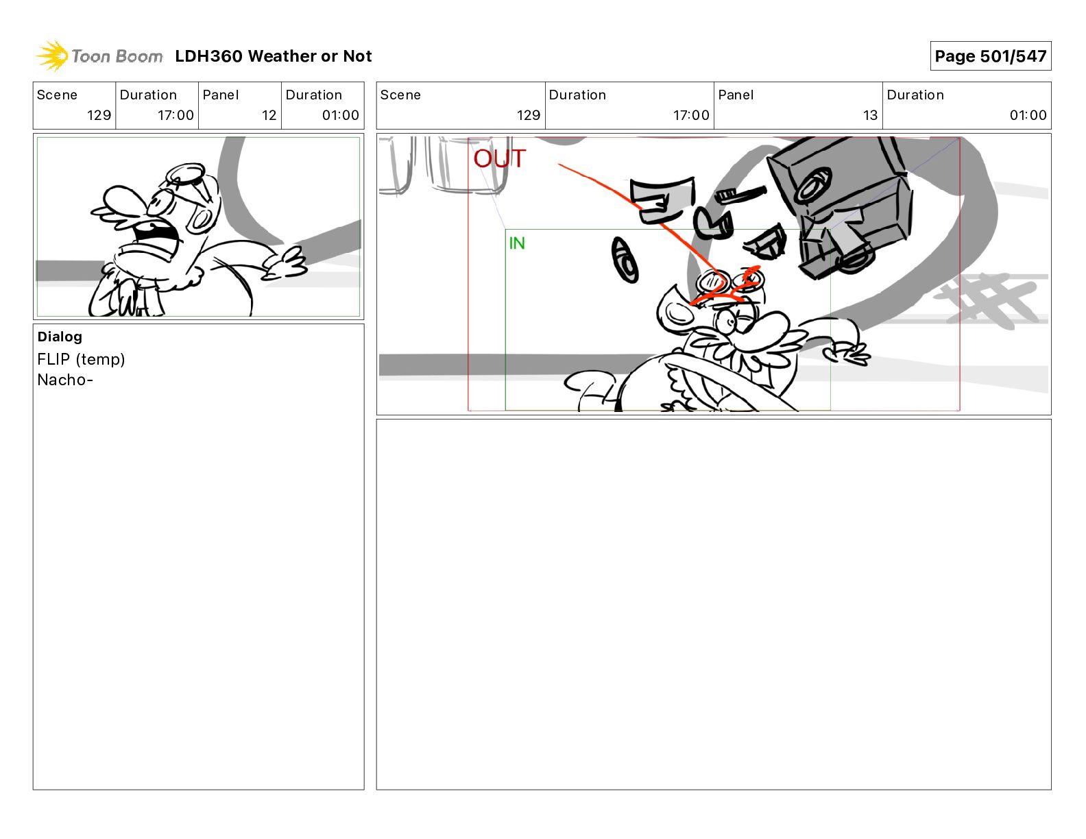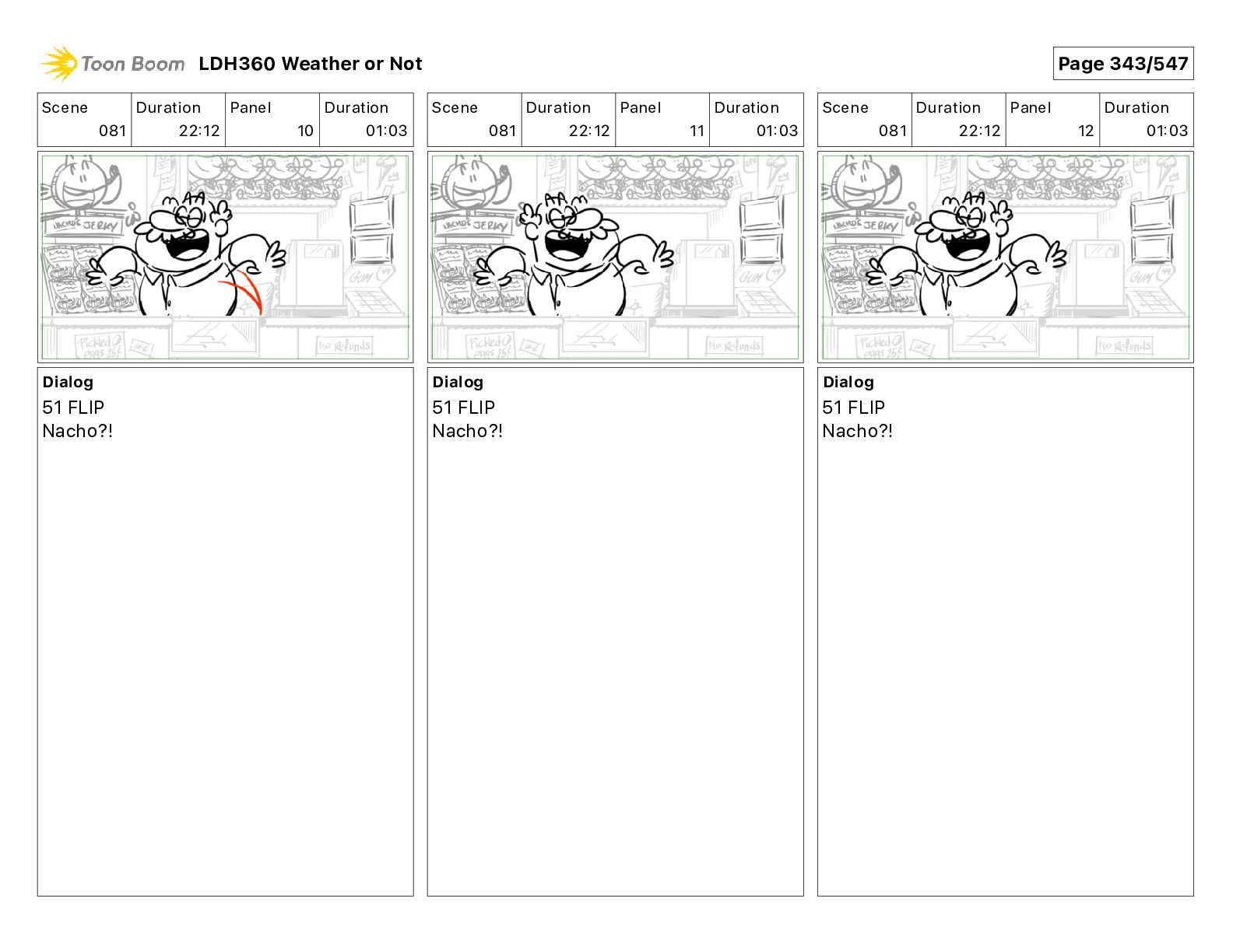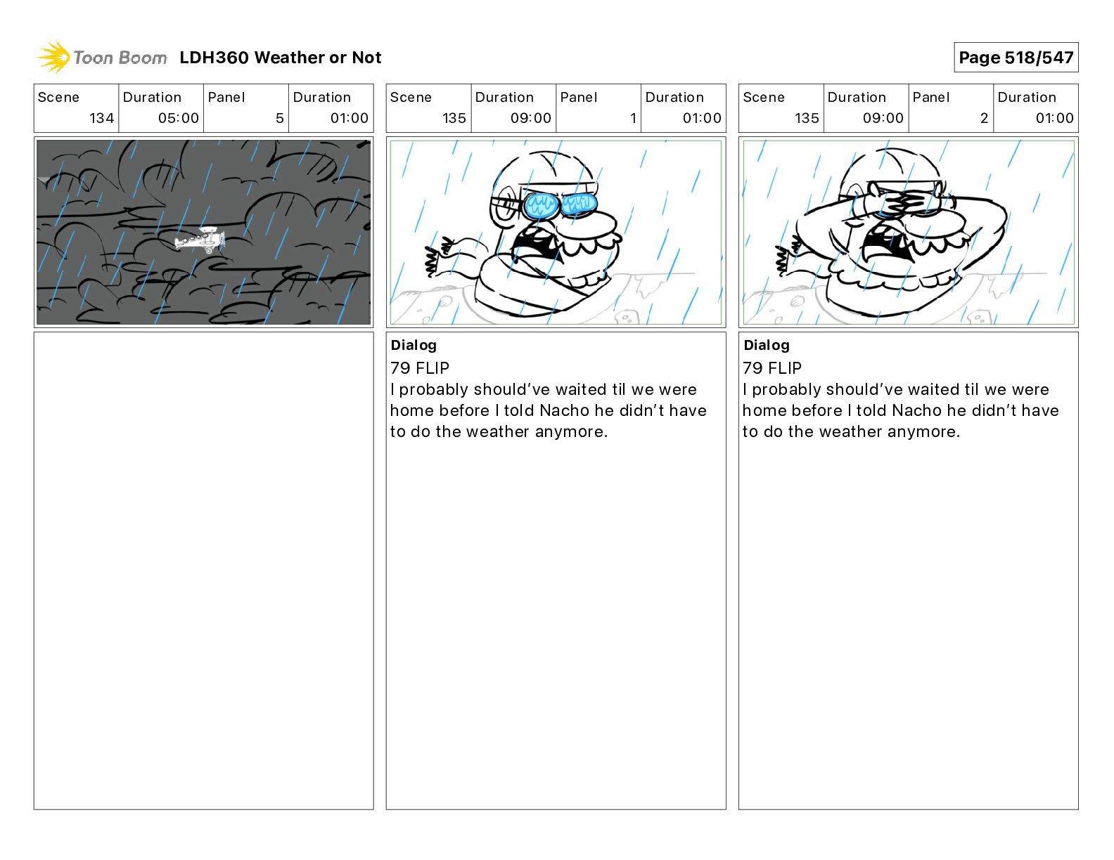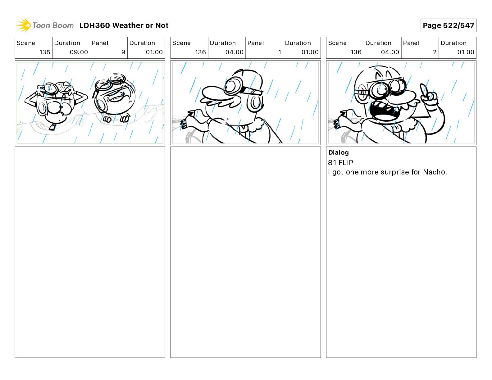 Scene 136 Duration 04 00 Panel 1 Duration 01 00 Scene 136 Duration 04 00 Panel 2 Duration 01 00 Dialog 81 FLIP I got one more surprise for Nacho. LDH360 Weather or Not Page 522/547