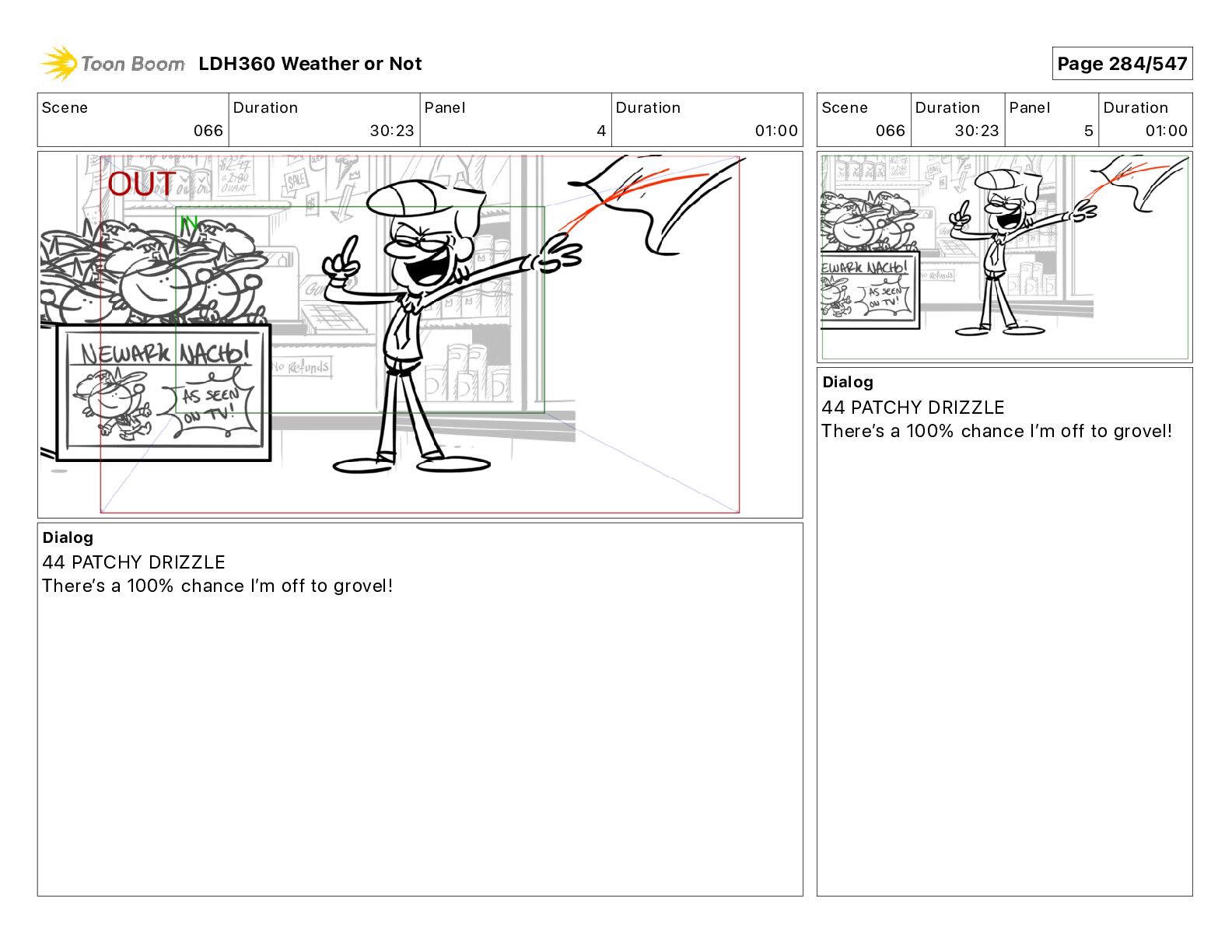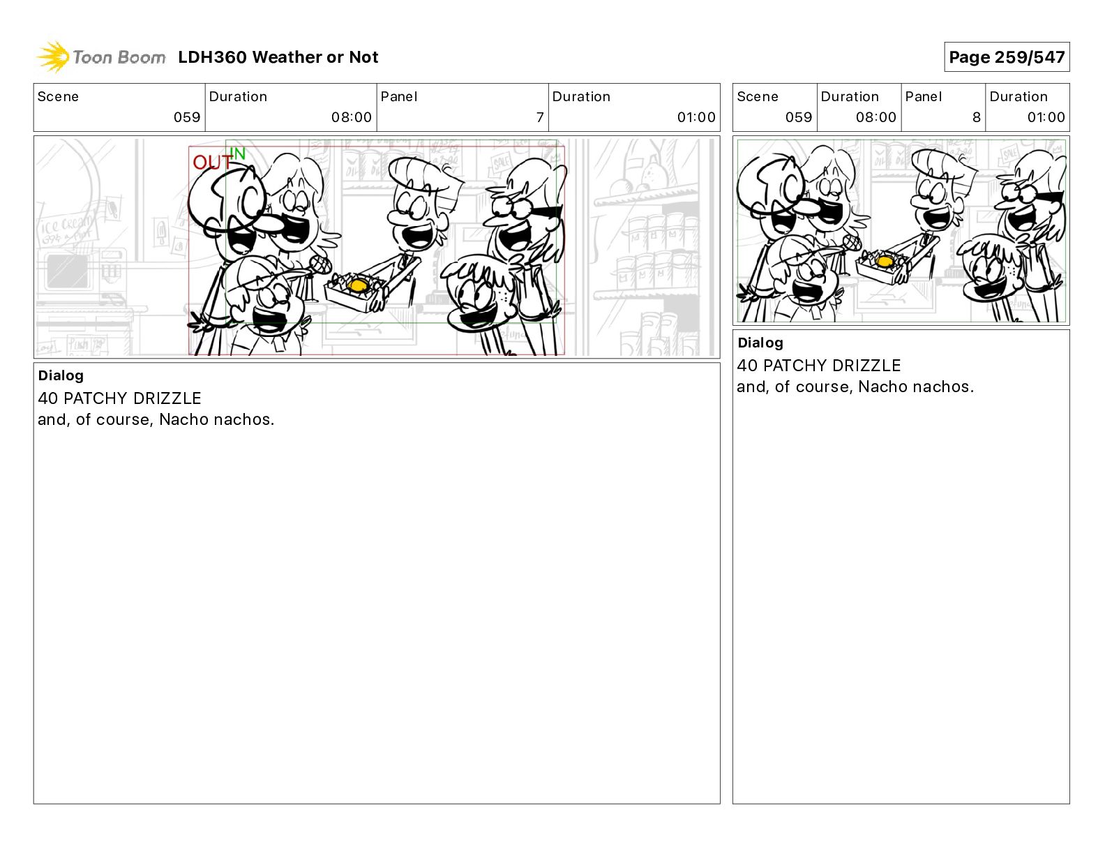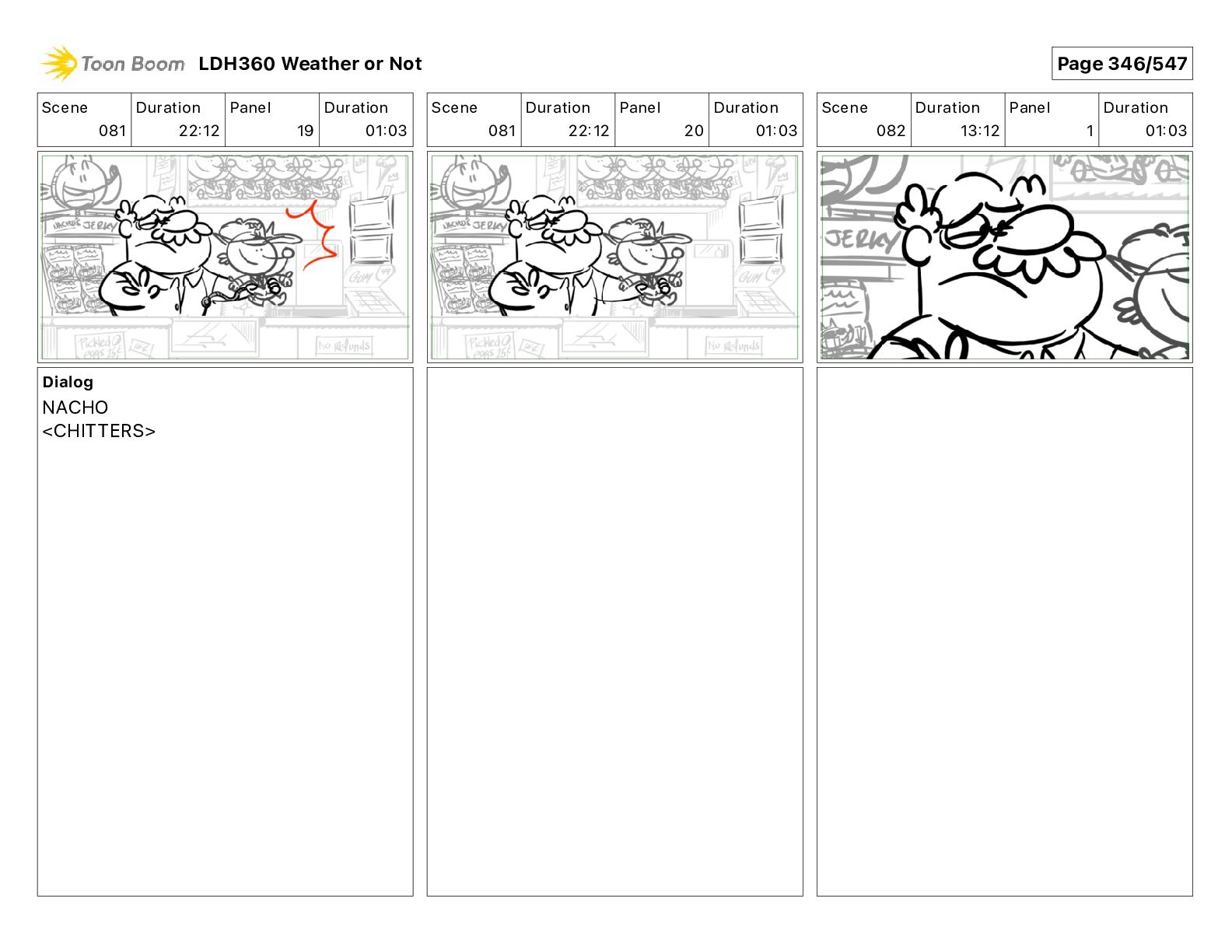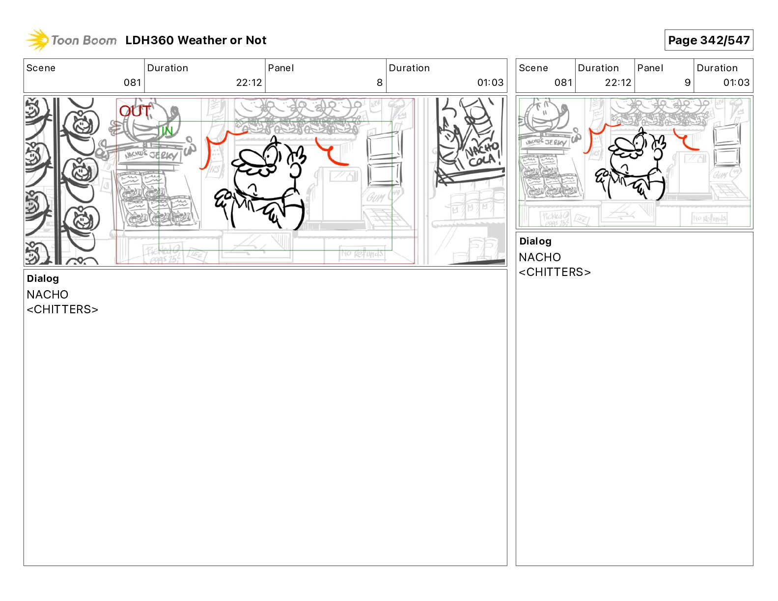 Scene 136 Duration 04 00 Panel 1 Duration 01 00 Scene 136 Duration 04 00 Panel 2 Duration 01 00 Dialog 81 FLIP I got one more surprise for Nacho. LDH360 Weather or Not Page 522/547