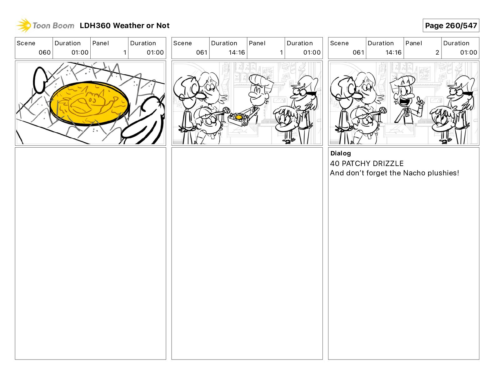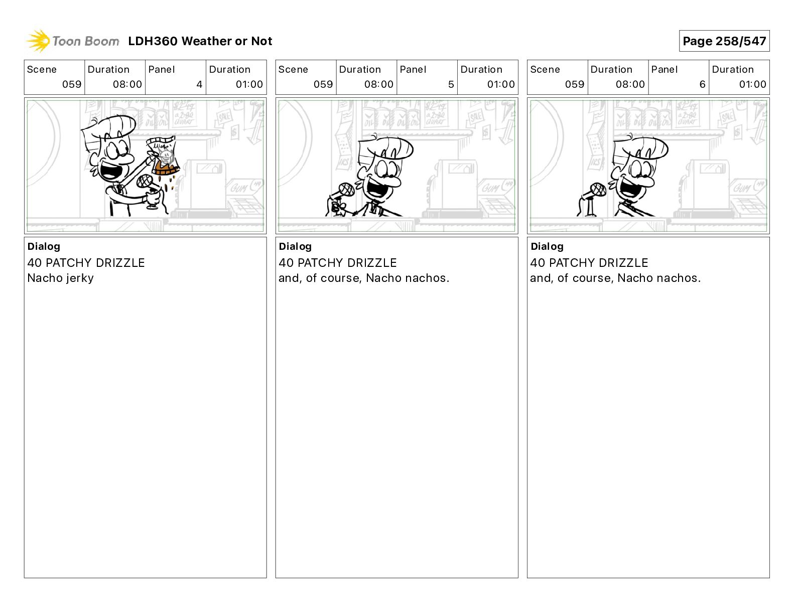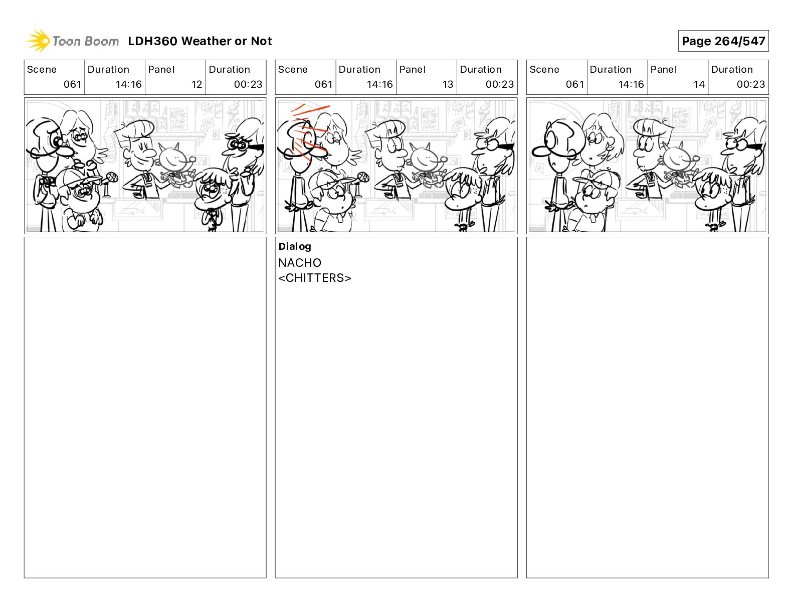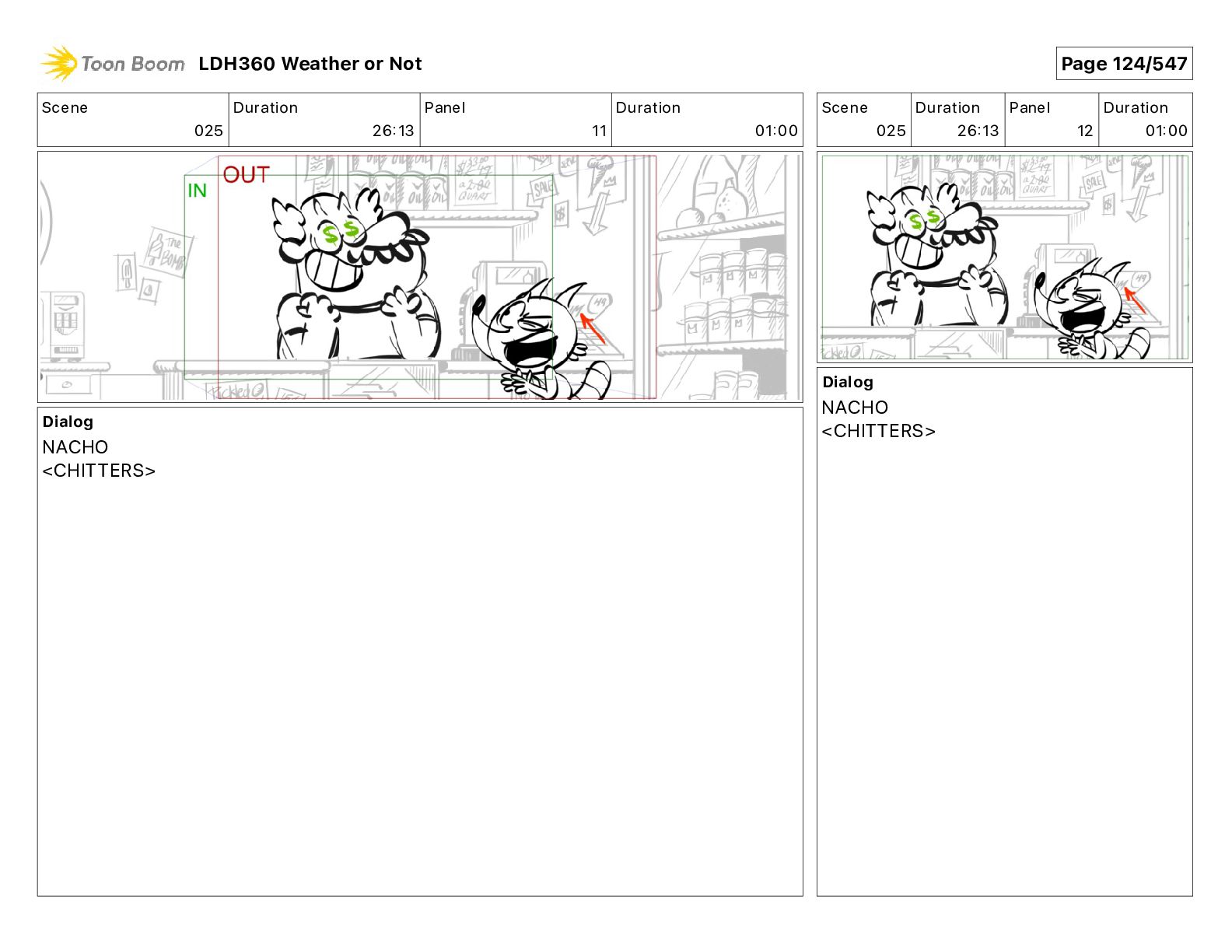 Scene 136 Duration 04 00 Panel 1 Duration 01 00 Scene 136 Duration 04 00 Panel 2 Duration 01 00 Dialog 81 FLIP I got one more surprise for Nacho. LDH360 Weather or Not Page 522/547