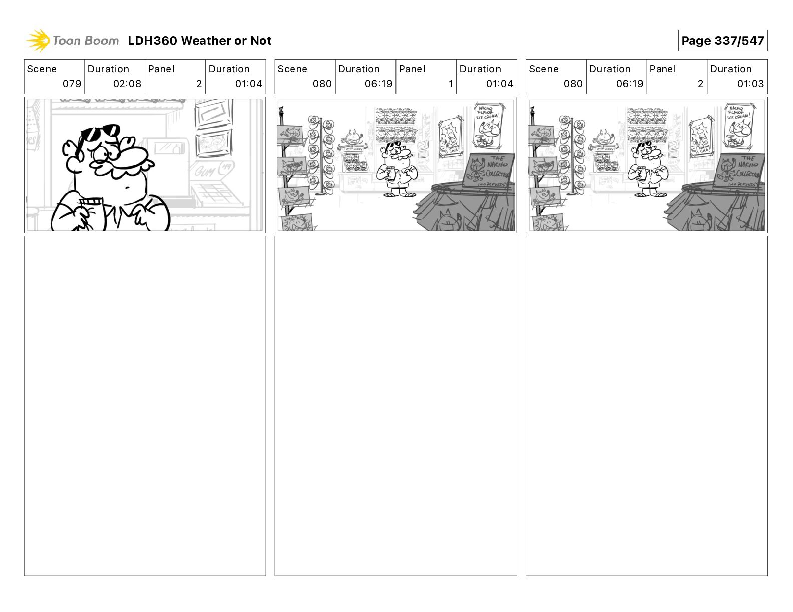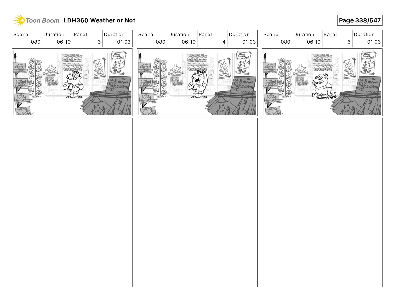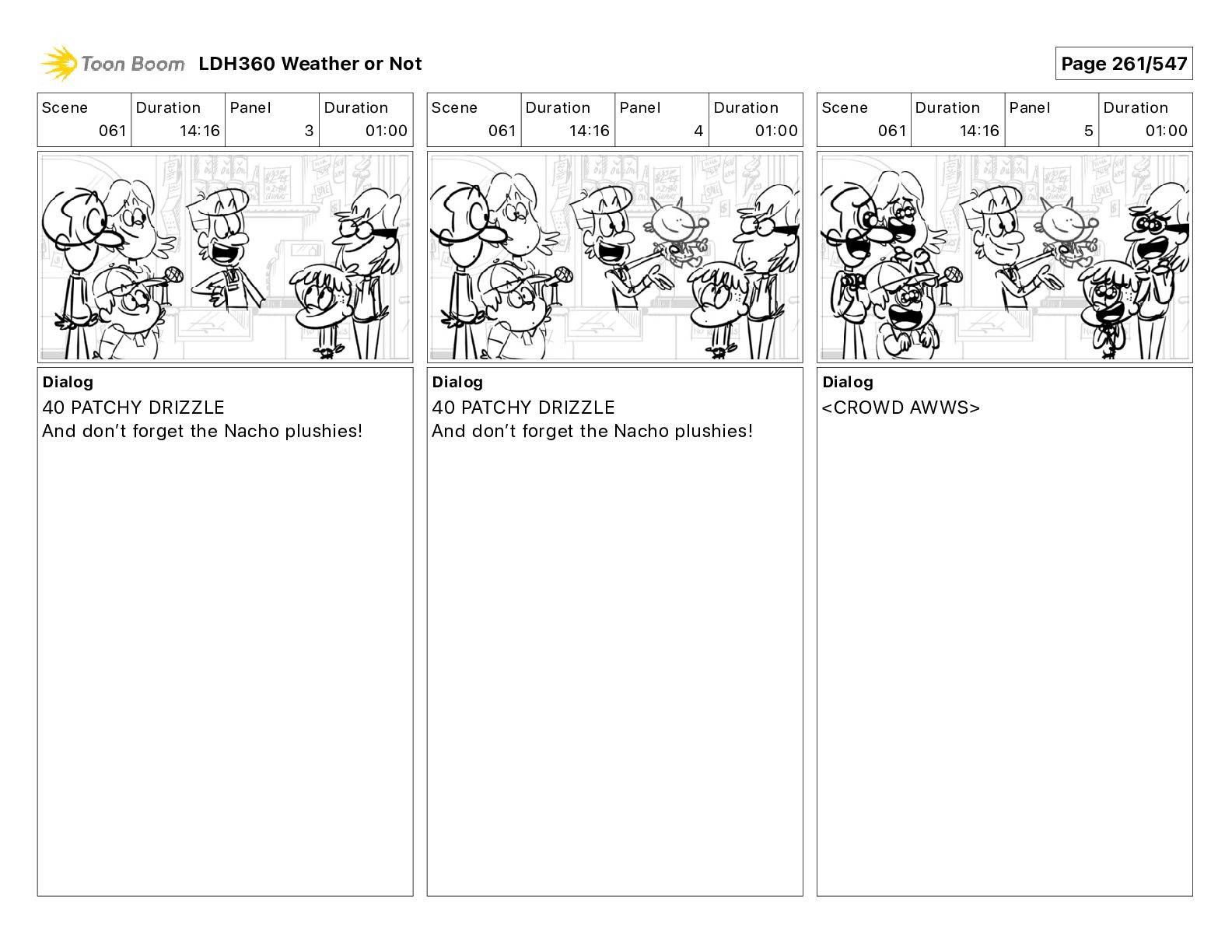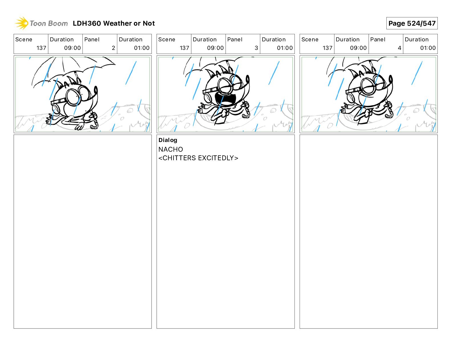 Scene 136 Duration 04 00 Panel 1 Duration 01 00 Scene 136 Duration 04 00 Panel 2 Duration 01 00 Dialog 81 FLIP I got one more surprise for Nacho. LDH360 Weather or Not Page 522/547