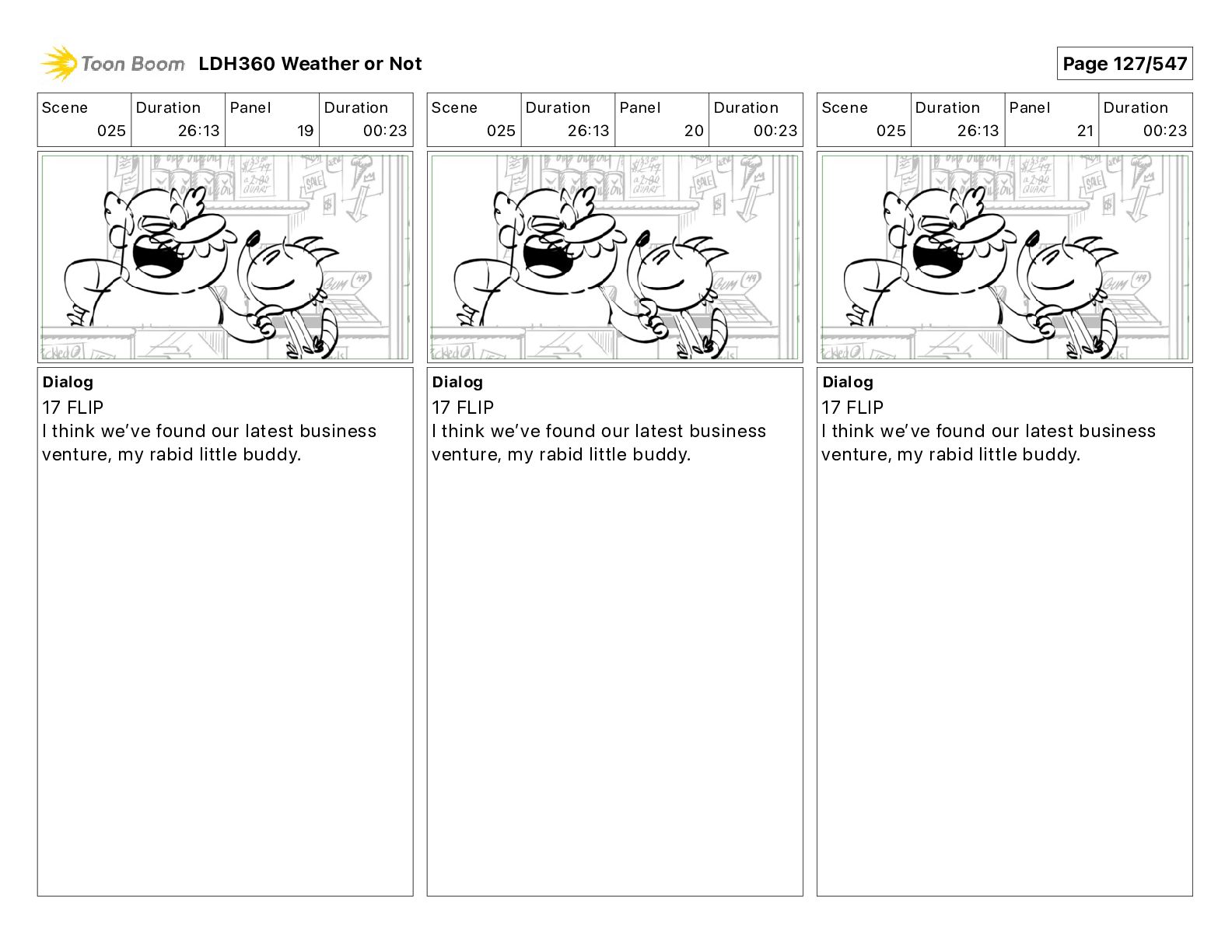 Dialog 17 FLIP I think weʼve found our latest business venture, my rabid little buddy. Scene 025 Duration 26 13 Panel 20 Duration 00 23 Dialog 17 FLIP I think weʼve found our latest business venture, my rabid little buddy. Scene 025 Duration 26 13 Panel 21 Duration 00 23 Dialog 17 FLIP I think weʼve found our latest business venture, my rabid little buddy. LDH360 Weather or Not Page 127/547