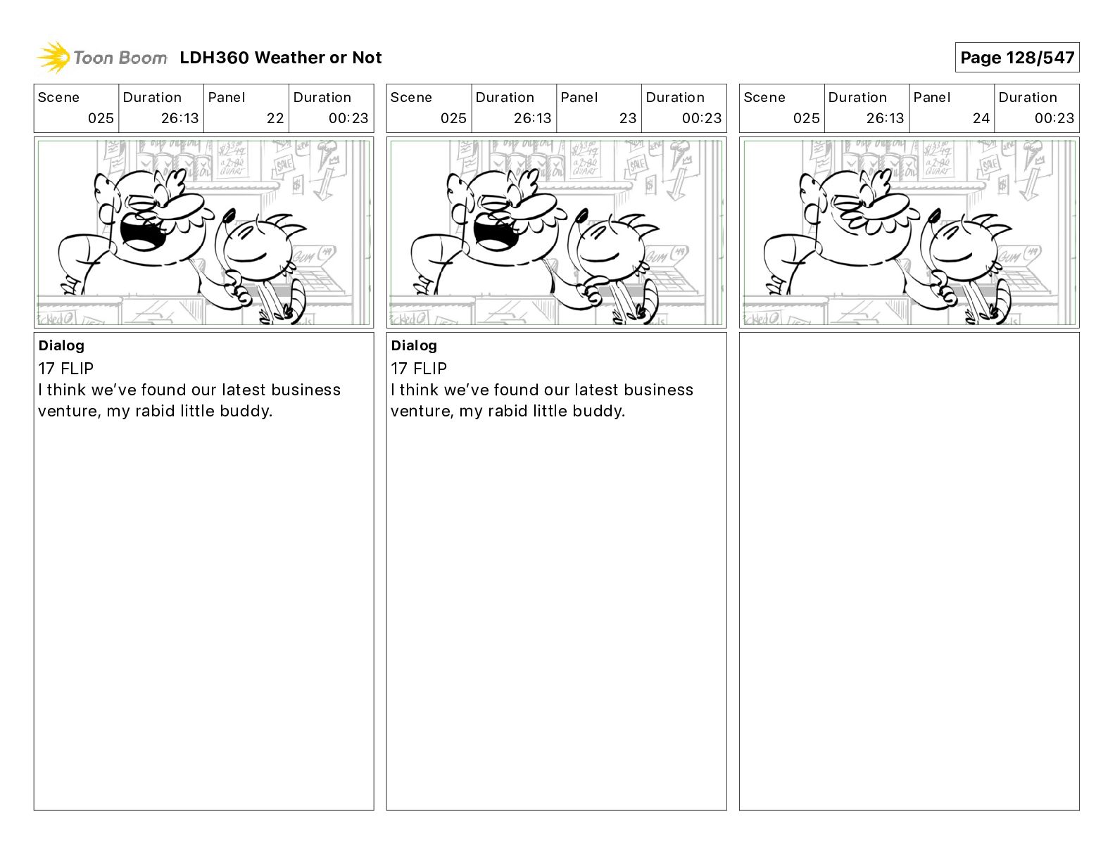 Dialog 17 FLIP I think weʼve found our latest business venture, my rabid little buddy. Scene 025 Duration 26 13 Panel 23 Duration 00 23 Dialog 17 FLIP I think weʼve found our latest business venture, my rabid little buddy. Scene 025 Duration 26 13 Panel 24 Duration 00 23 LDH360 Weather or Not Page 128/547