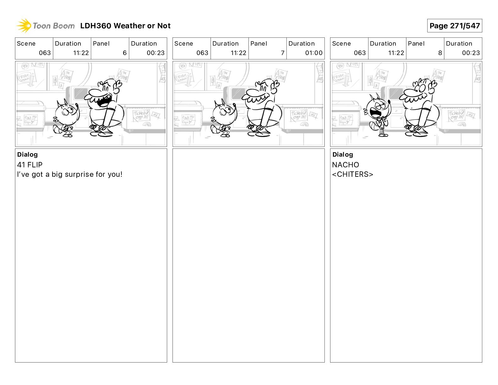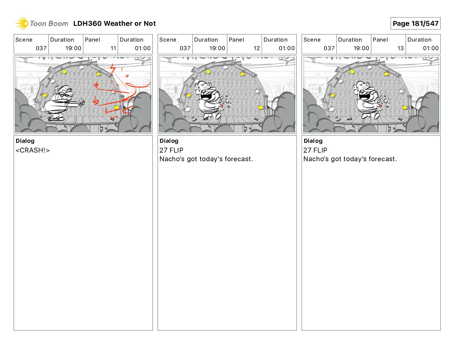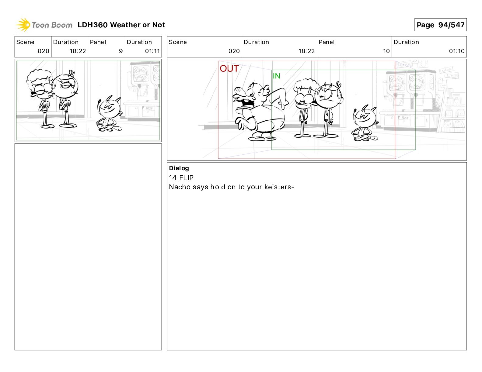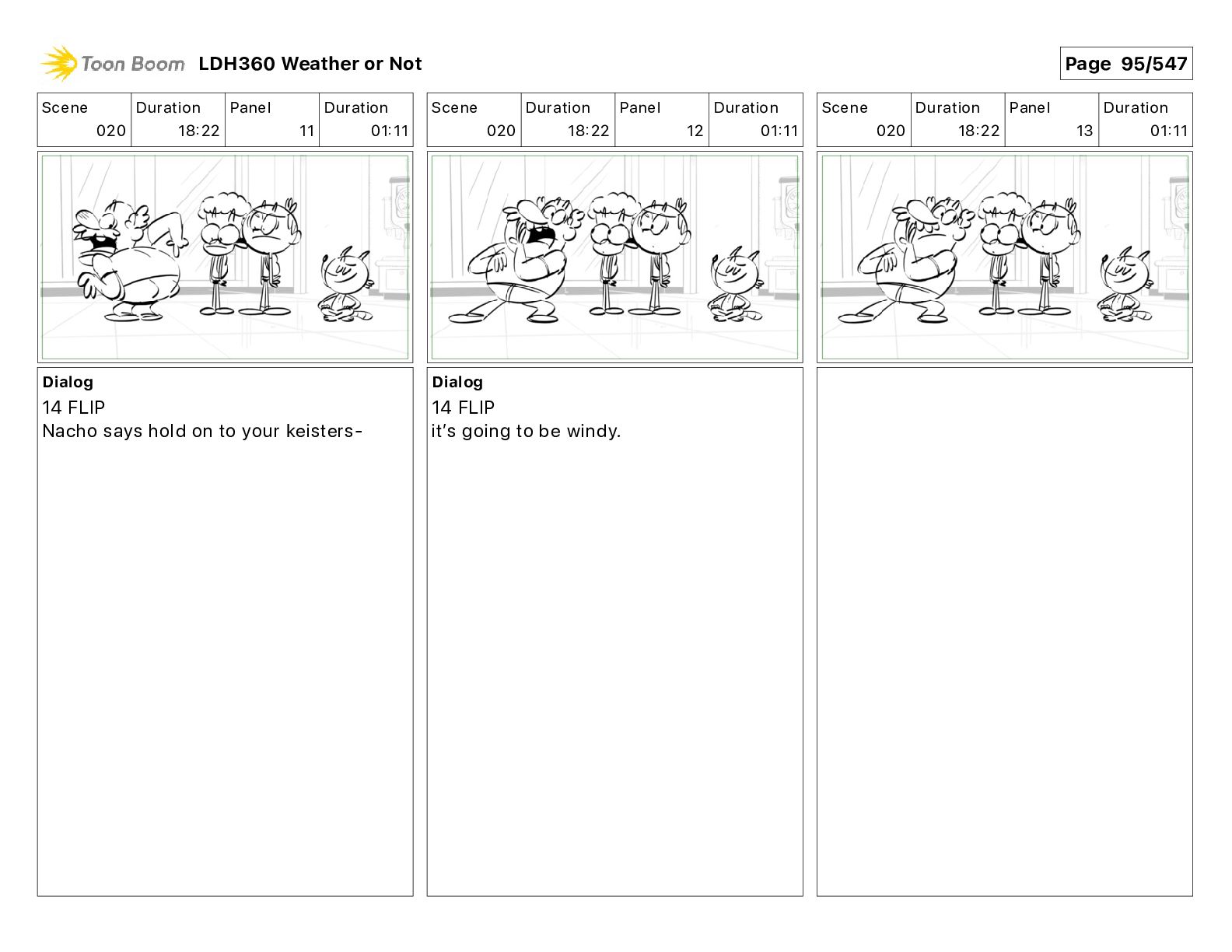 Dialog 14 FLIP Nacho says hold on to your keisters- Scene 020 Duration 18 22 Panel 12 Duration 01 11 Dialog 14 FLIP itʼs going to be windy. Scene 020 Duration 18 22 Panel 13 Duration 01 11 LDH360 Weather or Not Page 95/547