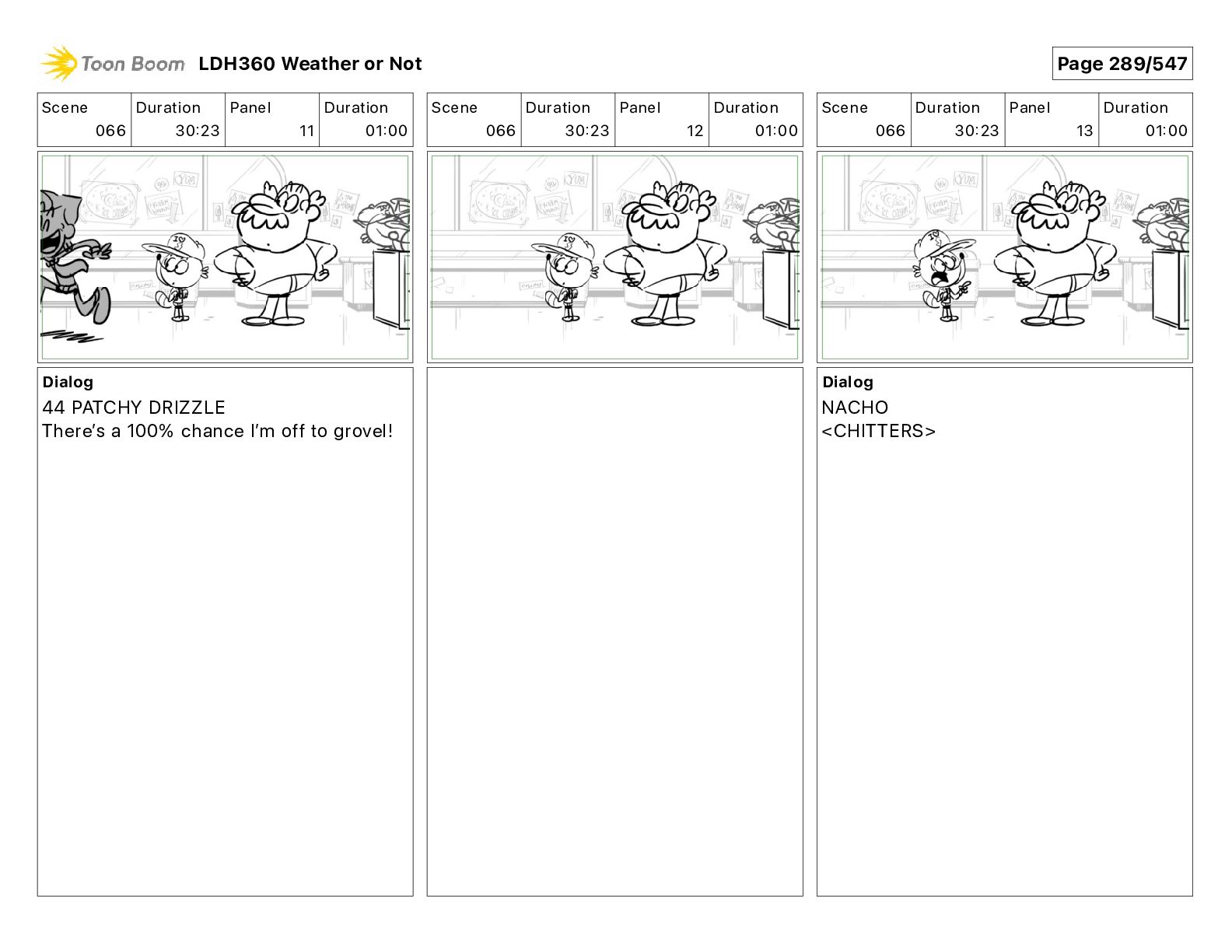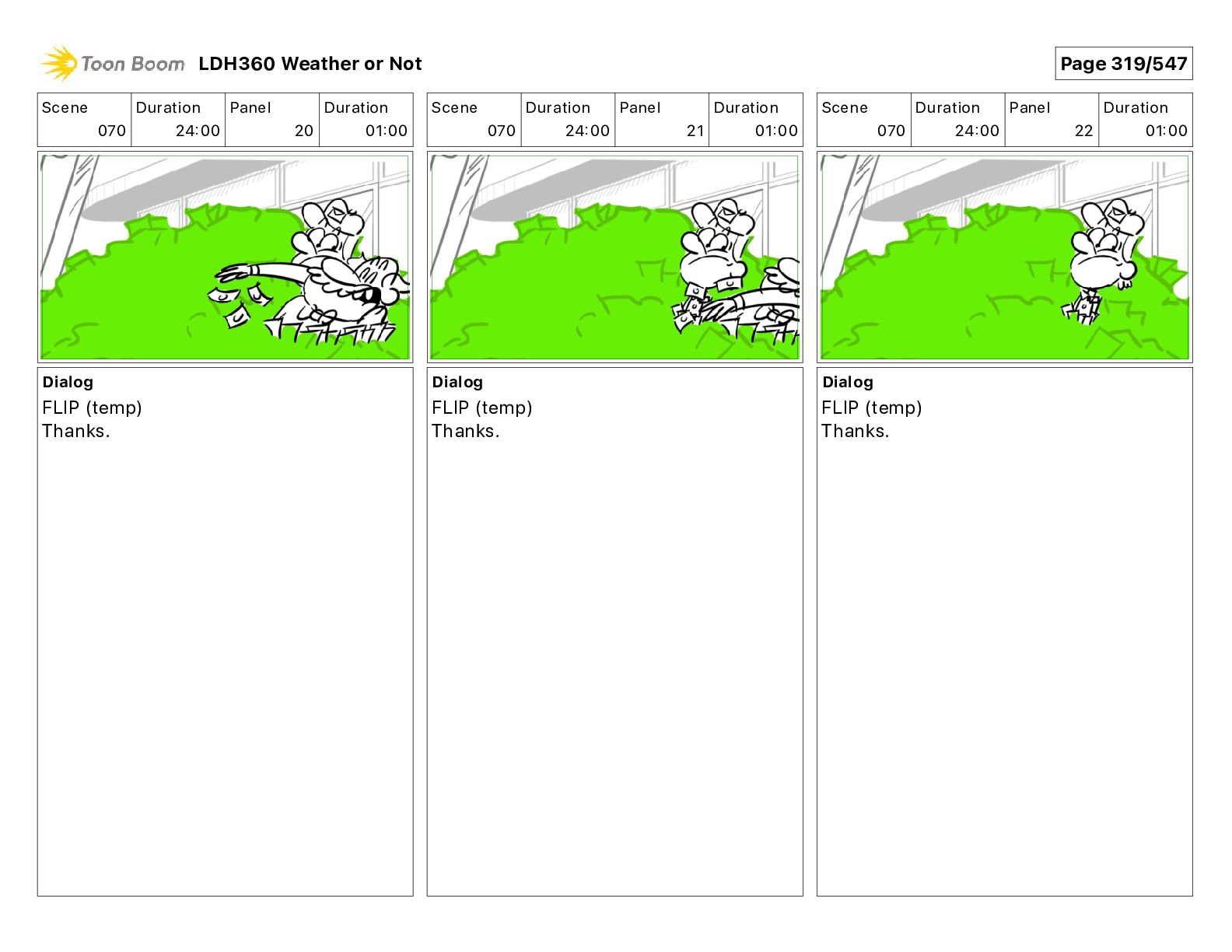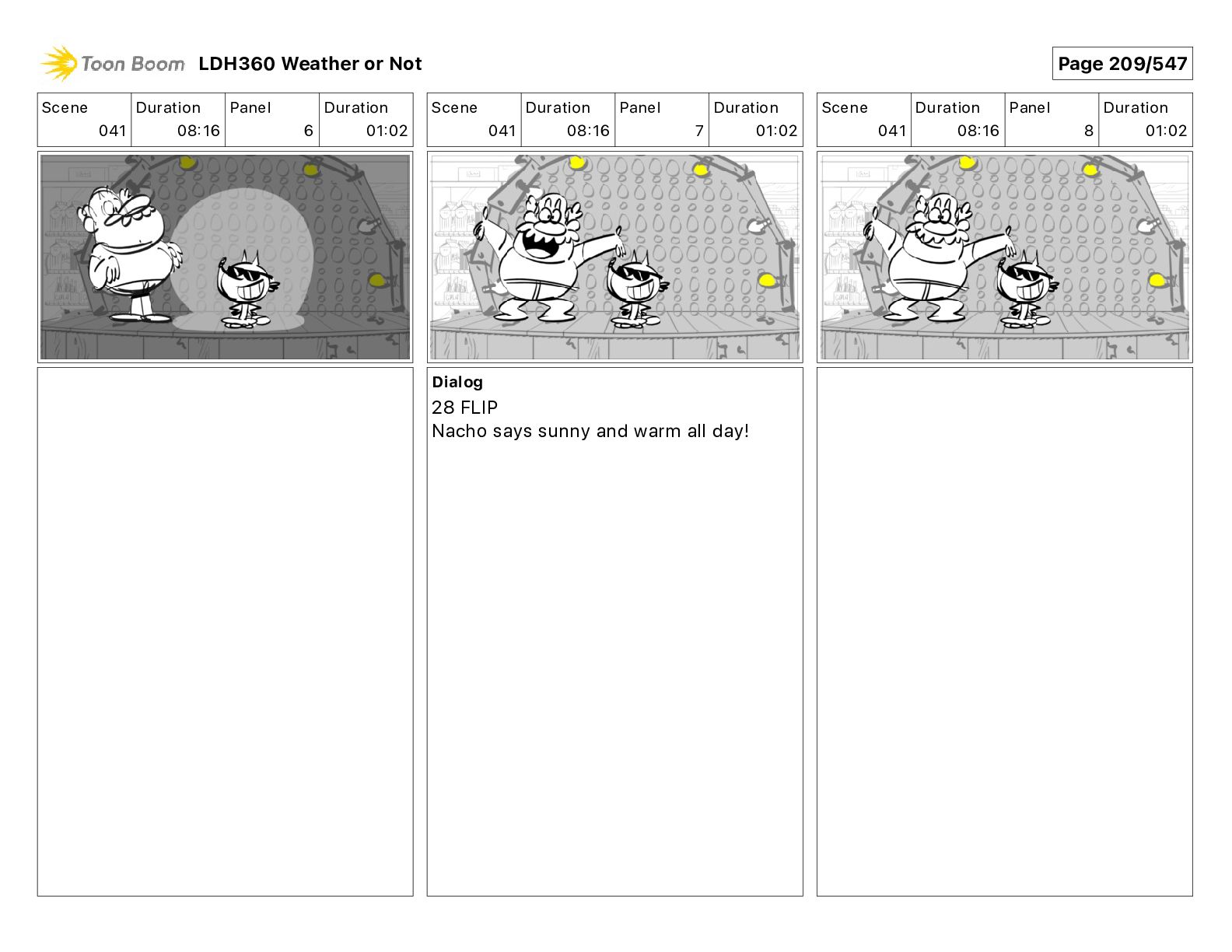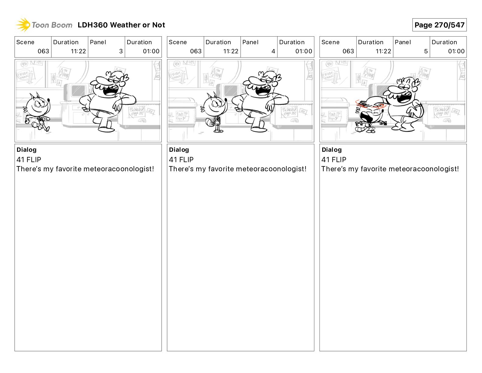 Dialog 14 FLIP Nacho says hold on to your keisters- Scene 020 Duration 18 22 Panel 12 Duration 01 11 Dialog 14 FLIP itʼs going to be windy. Scene 020 Duration 18 22 Panel 13 Duration 01 11 LDH360 Weather or Not Page 95/547