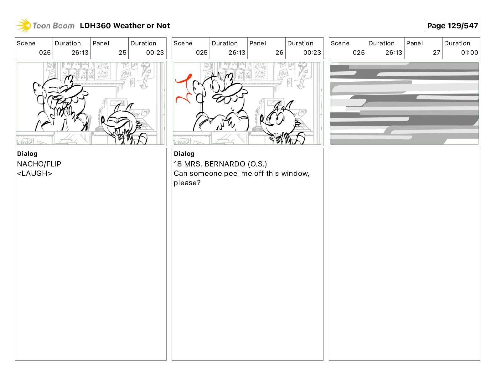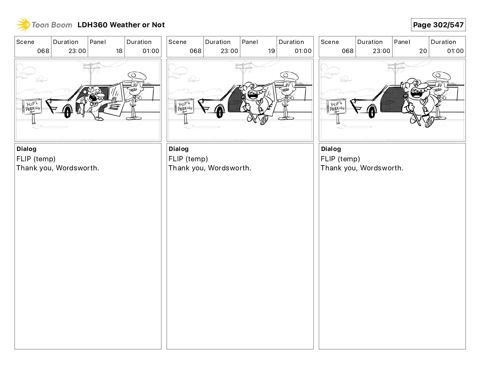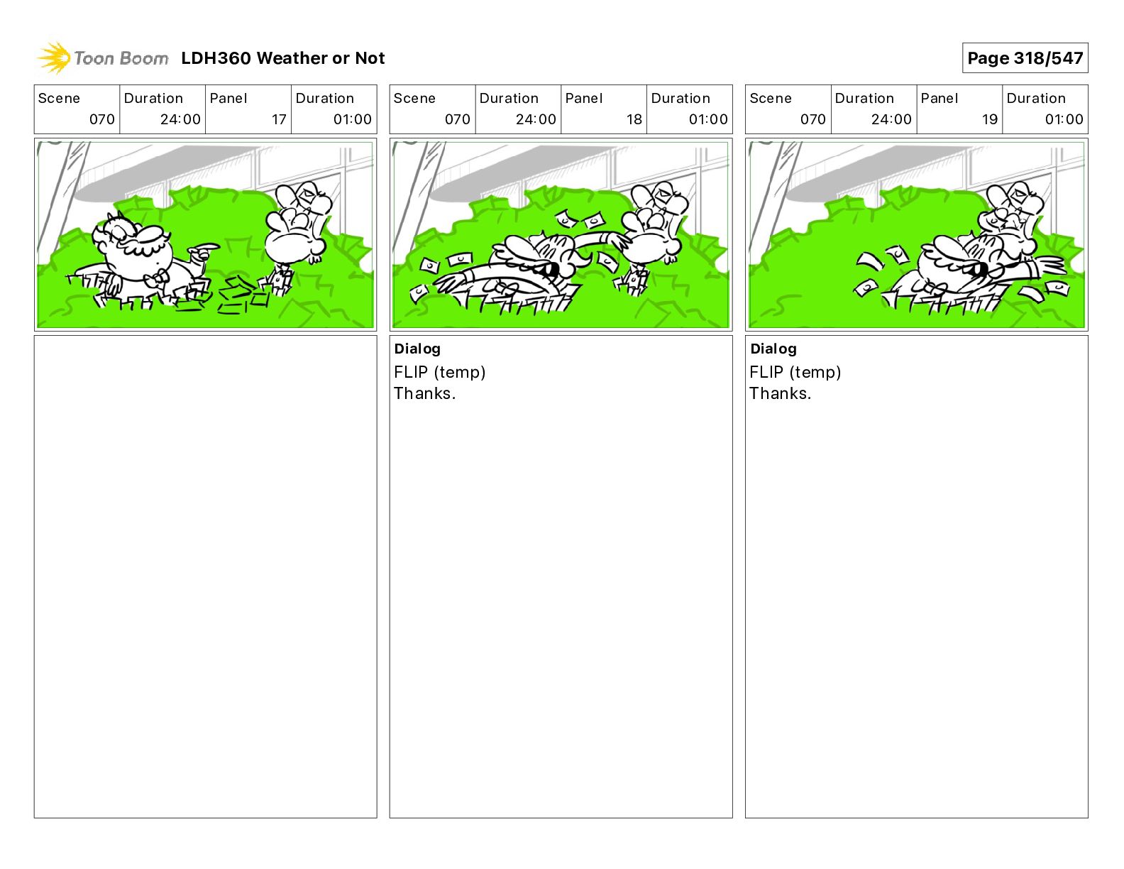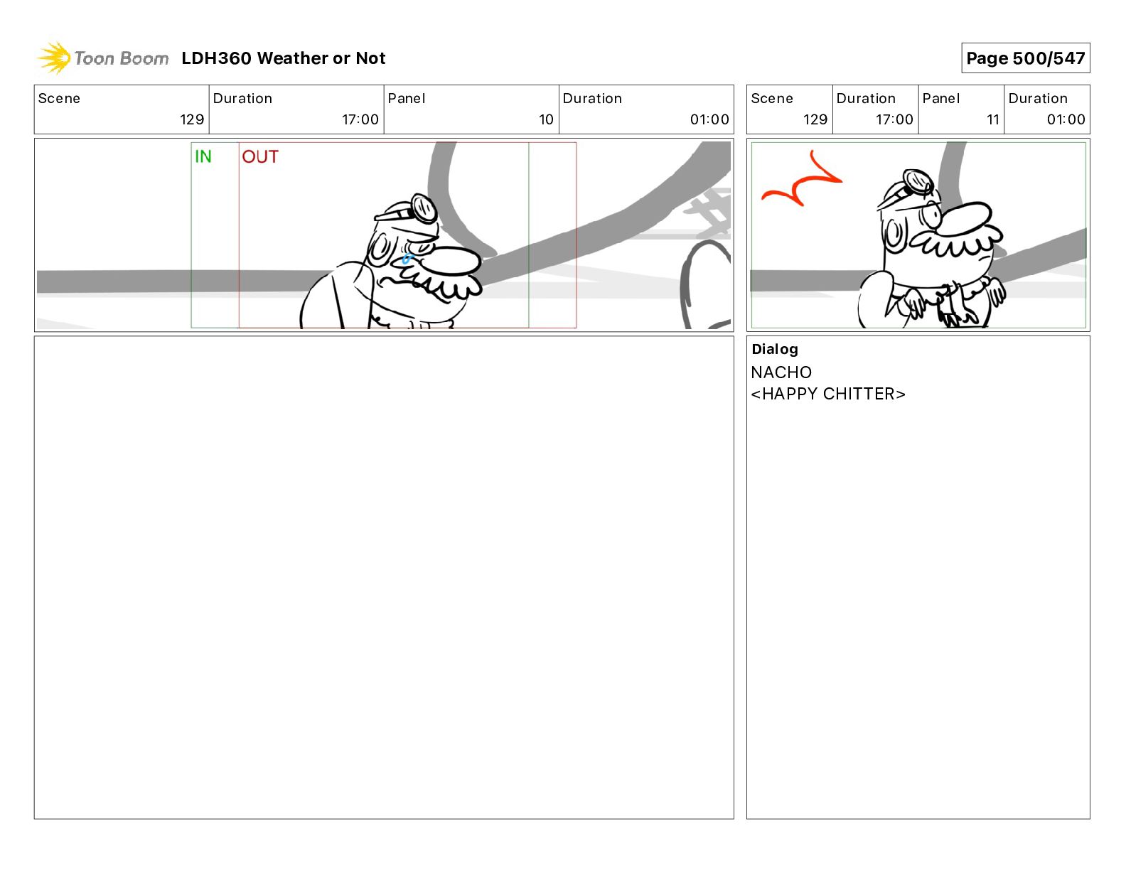 Dialog 14 FLIP Nacho says hold on to your keisters- Scene 020 Duration 18 22 Panel 12 Duration 01 11 Dialog 14 FLIP itʼs going to be windy. Scene 020 Duration 18 22 Panel 13 Duration 01 11 LDH360 Weather or Not Page 95/547
