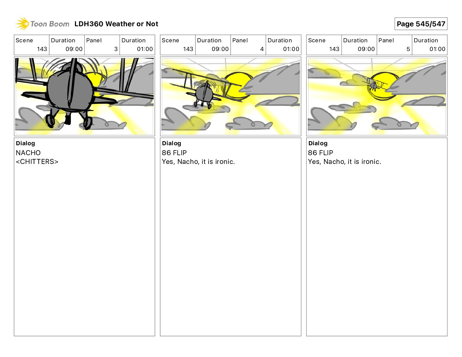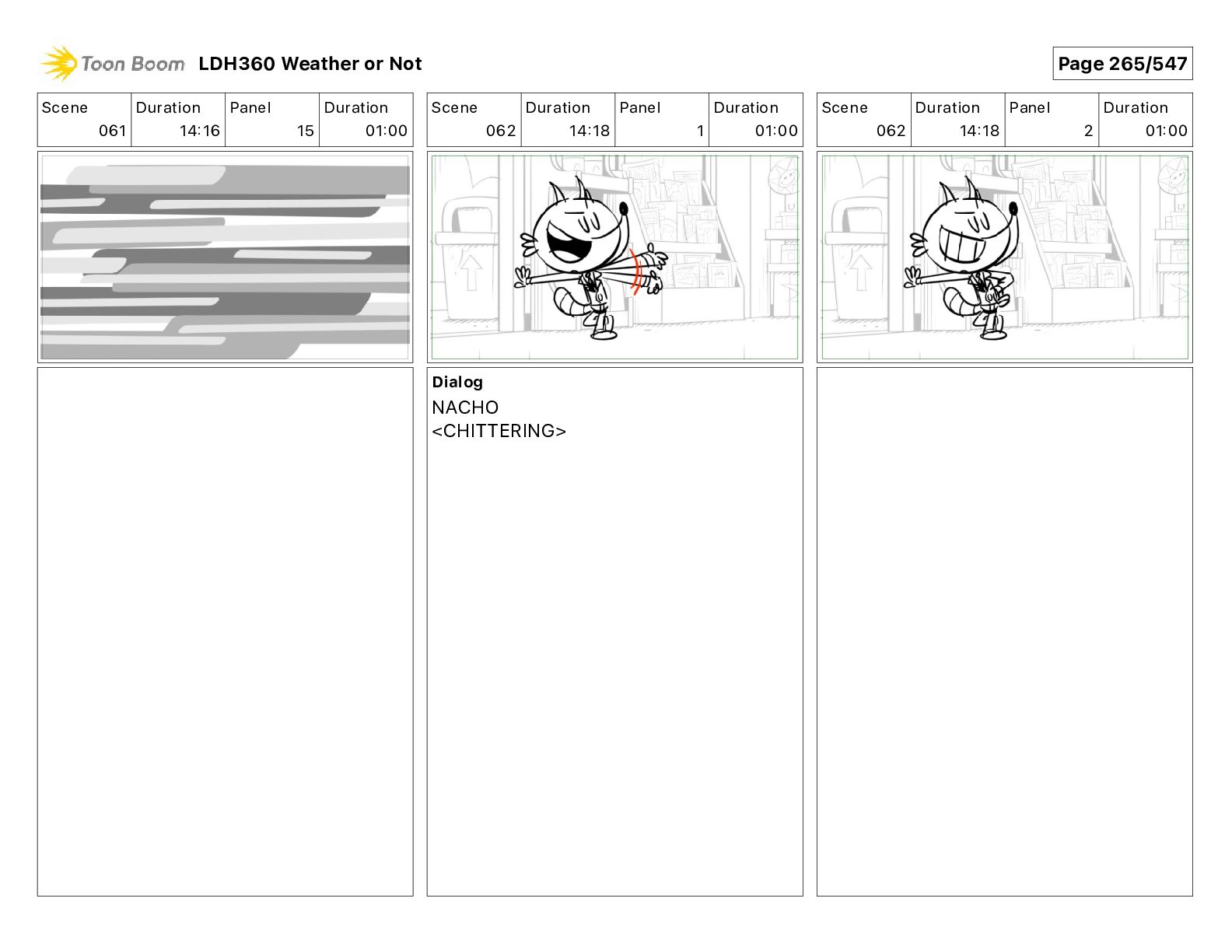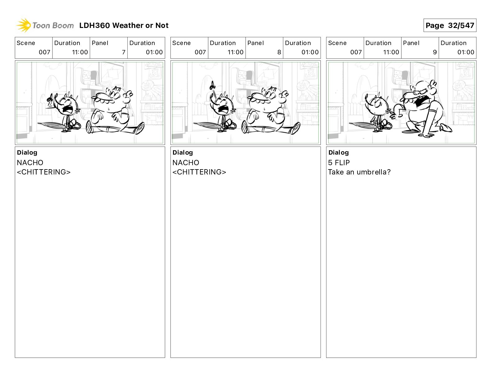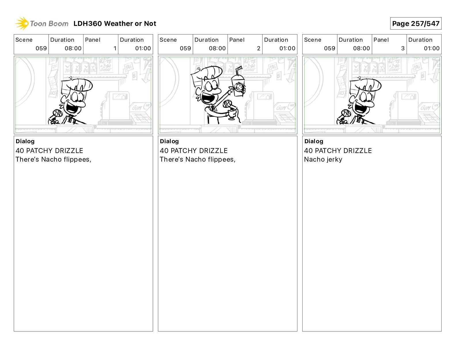Dialog 14 FLIP Nacho says hold on to your keisters- Scene 020 Duration 18 22 Panel 12 Duration 01 11 Dialog 14 FLIP itʼs going to be windy. Scene 020 Duration 18 22 Panel 13 Duration 01 11 LDH360 Weather or Not Page 95/547