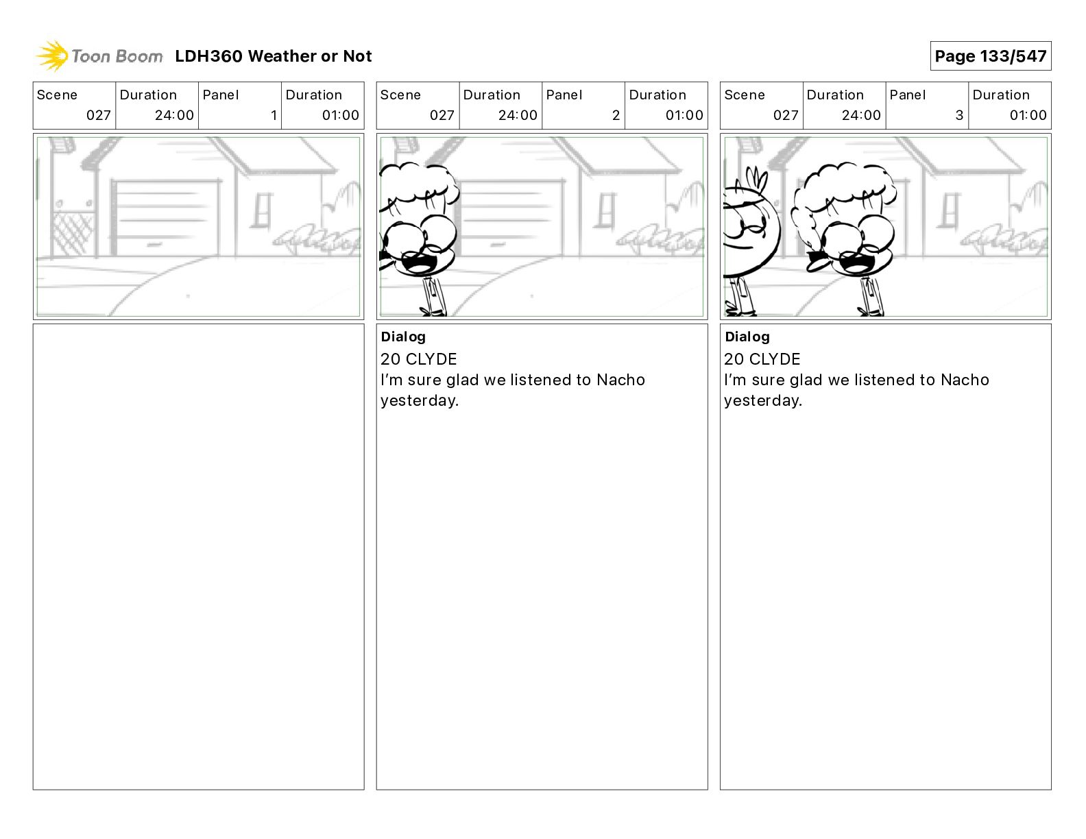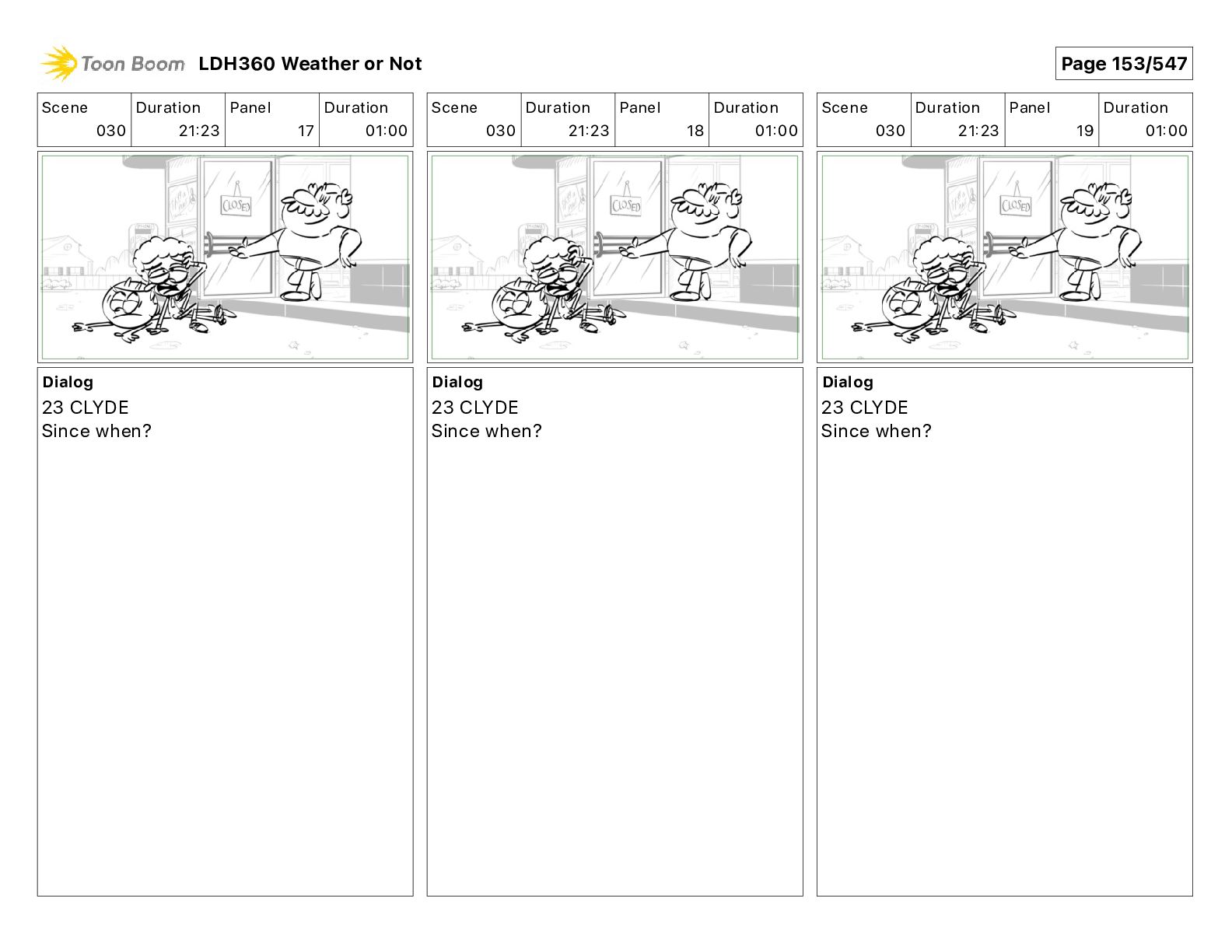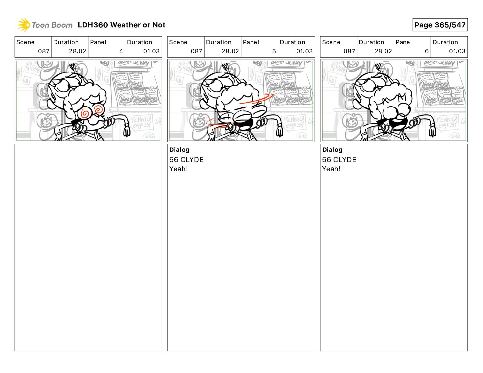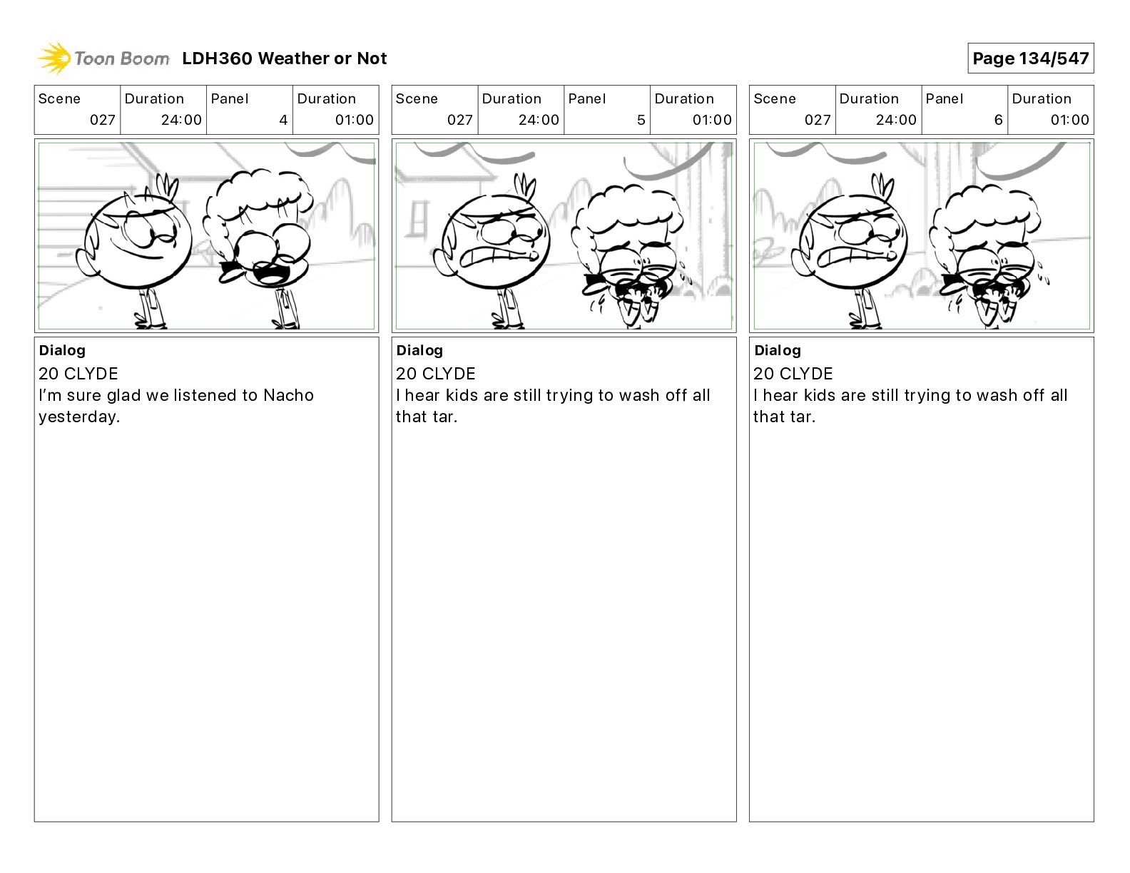 Dialog 20 CLYDE Iʼm sure glad we listened to Nacho yesterday. Scene 027 Duration 24 00 Panel 5 Duration 01 00 Dialog 20 CLYDE I hear kids are still trying to wash off all that tar. Scene 027 Duration 24 00 Panel 6 Duration 01 00 Dialog 20 CLYDE I hear kids are still trying to wash off all that tar. LDH360 Weather or Not Page 134/547