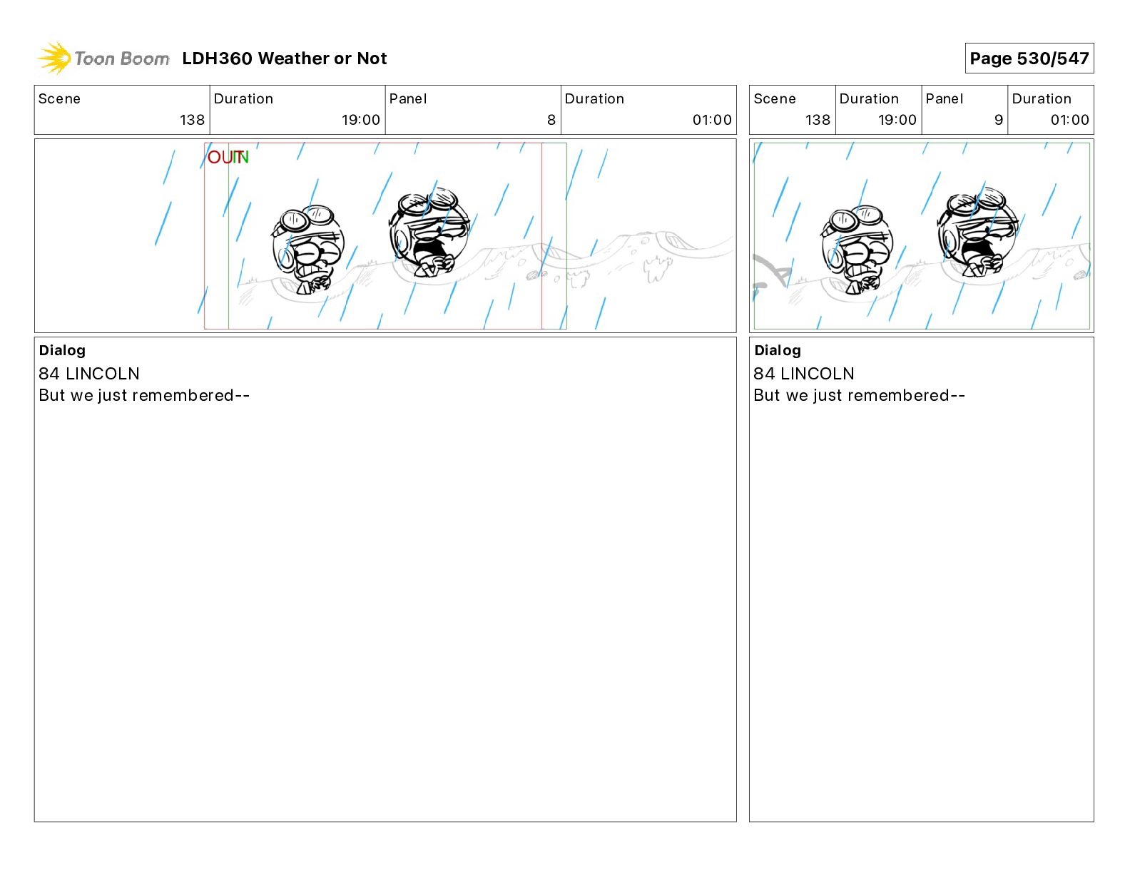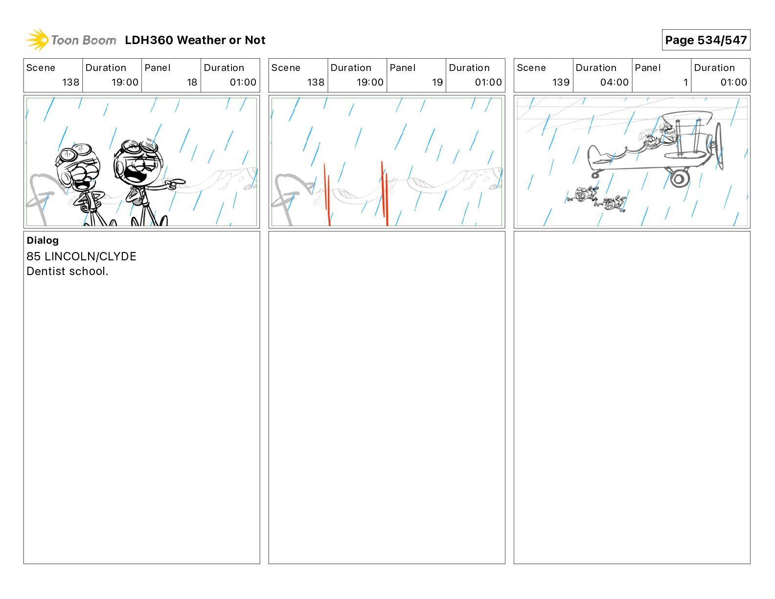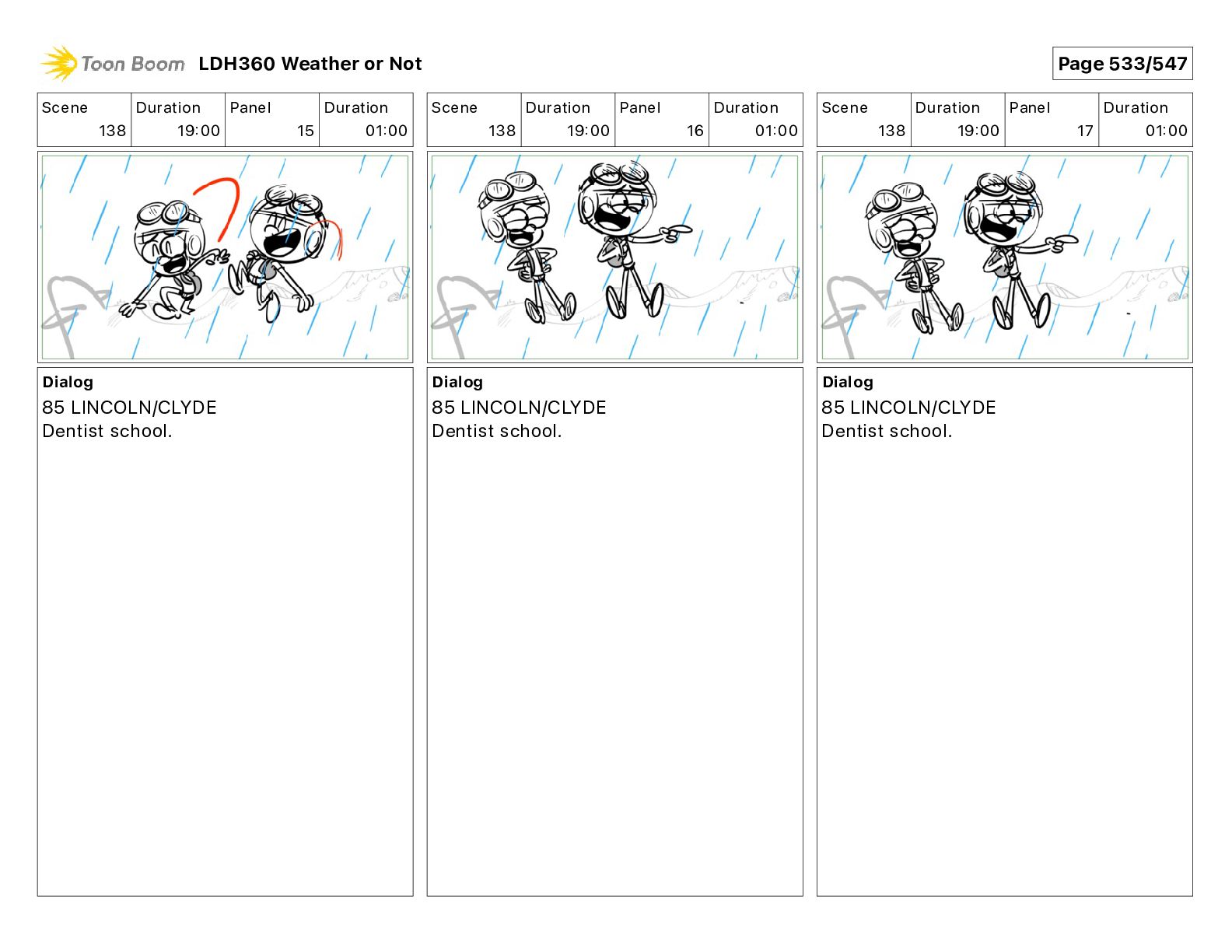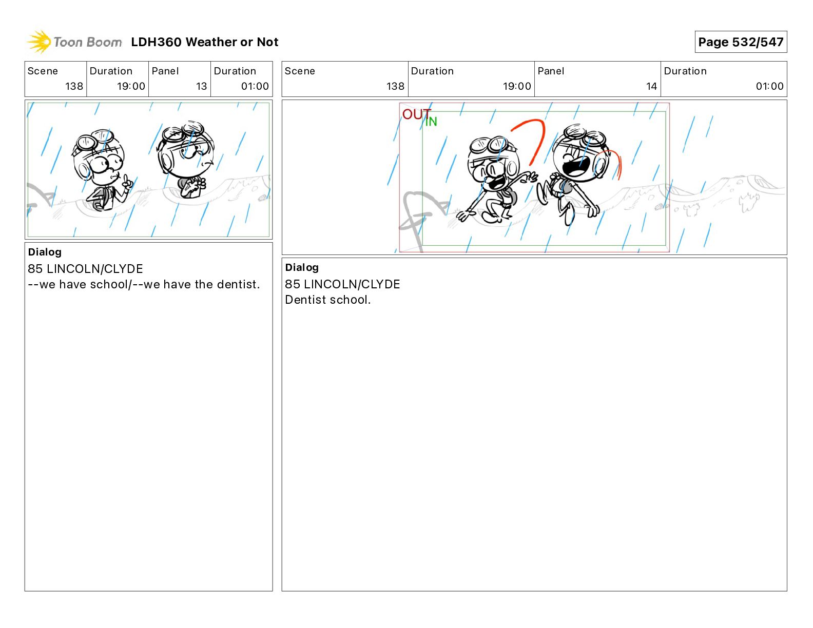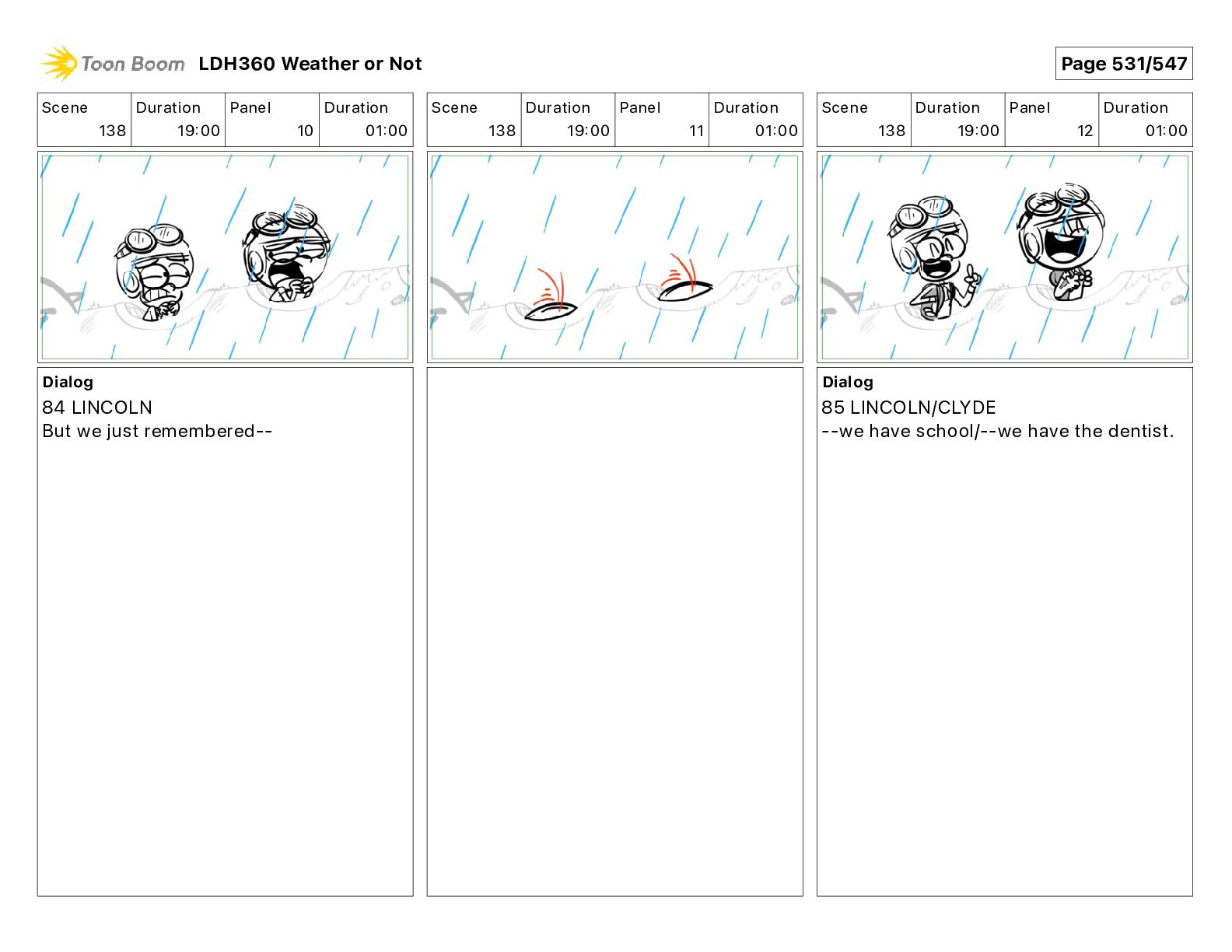 Dialog 84 LINCOLN But we just remembered-- Scene 138 Duration 19 00 Panel 11 Duration 01 00 Scene 138 Duration 19 00 Panel 12 Duration 01 00 Dialog 85 LINCOLN/CLYDE --we have school/--we have the dentist. LDH360 Weather or Not Page 531/547