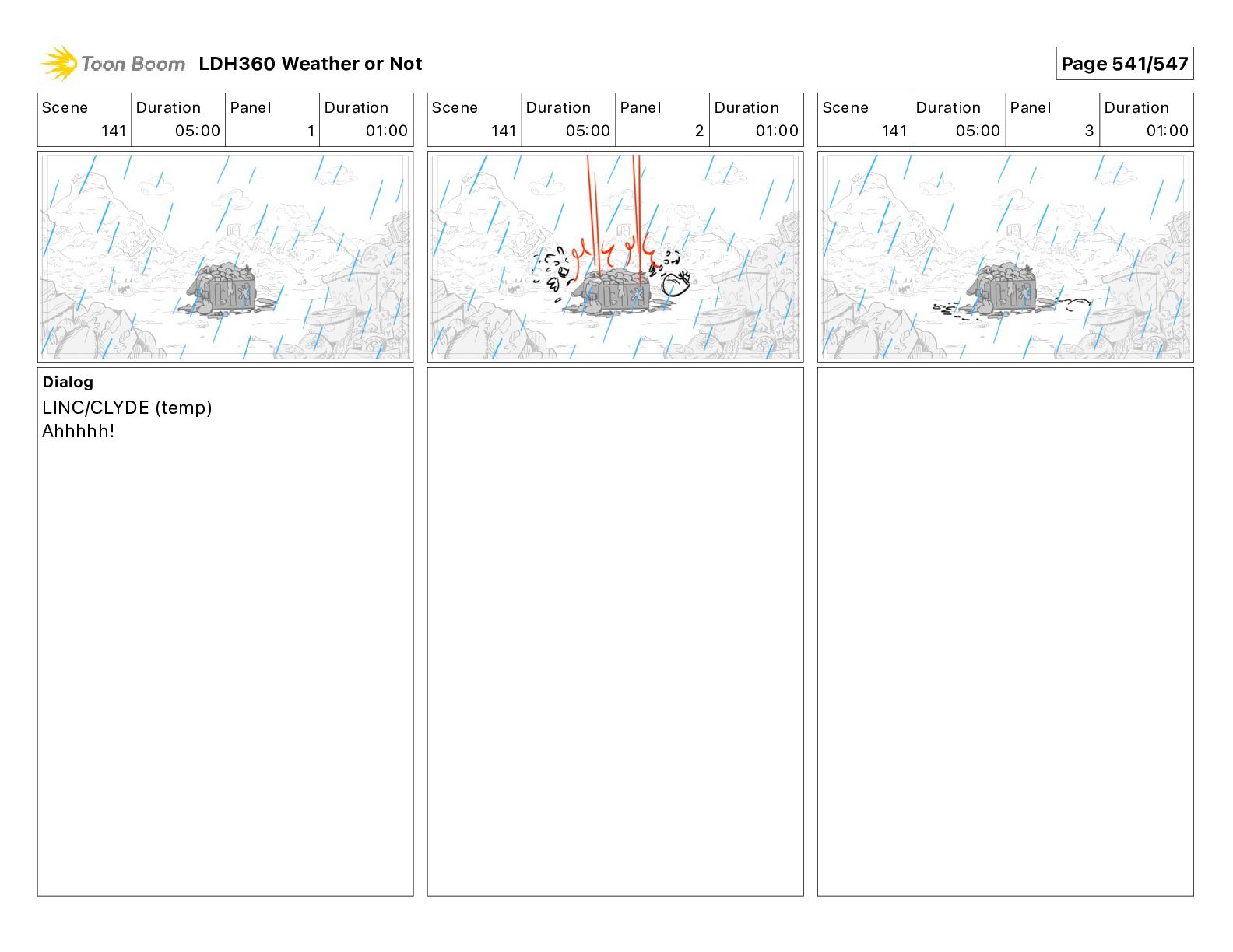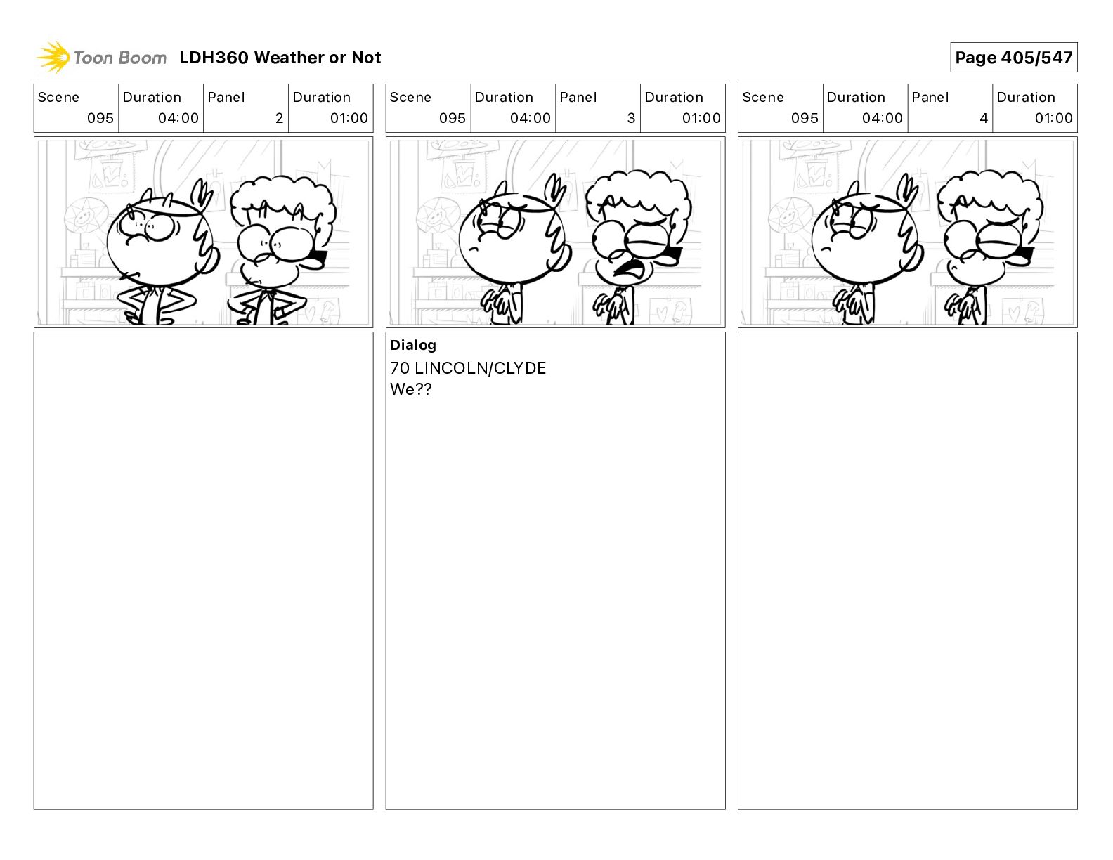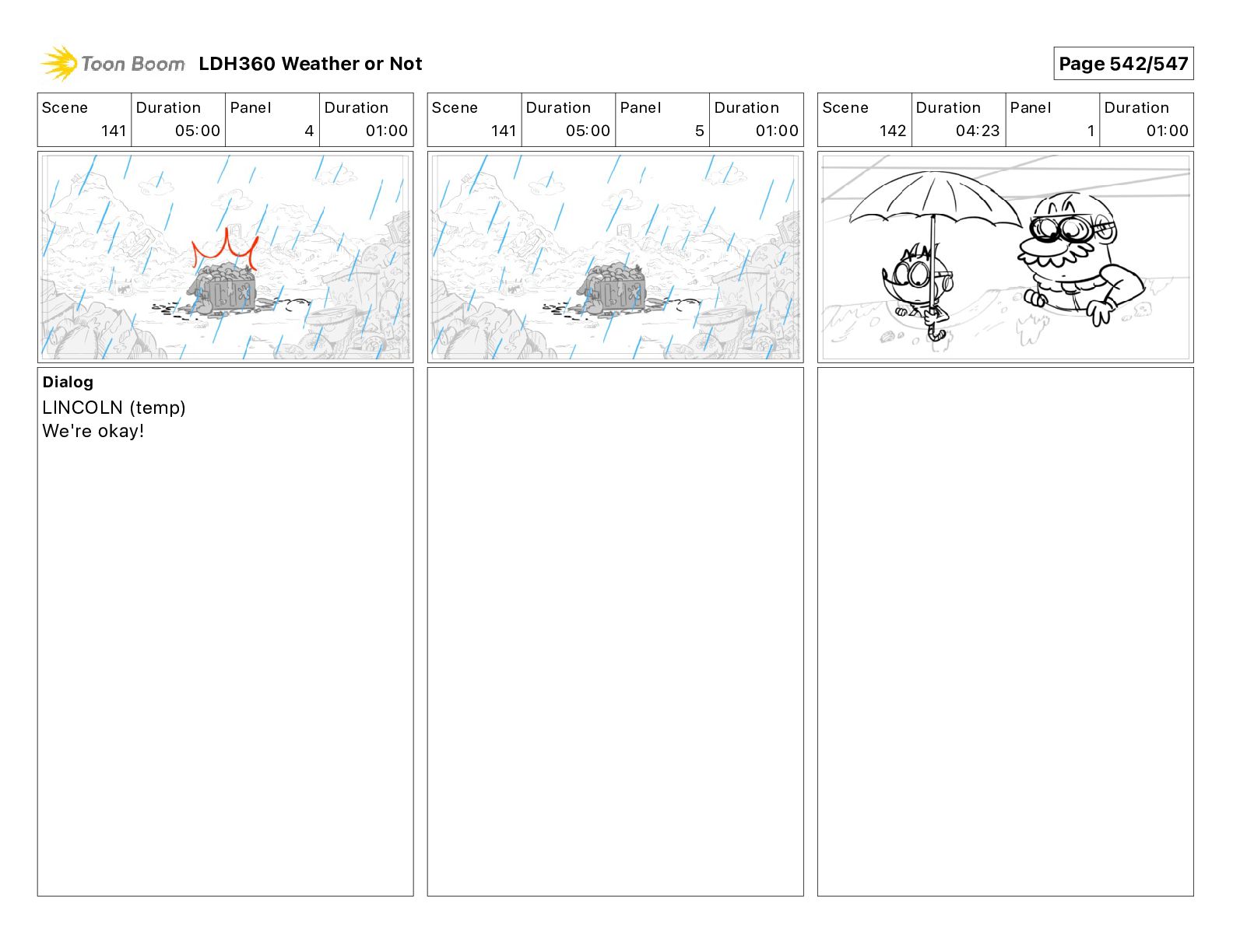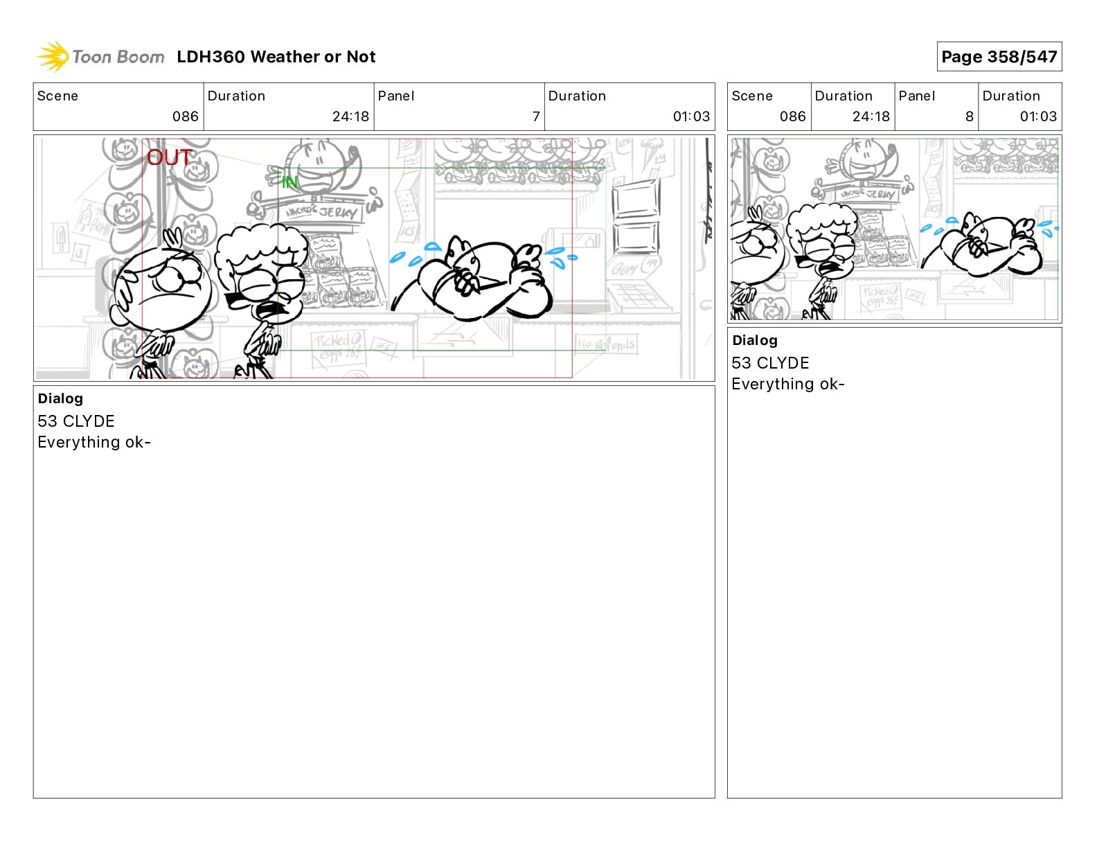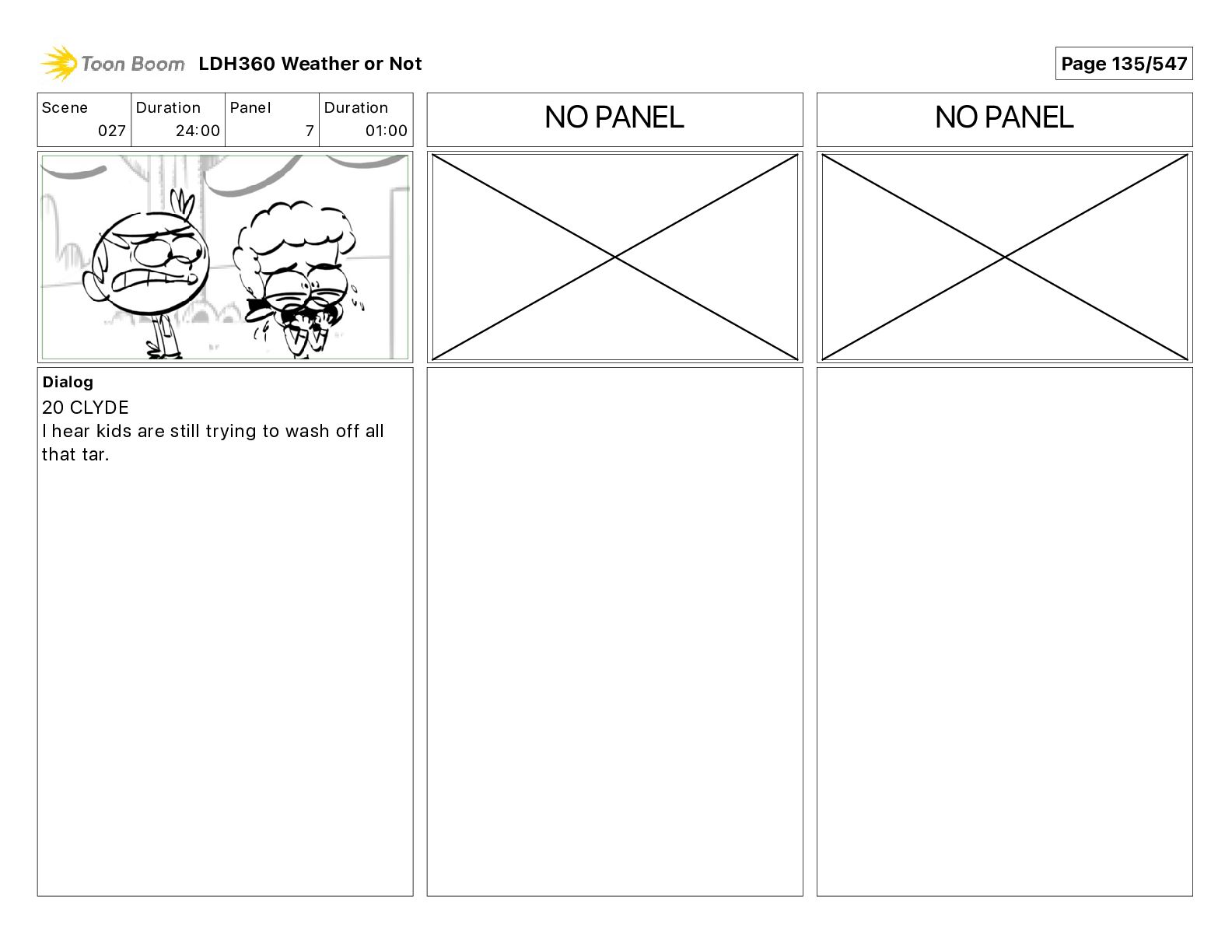 Dialog 84 LINCOLN But we just remembered-- Scene 138 Duration 19 00 Panel 11 Duration 01 00 Scene 138 Duration 19 00 Panel 12 Duration 01 00 Dialog 85 LINCOLN/CLYDE --we have school/--we have the dentist. LDH360 Weather or Not Page 531/547