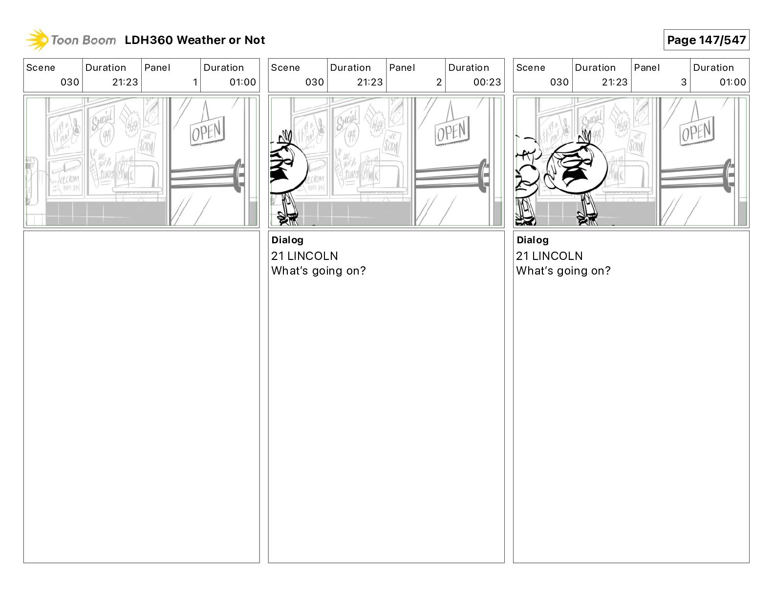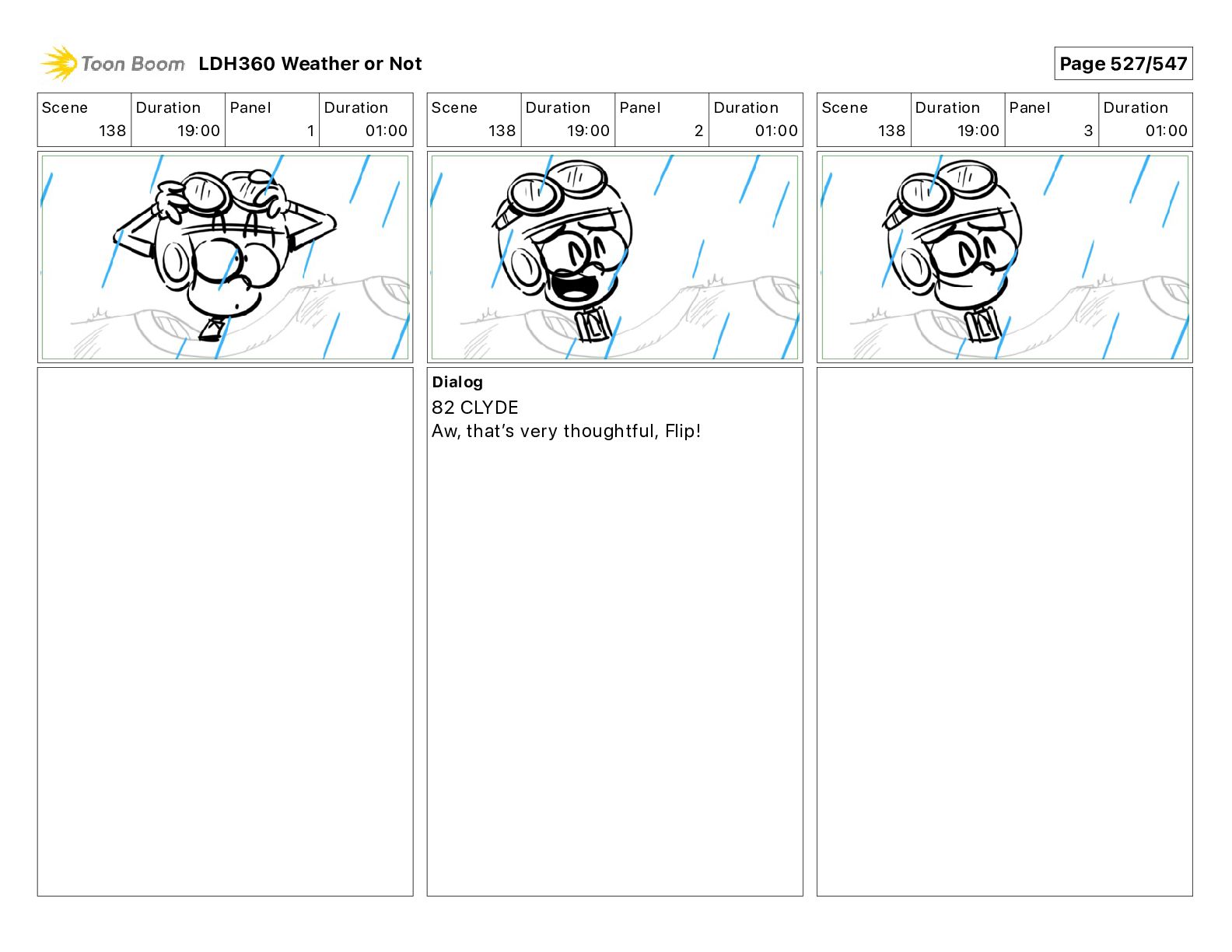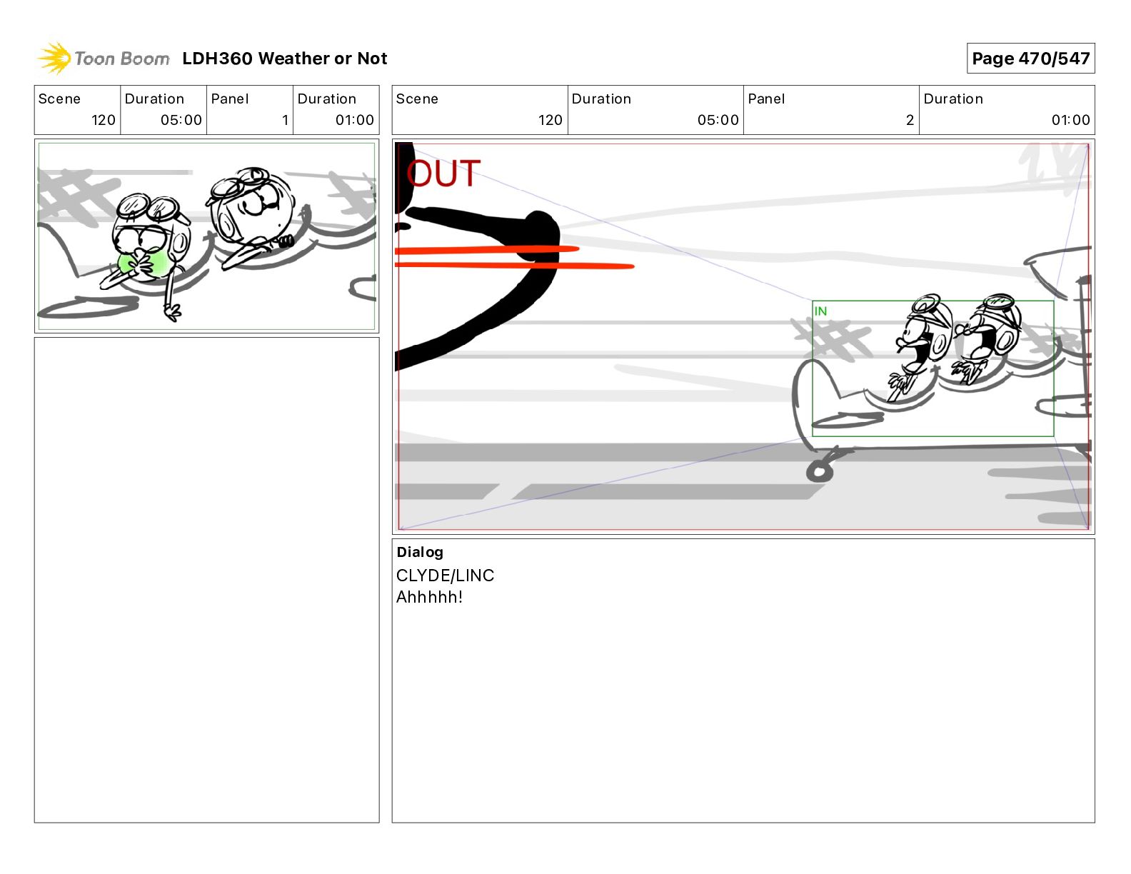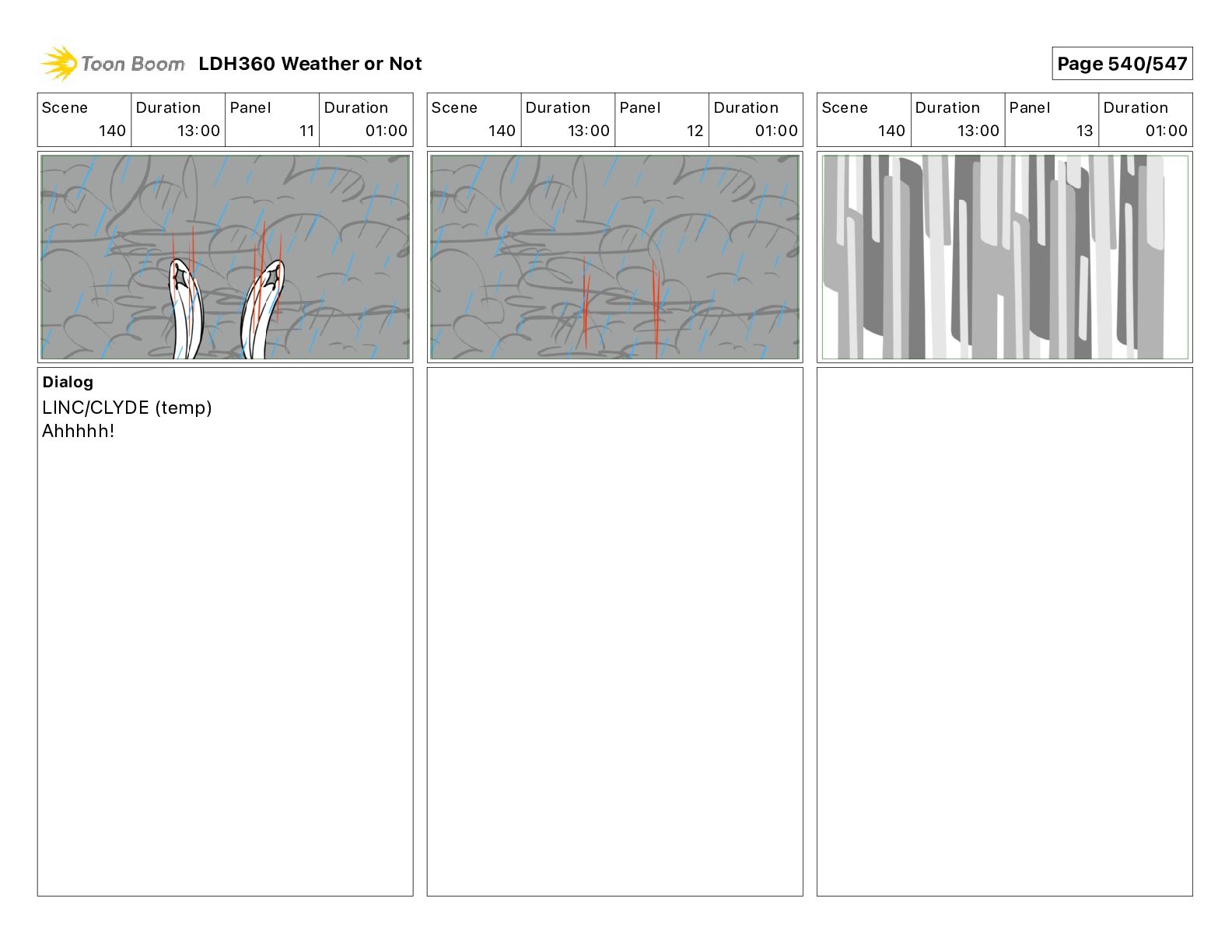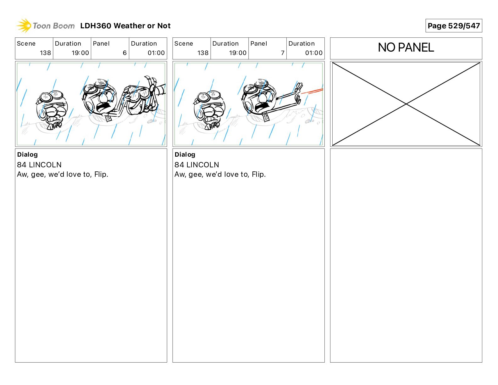 Dialog 84 LINCOLN But we just remembered-- Scene 138 Duration 19 00 Panel 11 Duration 01 00 Scene 138 Duration 19 00 Panel 12 Duration 01 00 Dialog 85 LINCOLN/CLYDE --we have school/--we have the dentist. LDH360 Weather or Not Page 531/547
