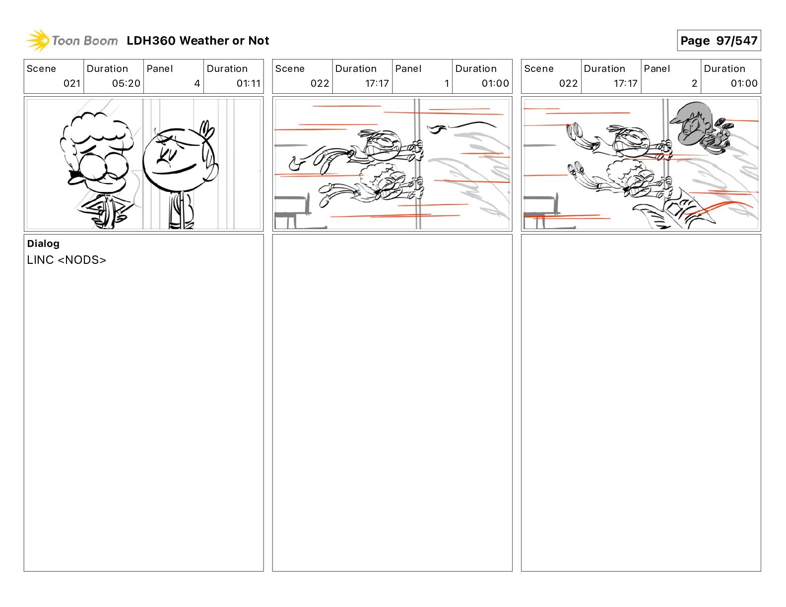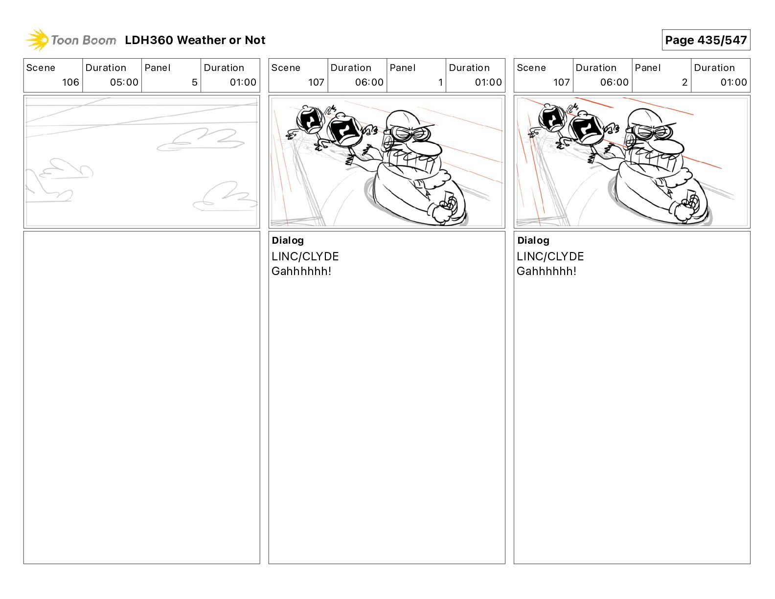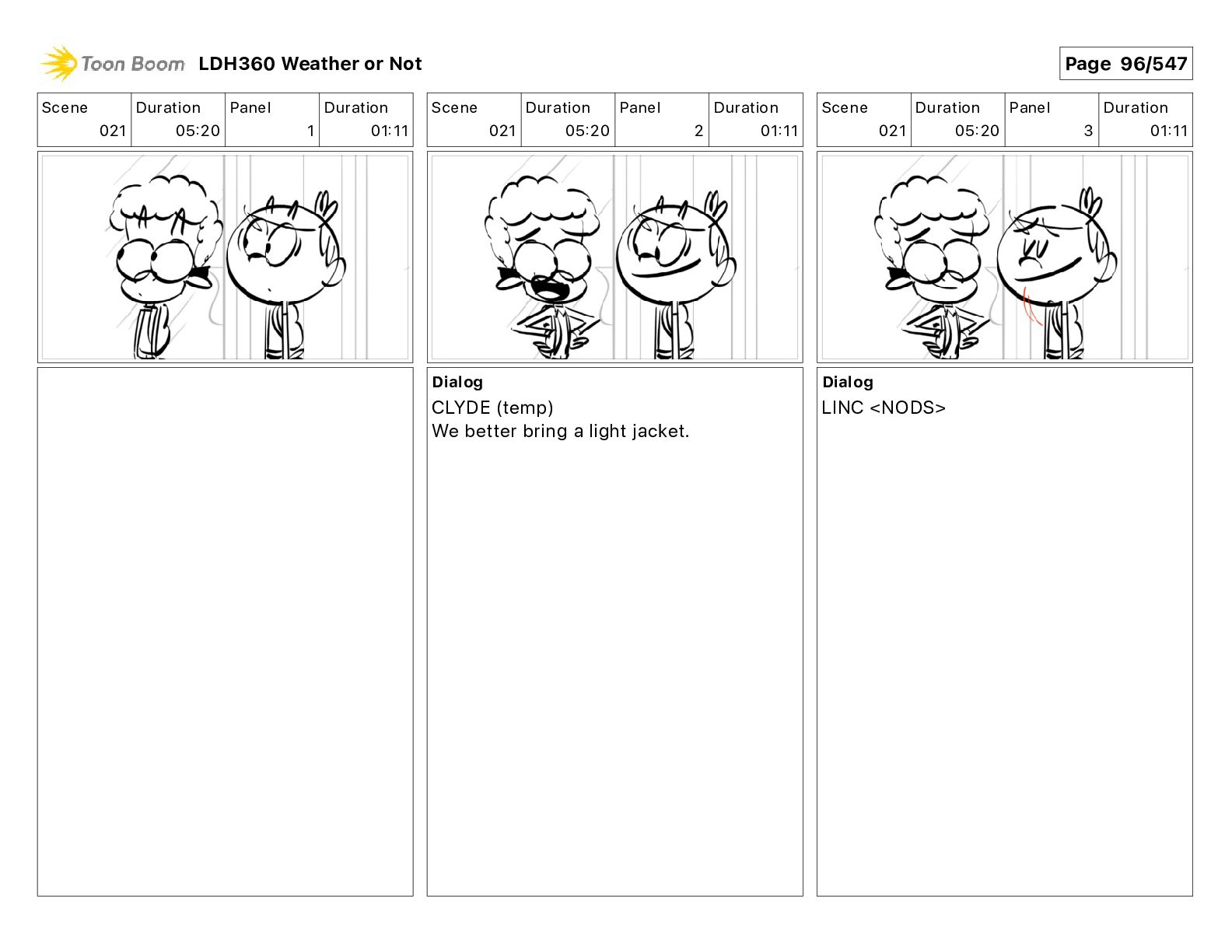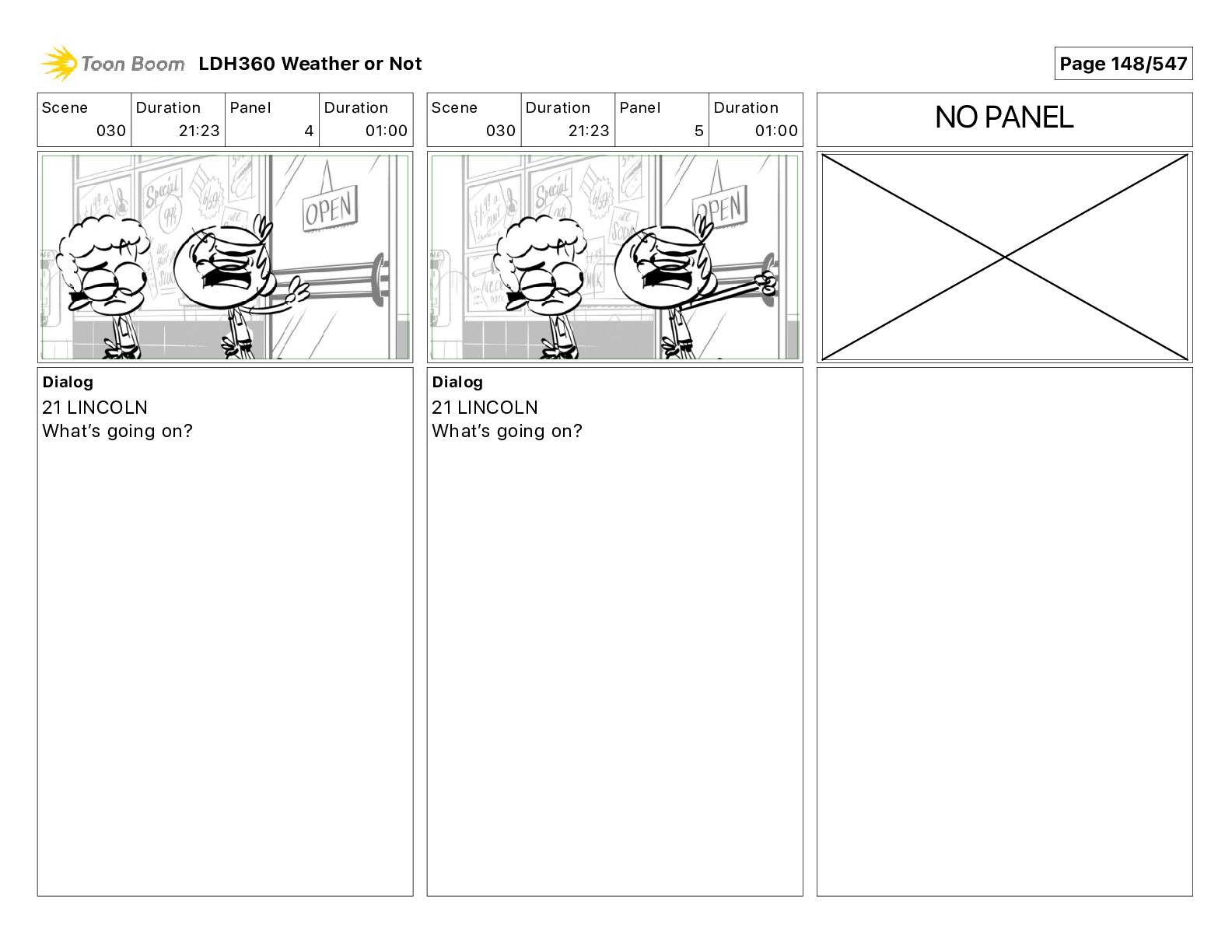 Dialog 84 LINCOLN But we just remembered-- Scene 138 Duration 19 00 Panel 11 Duration 01 00 Scene 138 Duration 19 00 Panel 12 Duration 01 00 Dialog 85 LINCOLN/CLYDE --we have school/--we have the dentist. LDH360 Weather or Not Page 531/547