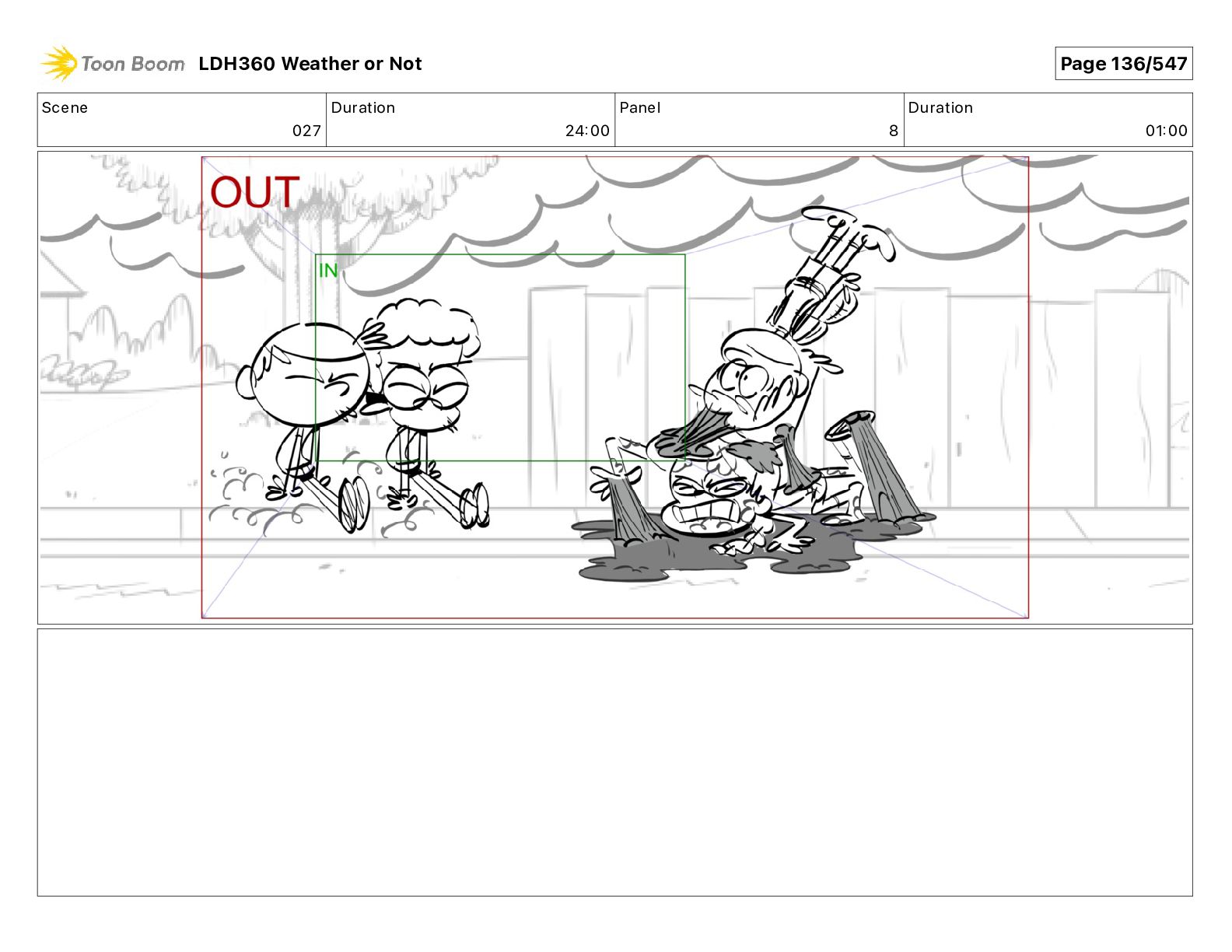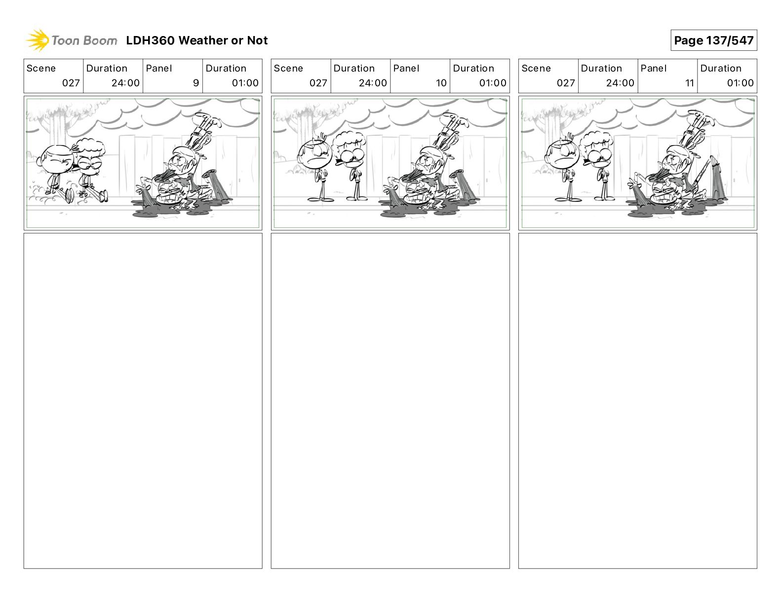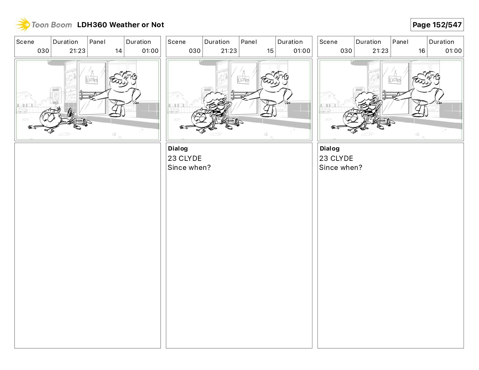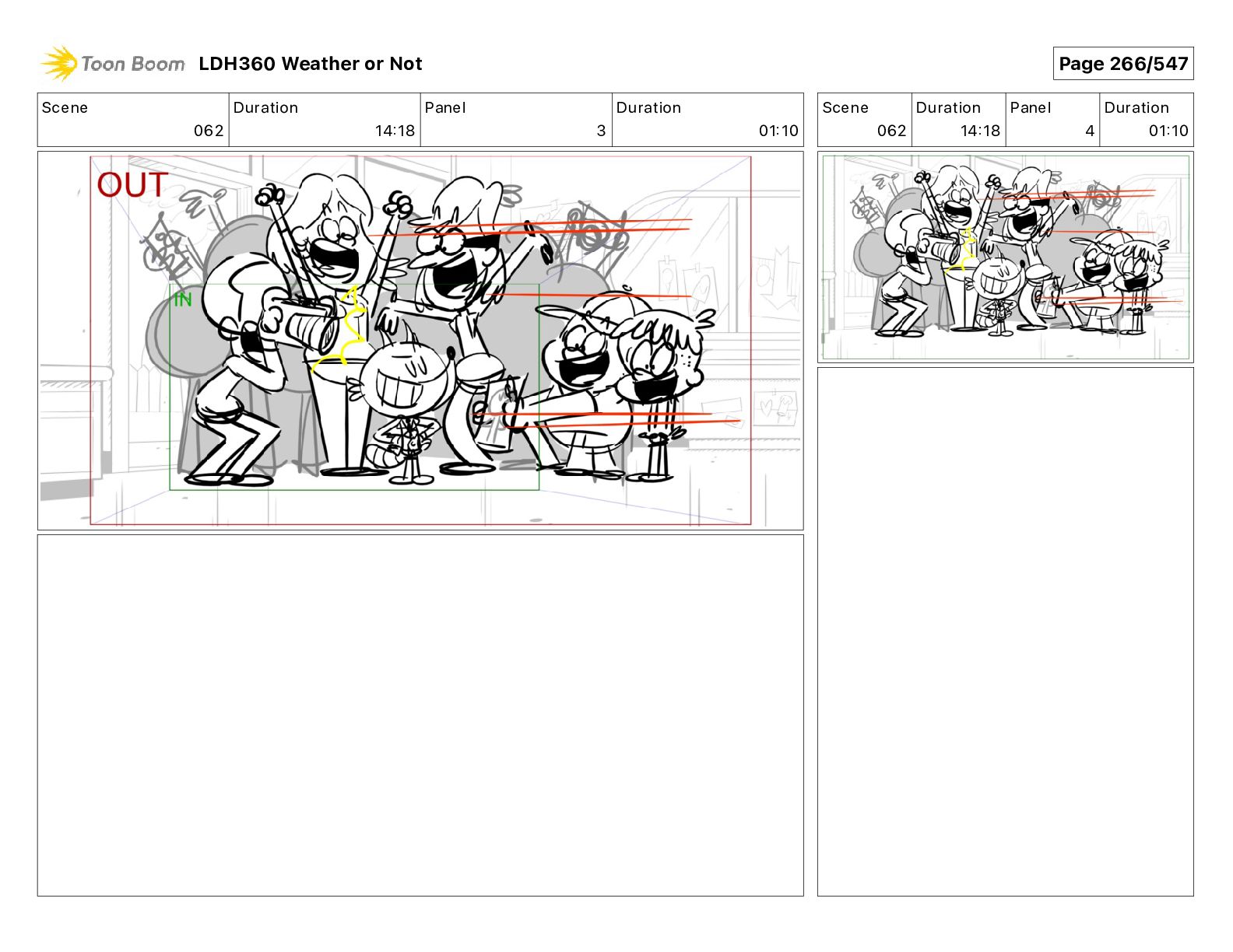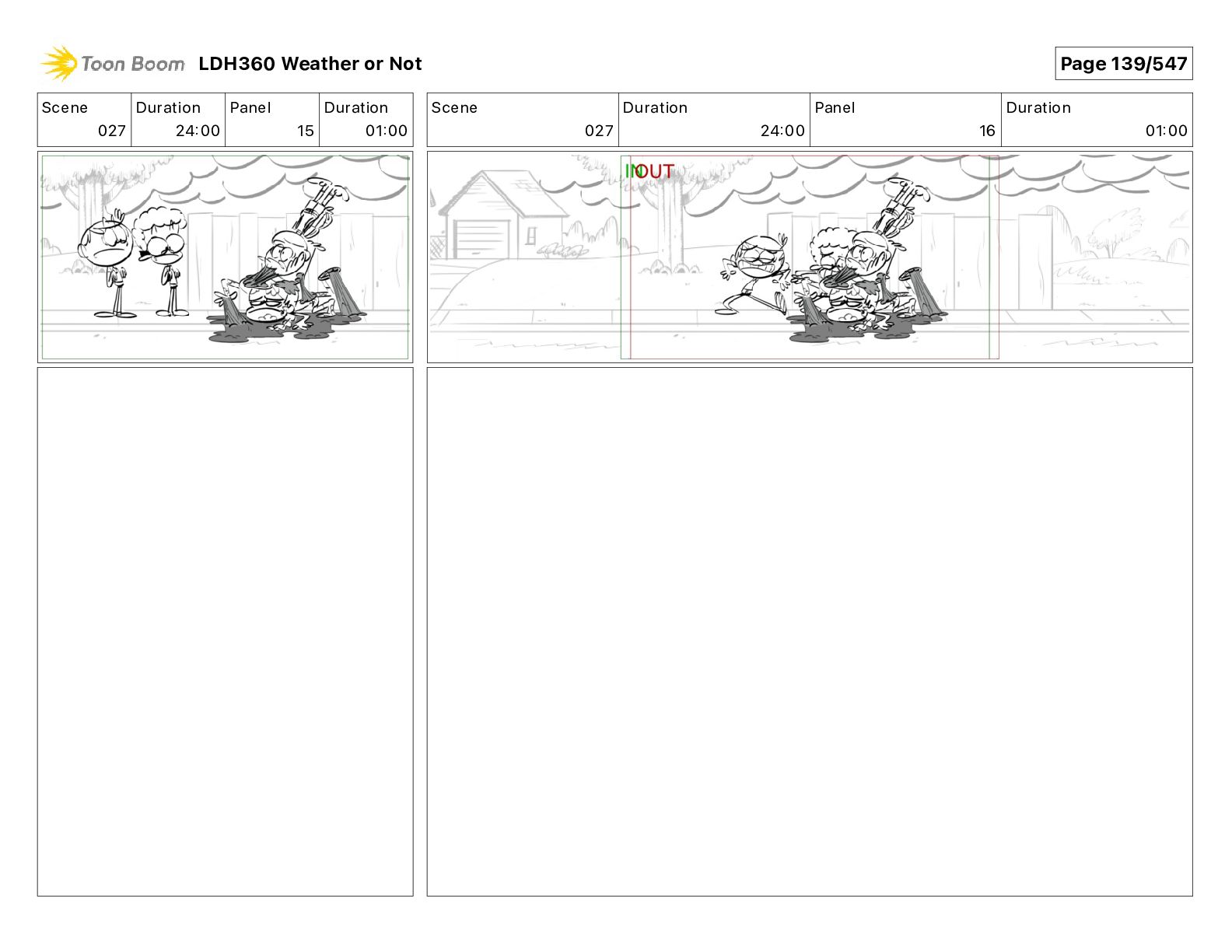 Dialog 84 LINCOLN But we just remembered-- Scene 138 Duration 19 00 Panel 11 Duration 01 00 Scene 138 Duration 19 00 Panel 12 Duration 01 00 Dialog 85 LINCOLN/CLYDE --we have school/--we have the dentist. LDH360 Weather or Not Page 531/547