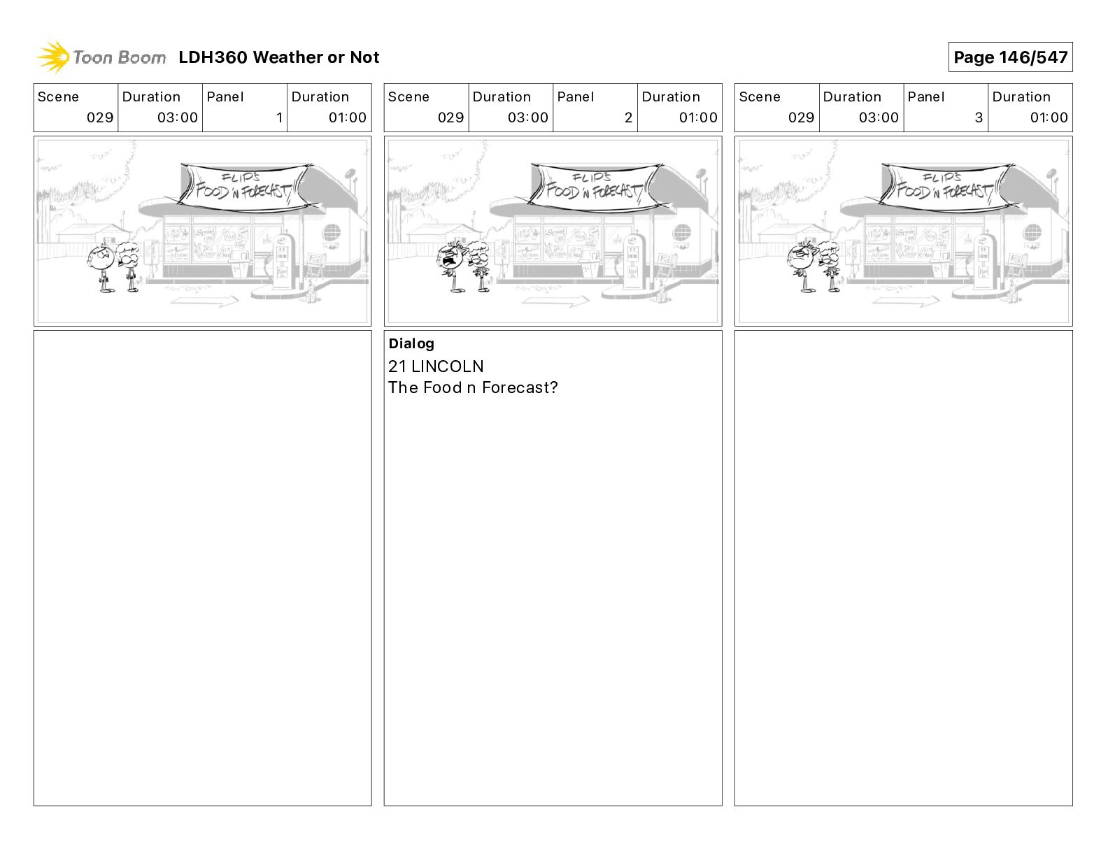 Scene 029 Duration 03 00 Panel 2 Duration 01 00 Dialog 21 LINCOLN The Food n Forecast? Scene 029 Duration 03 00 Panel 3 Duration 01 00 LDH360 Weather or Not Page 146/547