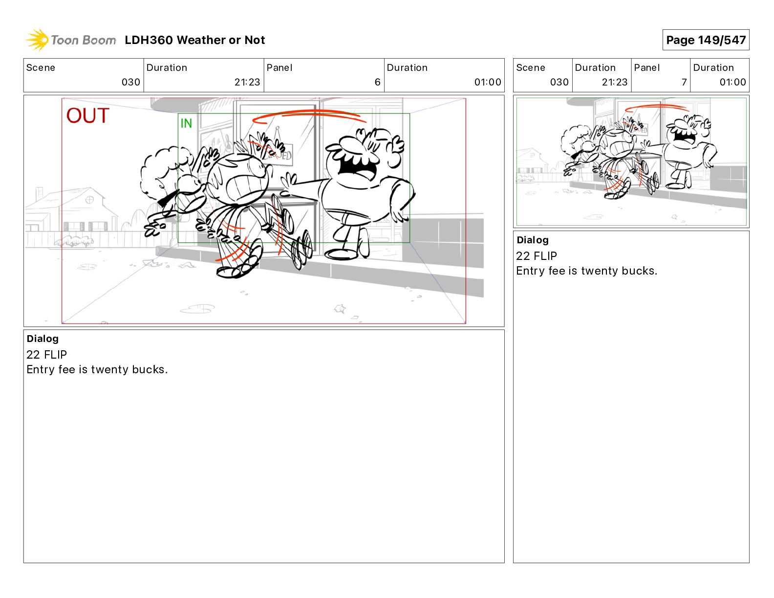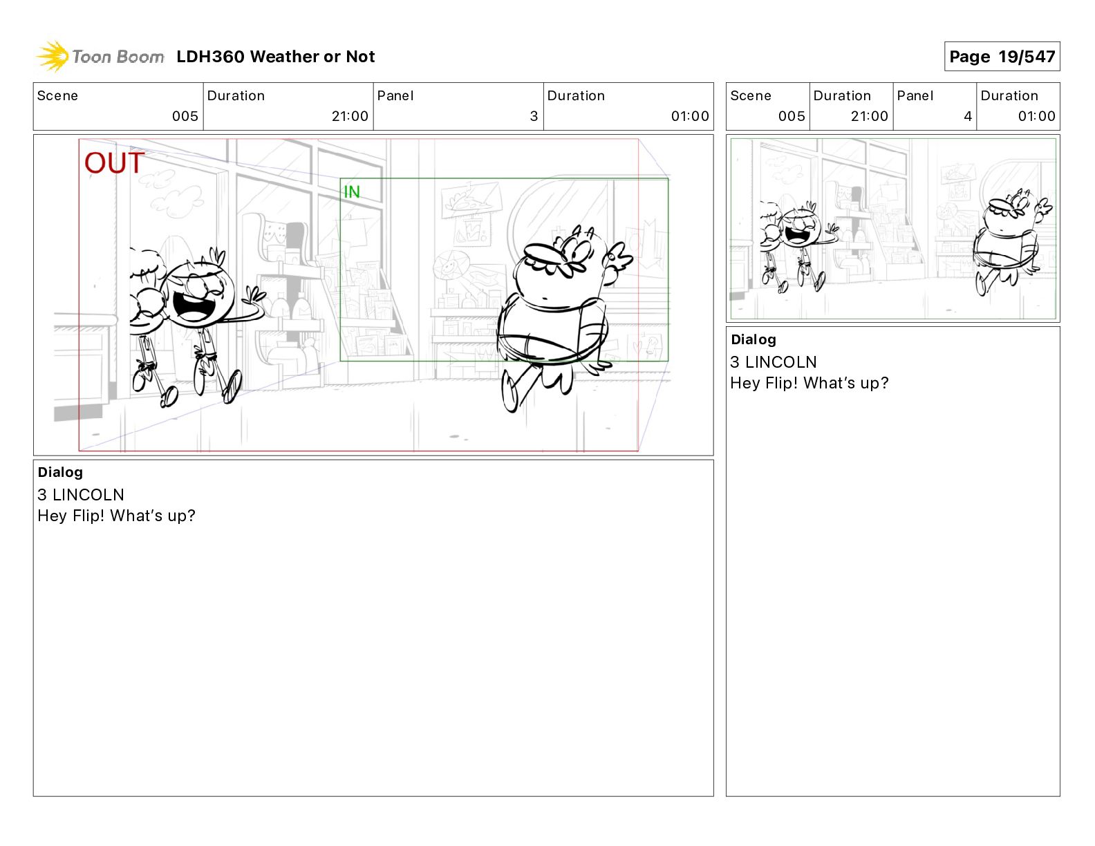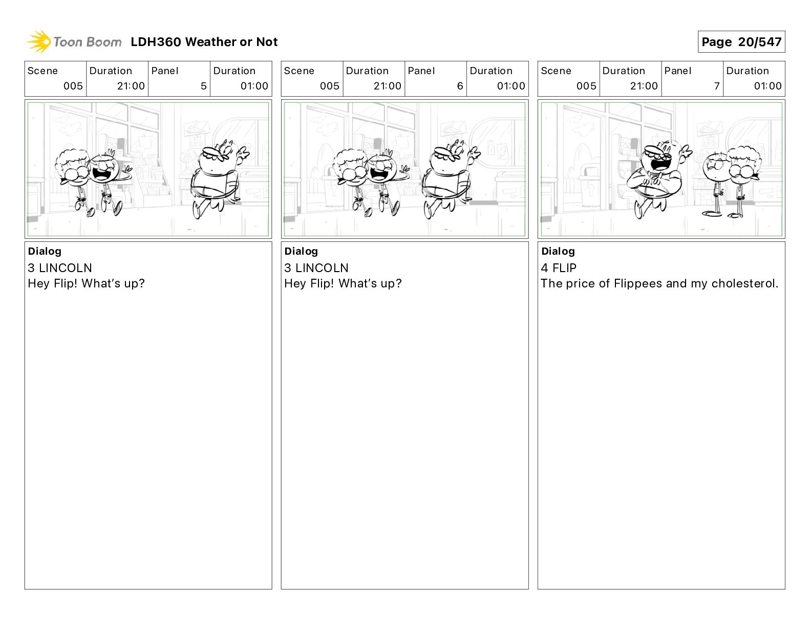 Dialog 3 LINCOLN Hey Flip! Whatʼs up? Scene 005 Duration 21 00 Panel 6 Duration 01 00 Dialog 3 LINCOLN Hey Flip! Whatʼs up? Scene 005 Duration 21 00 Panel 7 Duration 01 00 Dialog 4 FLIP The price of Flippees and my cholesterol. LDH360 Weather or Not Page 20/547
