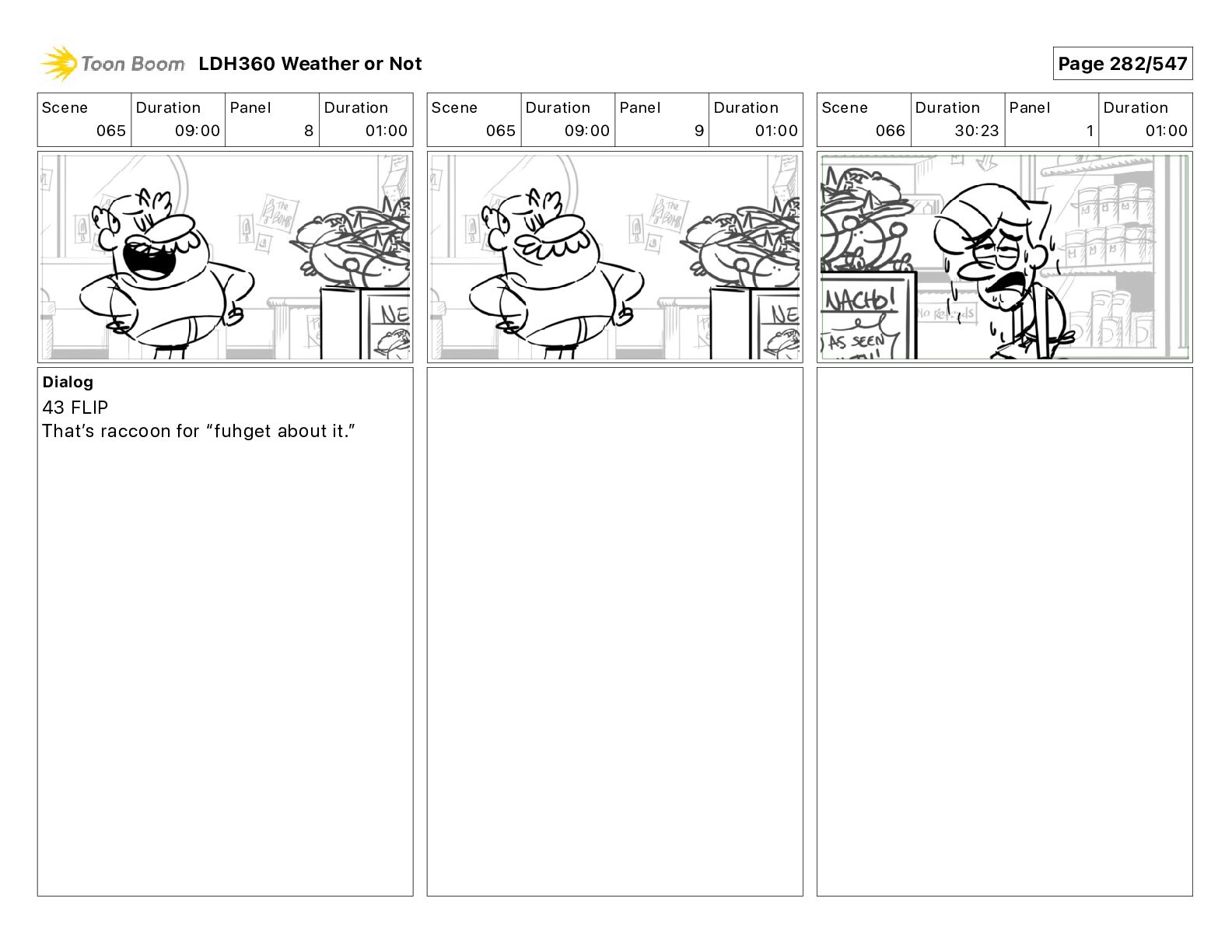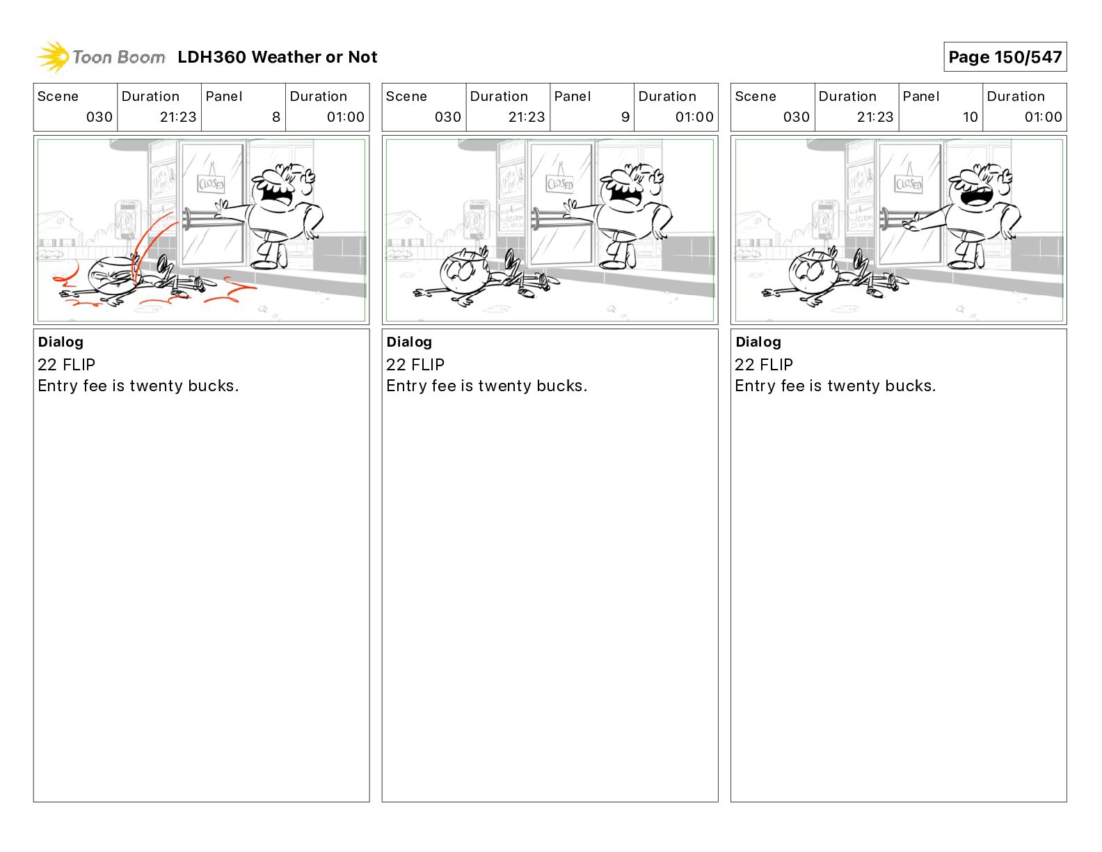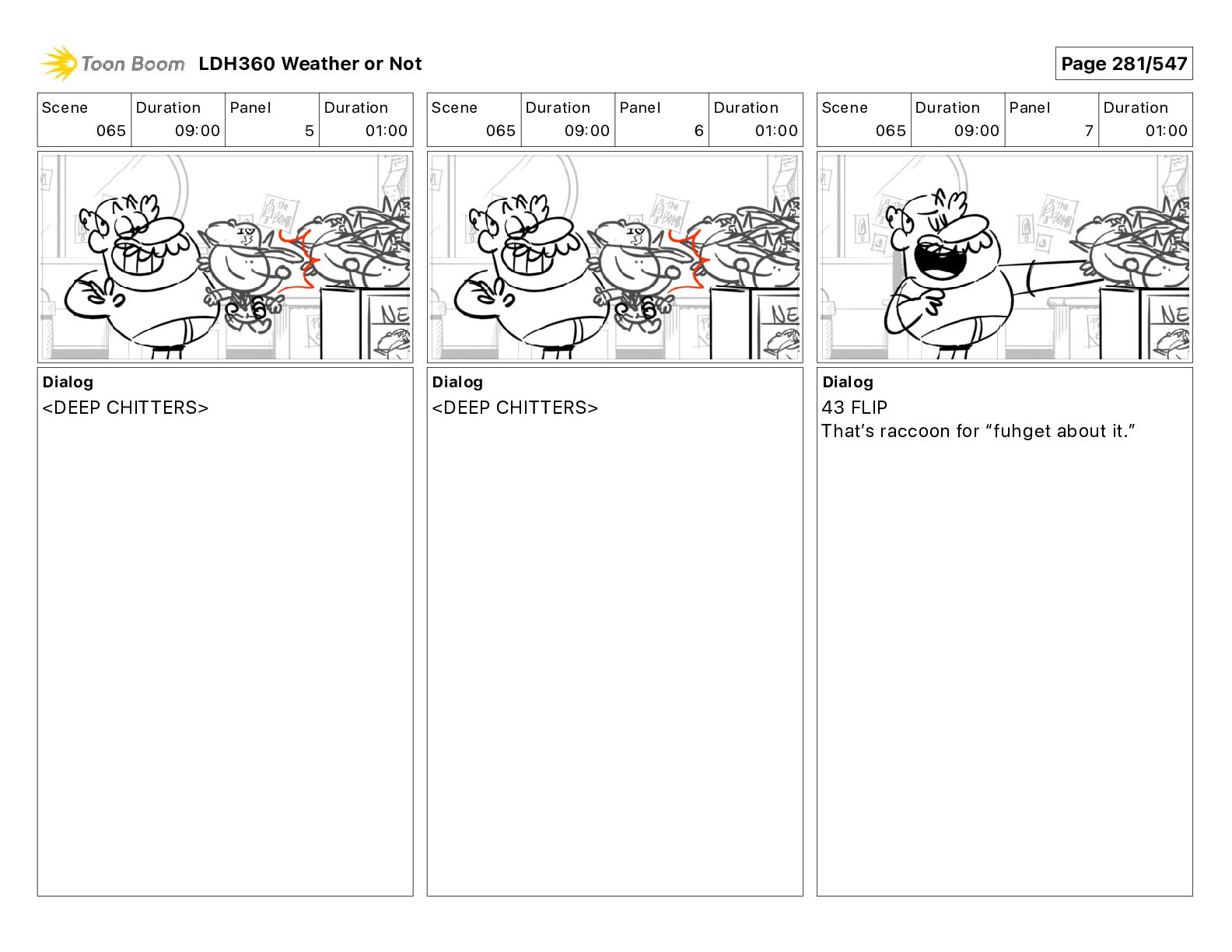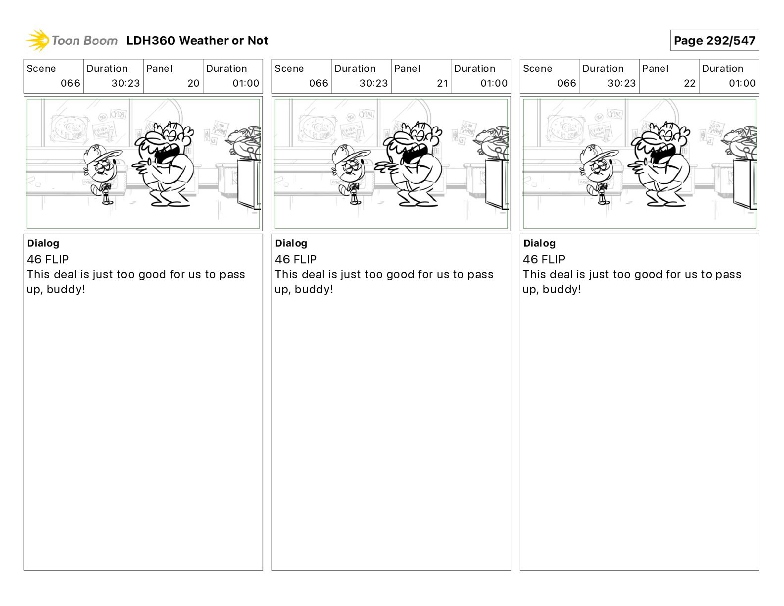 Dialog 46 FLIP This deal is just too good for us to pass up, buddy! Scene 066 Duration 30 23 Panel 21 Duration 01 00 Dialog 46 FLIP This deal is just too good for us to pass up, buddy! Scene 066 Duration 30 23 Panel 22 Duration 01 00 Dialog 46 FLIP This deal is just too good for us to pass up, buddy! LDH360 Weather or Not Page 292/547