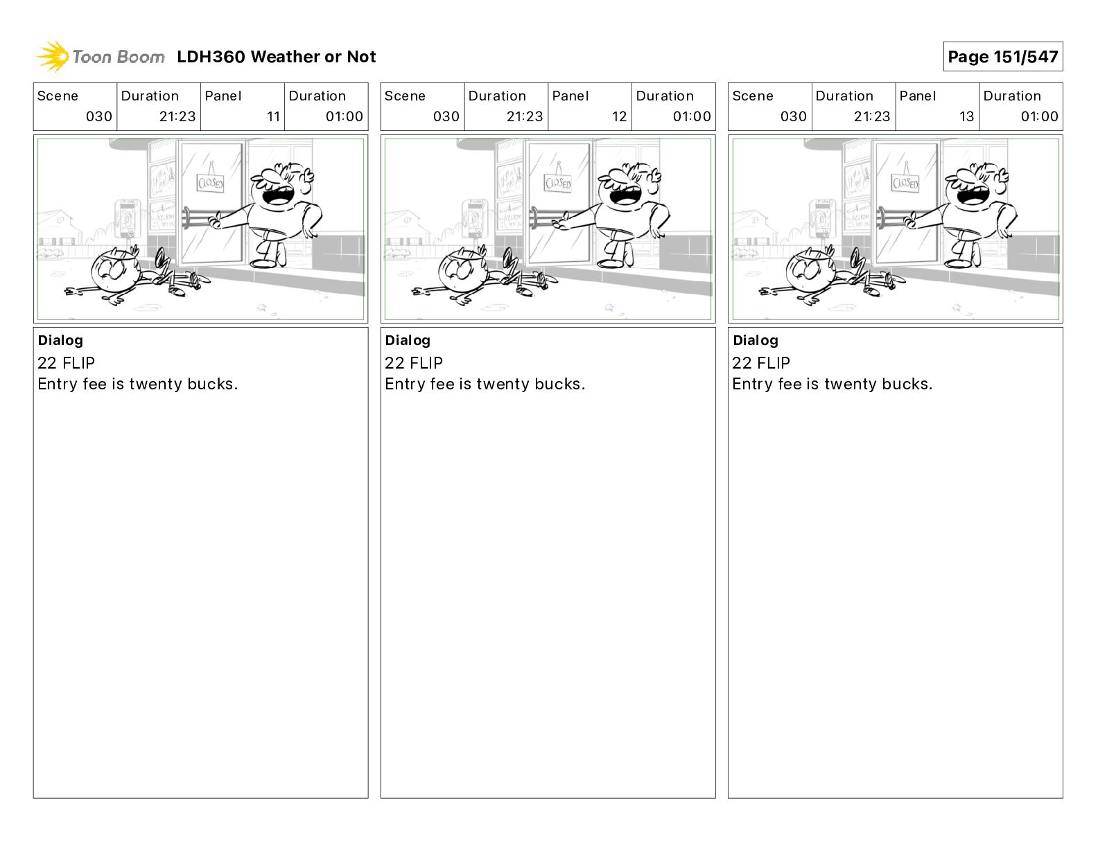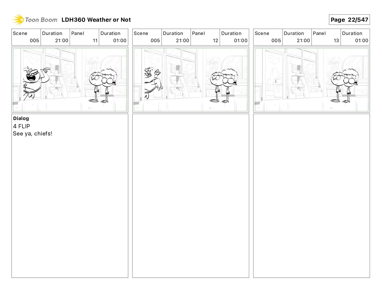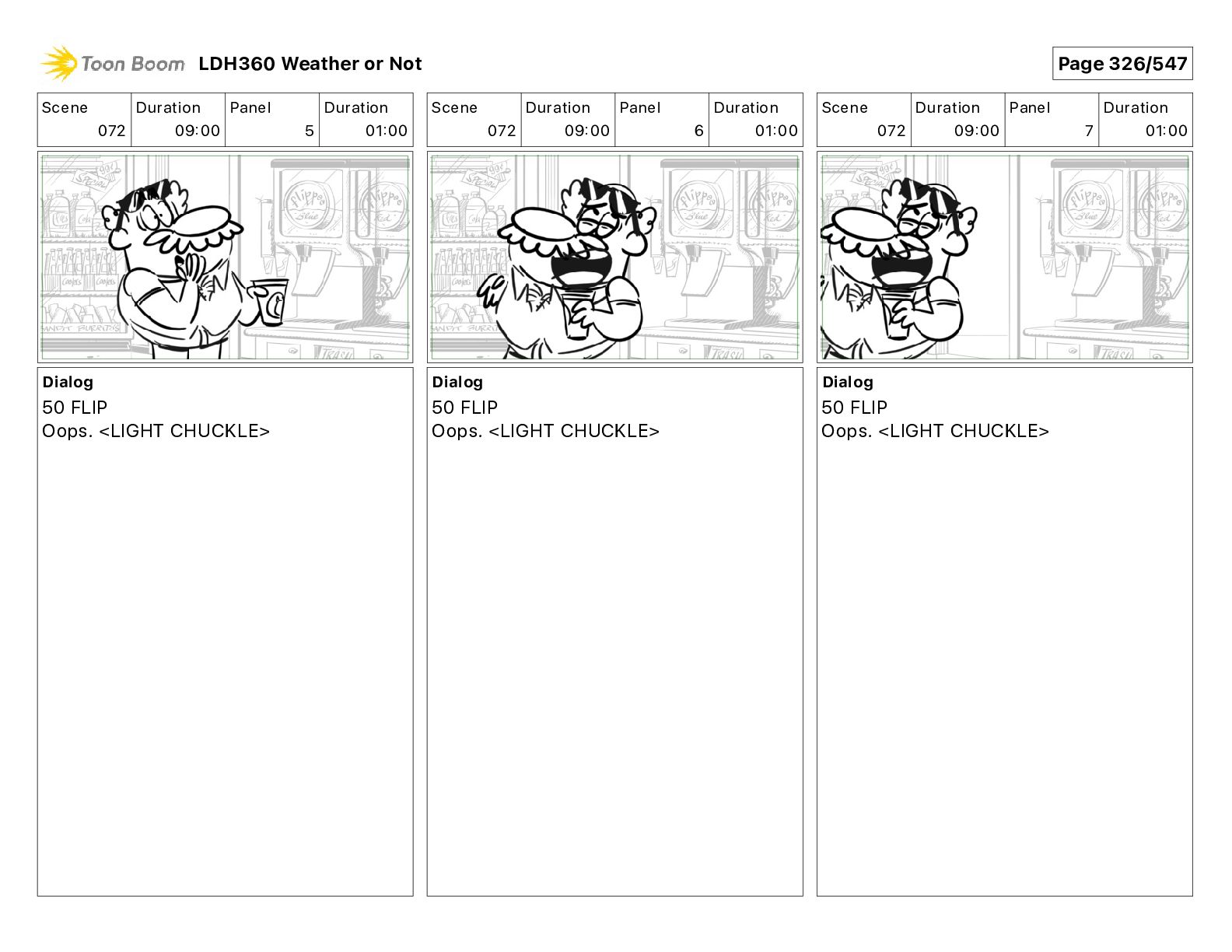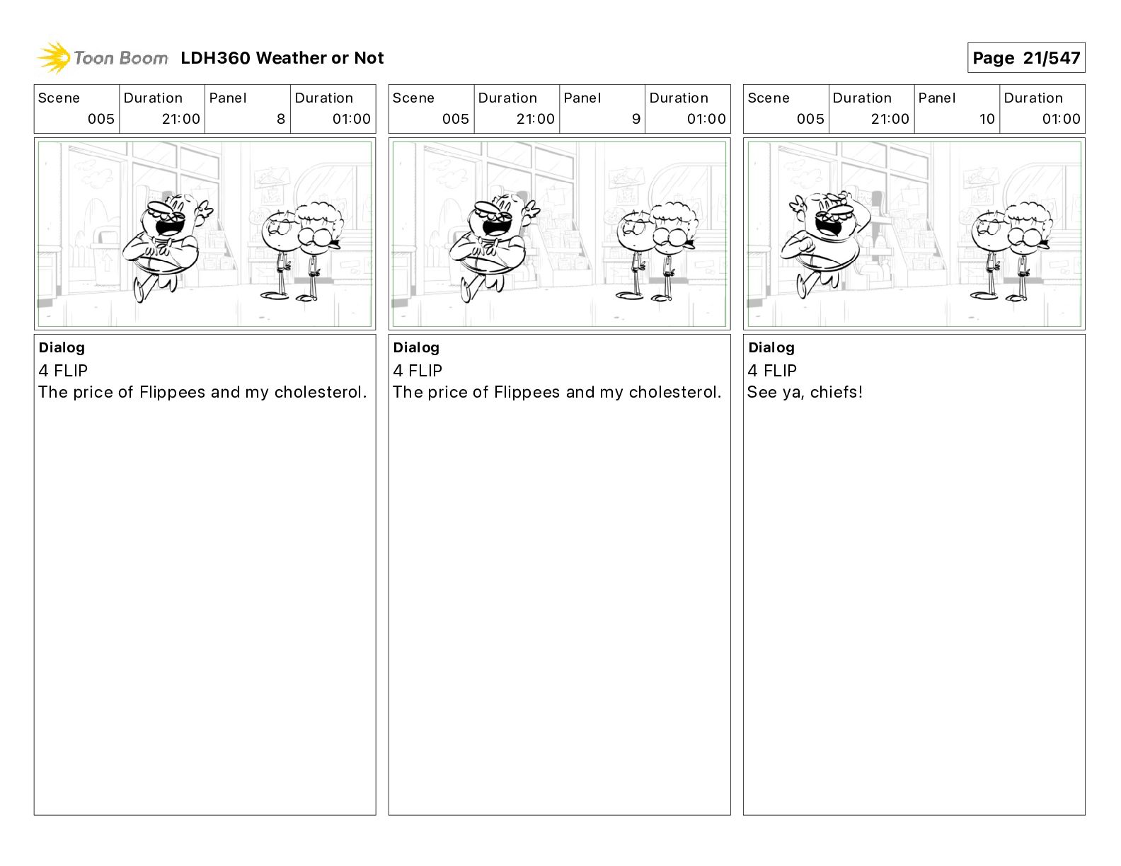 Dialog 4 FLIP The price of Flippees and my cholesterol. Scene 005 Duration 21 00 Panel 9 Duration 01 00 Dialog 4 FLIP The price of Flippees and my cholesterol. Scene 005 Duration 21 00 Panel 10 Duration 01 00 Dialog 4 FLIP See ya, chiefs! LDH360 Weather or Not Page 21/547