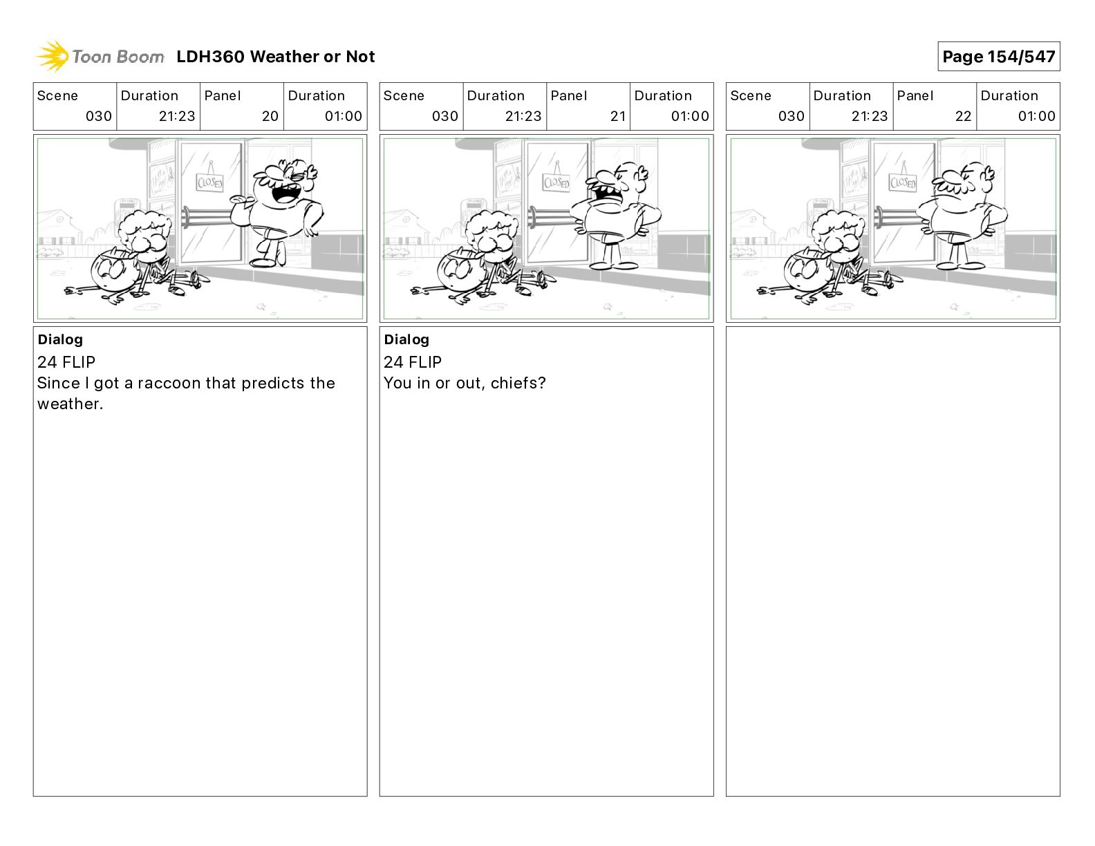 Dialog 24 FLIP Since I got a raccoon that predicts the weather. Scene 030 Duration 21 23 Panel 21 Duration 01 00 Dialog 24 FLIP You in or out, chiefs? Scene 030 Duration 21 23 Panel 22 Duration 01 00 LDH360 Weather or Not Page 154/547