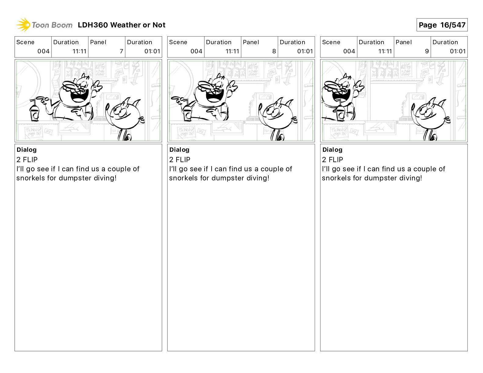 Dialog 2 FLIP Iʼll go see if I can find us a couple of snorkels for dumpster diving! Scene 004 Duration 11 11 Panel 8 Duration 01 01 Dialog 2 FLIP Iʼll go see if I can find us a couple of snorkels for dumpster diving! Scene 004 Duration 11 11 Panel 9 Duration 01 01 Dialog 2 FLIP Iʼll go see if I can find us a couple of snorkels for dumpster diving! LDH360 Weather or Not Page 16/547