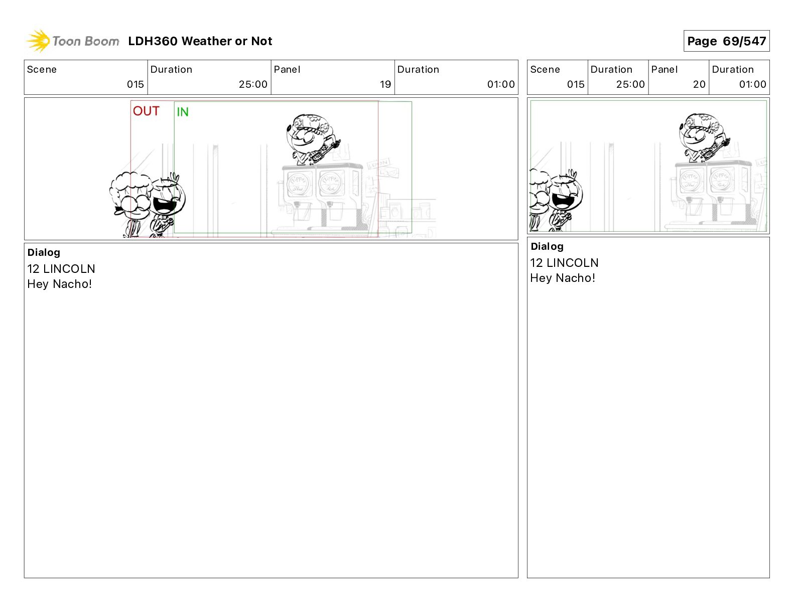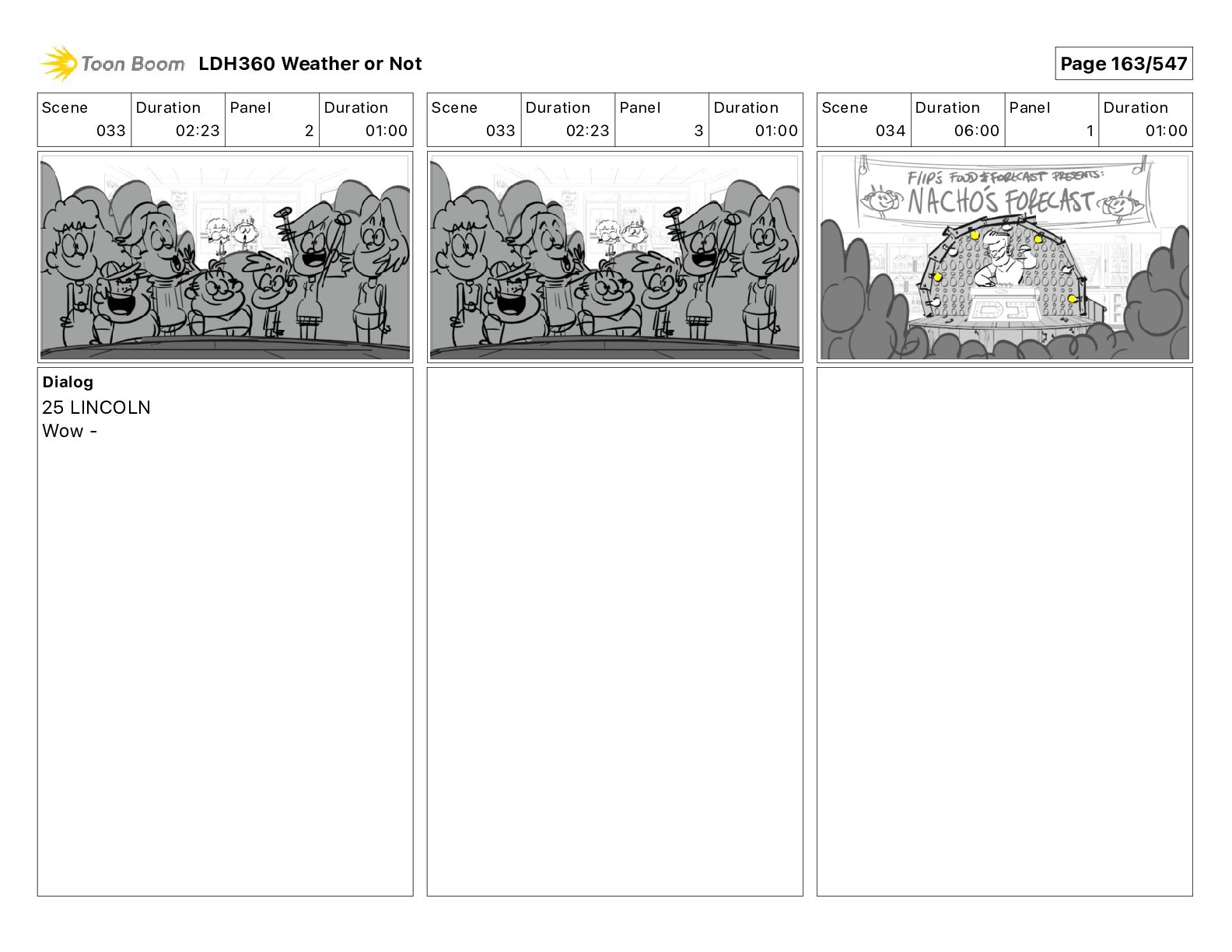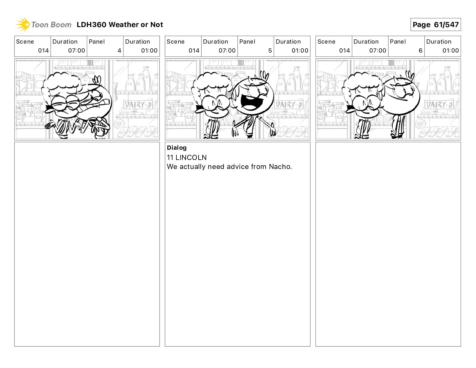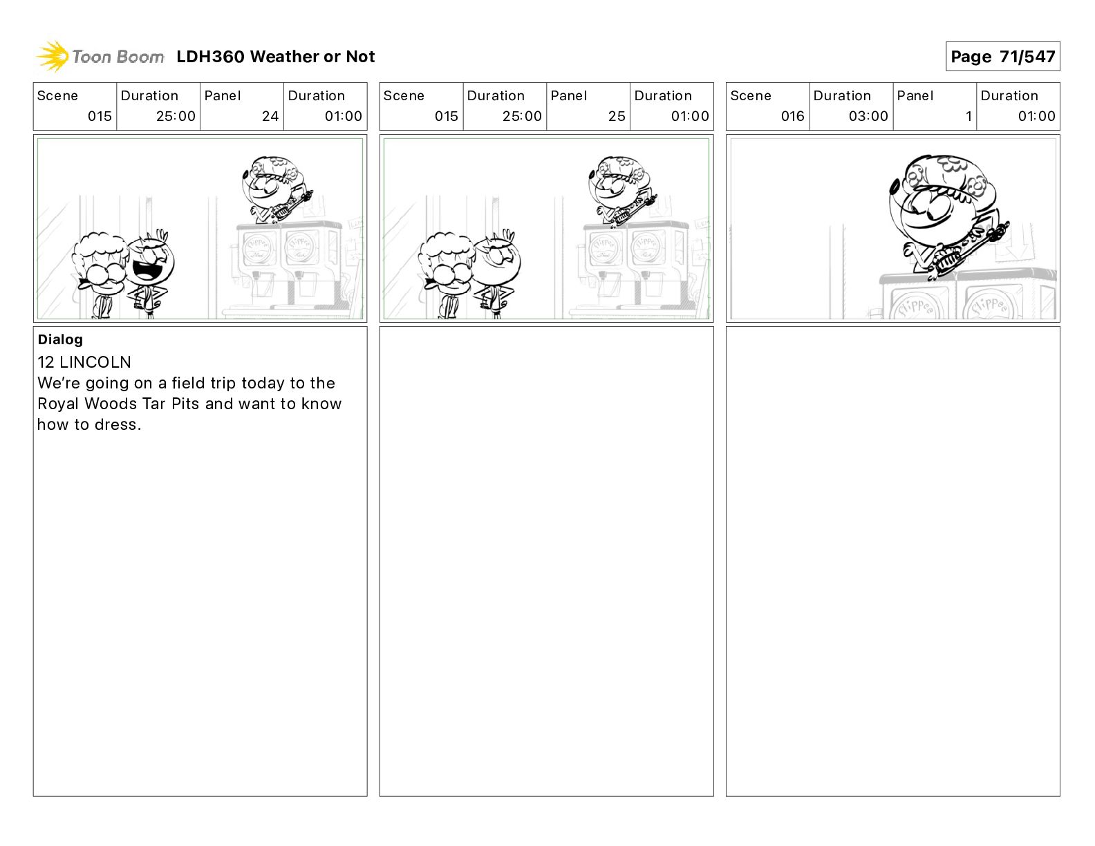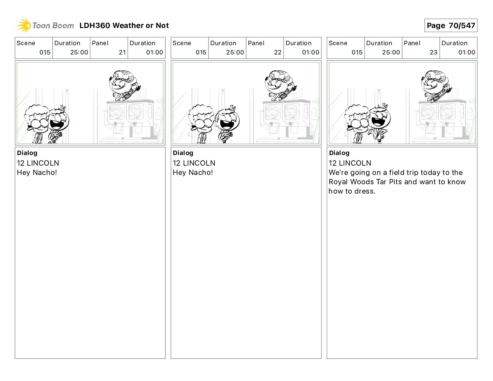 Dialog 12 LINCOLN Hey Nacho! Scene 015 Duration 25 00 Panel 22 Duration 01 00 Dialog 12 LINCOLN Hey Nacho! Scene 015 Duration 25 00 Panel 23 Duration 01 00 Dialog 12 LINCOLN Weʼre going on a field trip today to the Royal Woods Tar Pits and want to know how to dress. LDH360 Weather or Not Page 70/547