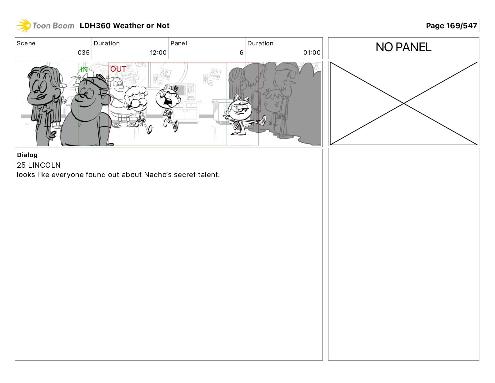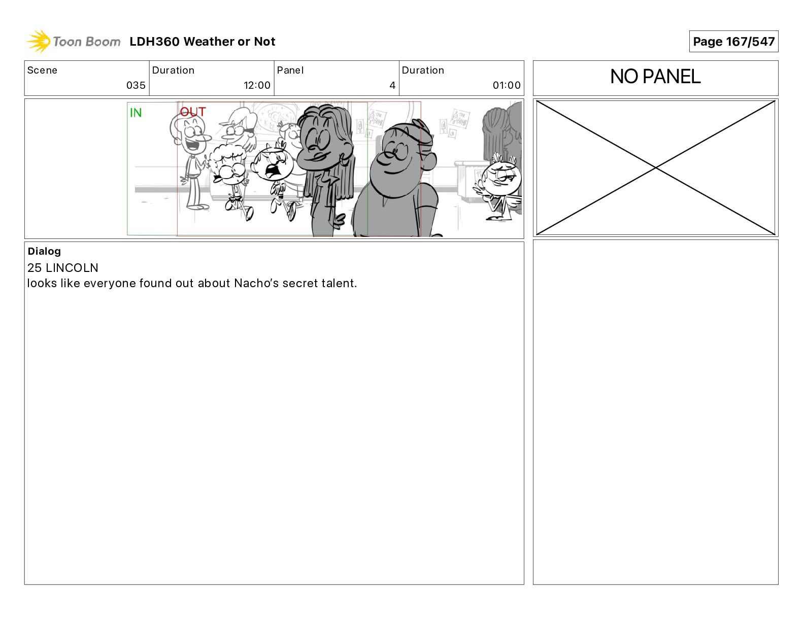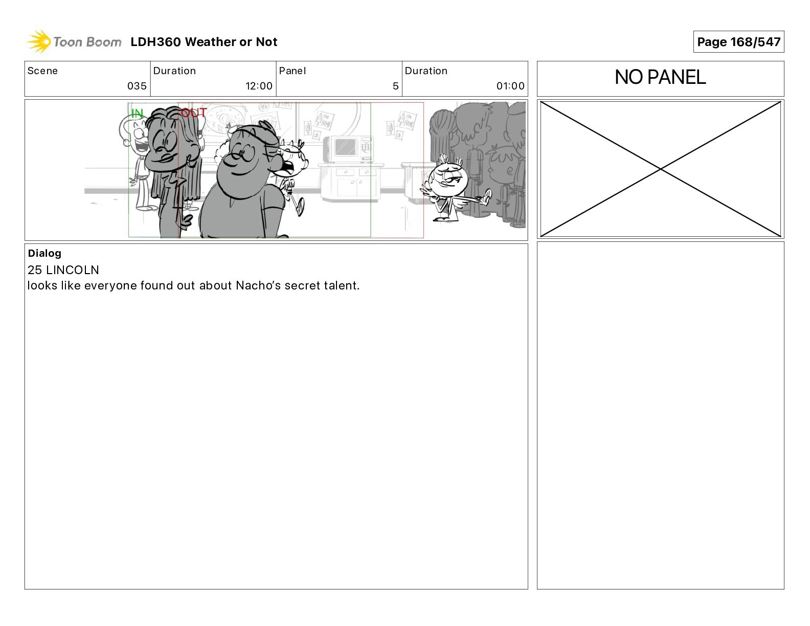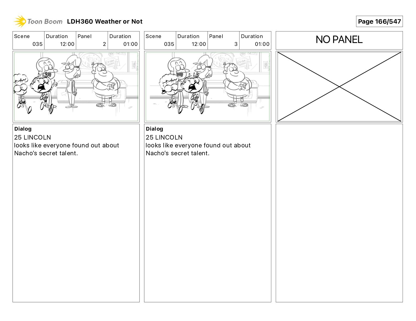 Dialog 25 LINCOLN looks like everyone found out about Nachoʼs secret talent. Scene 035 Duration 12 00 Panel 3 Duration 01 00 Dialog 25 LINCOLN looks like everyone found out about Nachoʼs secret talent. NO PANEL LDH360 Weather or Not Page 166/547