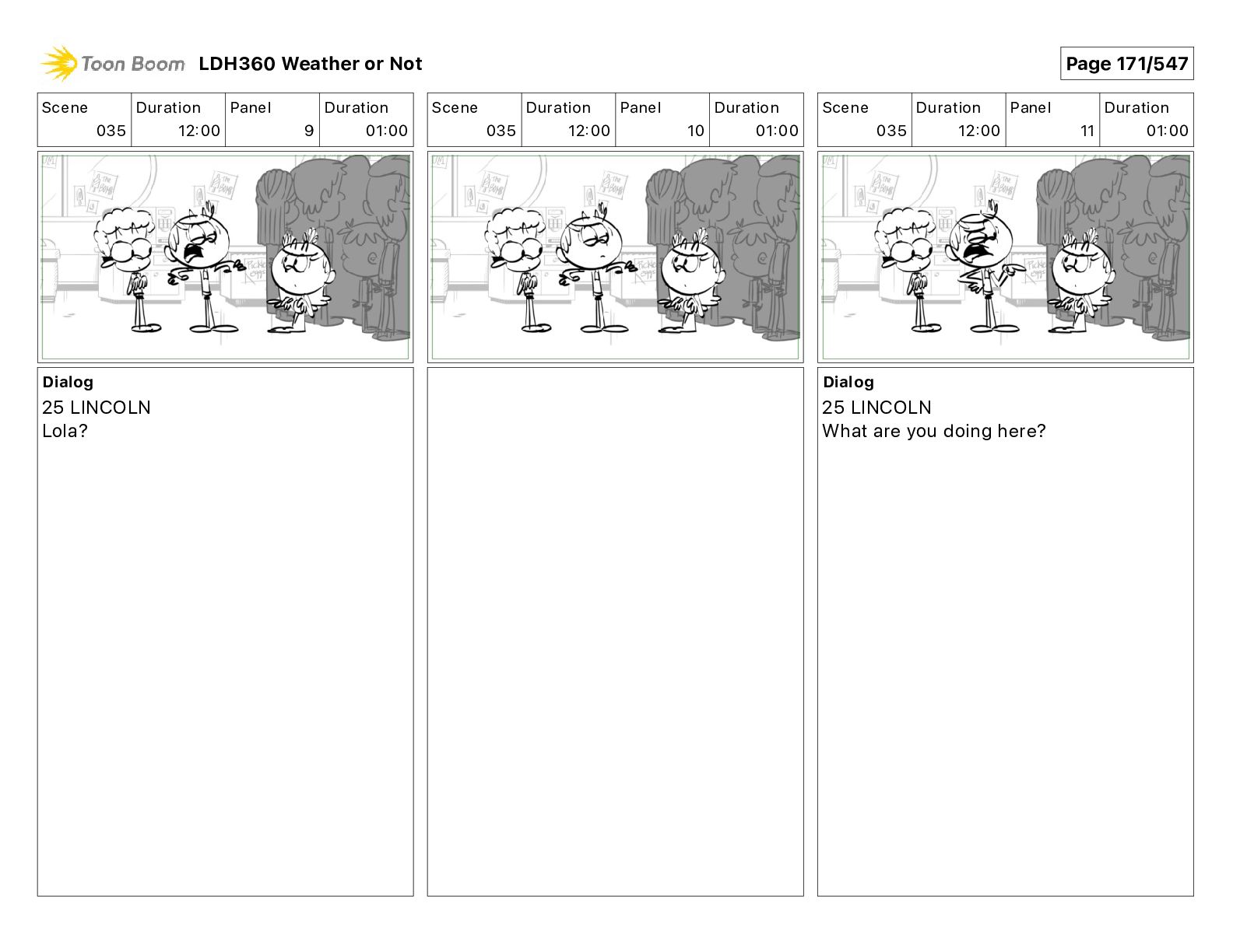 Dialog 25 LINCOLN Lola? Scene 035 Duration 12 00 Panel 10 Duration 01 00 Scene 035 Duration 12 00 Panel 11 Duration 01 00 Dialog 25 LINCOLN What are you doing here? LDH360 Weather or Not Page 171/547