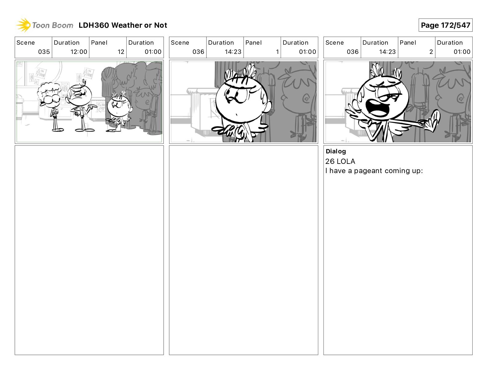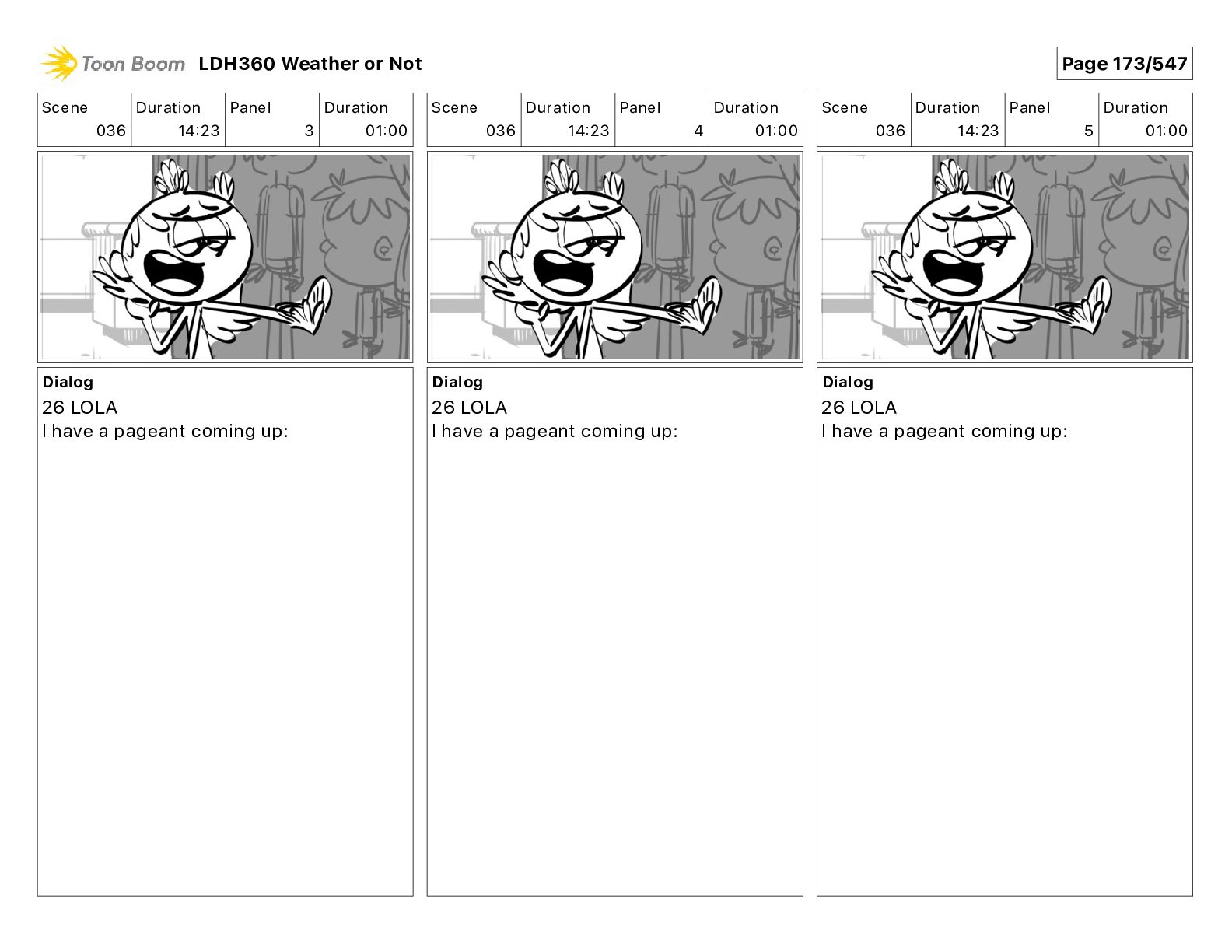 Dialog 26 LOLA I have a pageant coming up: Scene 036 Duration 14 23 Panel 4 Duration 01 00 Dialog 26 LOLA I have a pageant coming up: Scene 036 Duration 14 23 Panel 5 Duration 01 00 Dialog 26 LOLA I have a pageant coming up: LDH360 Weather or Not Page 173/547