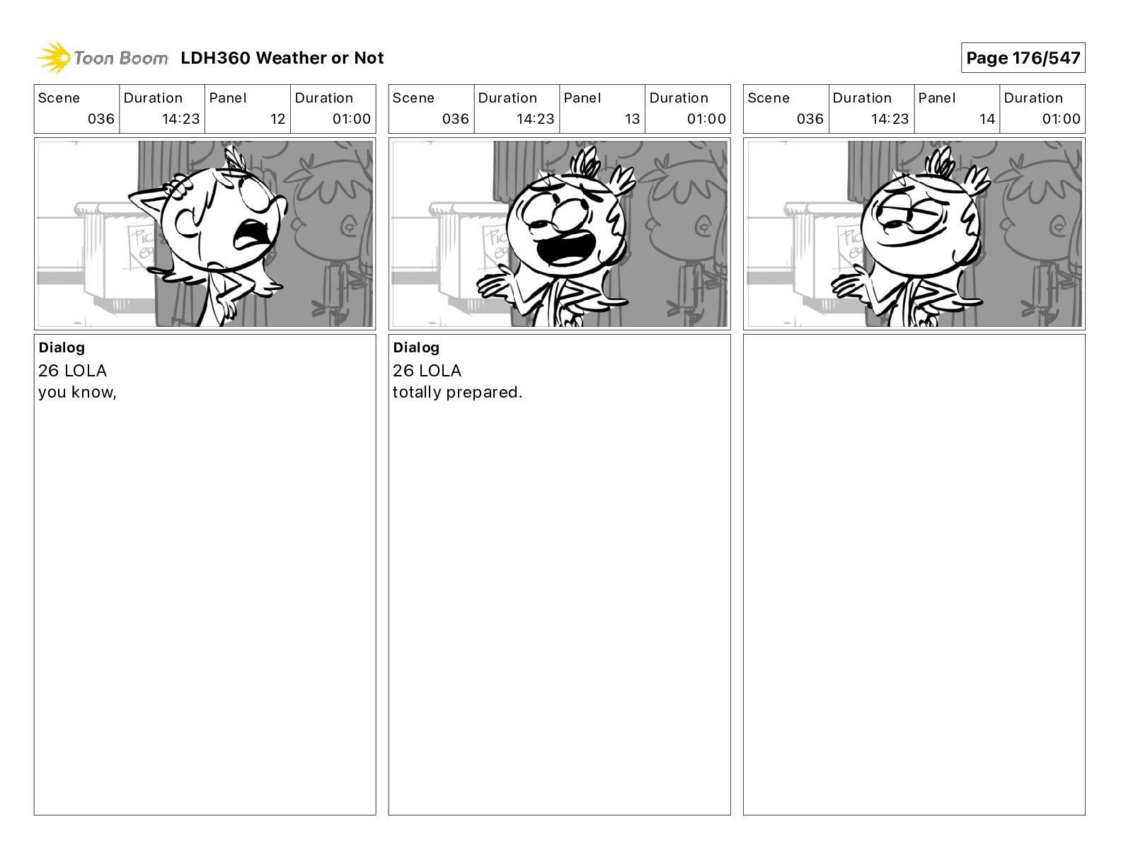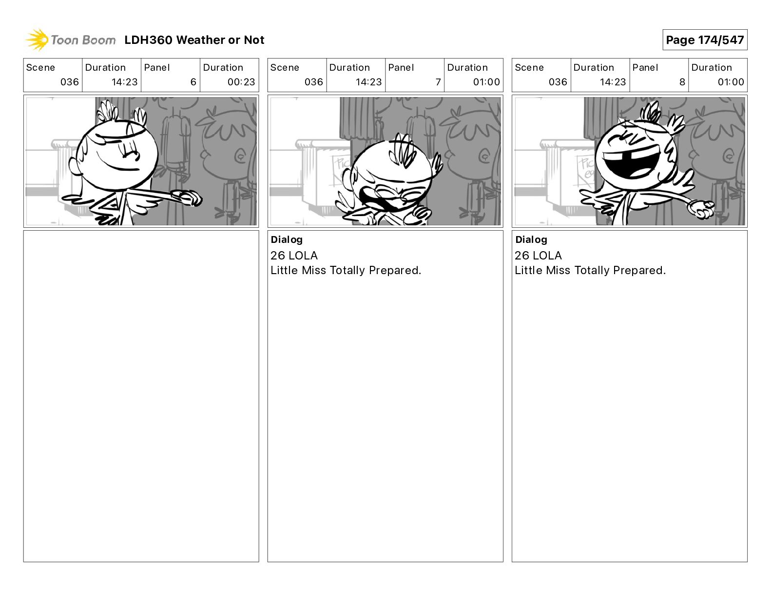 Scene 036 Duration 14 23 Panel 7 Duration 01 00 Dialog 26 LOLA Little Miss Totally Prepared. Scene 036 Duration 14 23 Panel 8 Duration 01 00 Dialog 26 LOLA Little Miss Totally Prepared. LDH360 Weather or Not Page 174/547