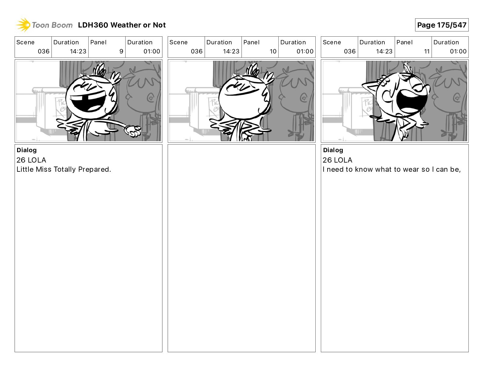 Dialog 26 LOLA Little Miss Totally Prepared. Scene 036 Duration 14 23 Panel 10 Duration 01 00 Scene 036 Duration 14 23 Panel 11 Duration 01 00 Dialog 26 LOLA I need to know what to wear so I can be, LDH360 Weather or Not Page 175/547