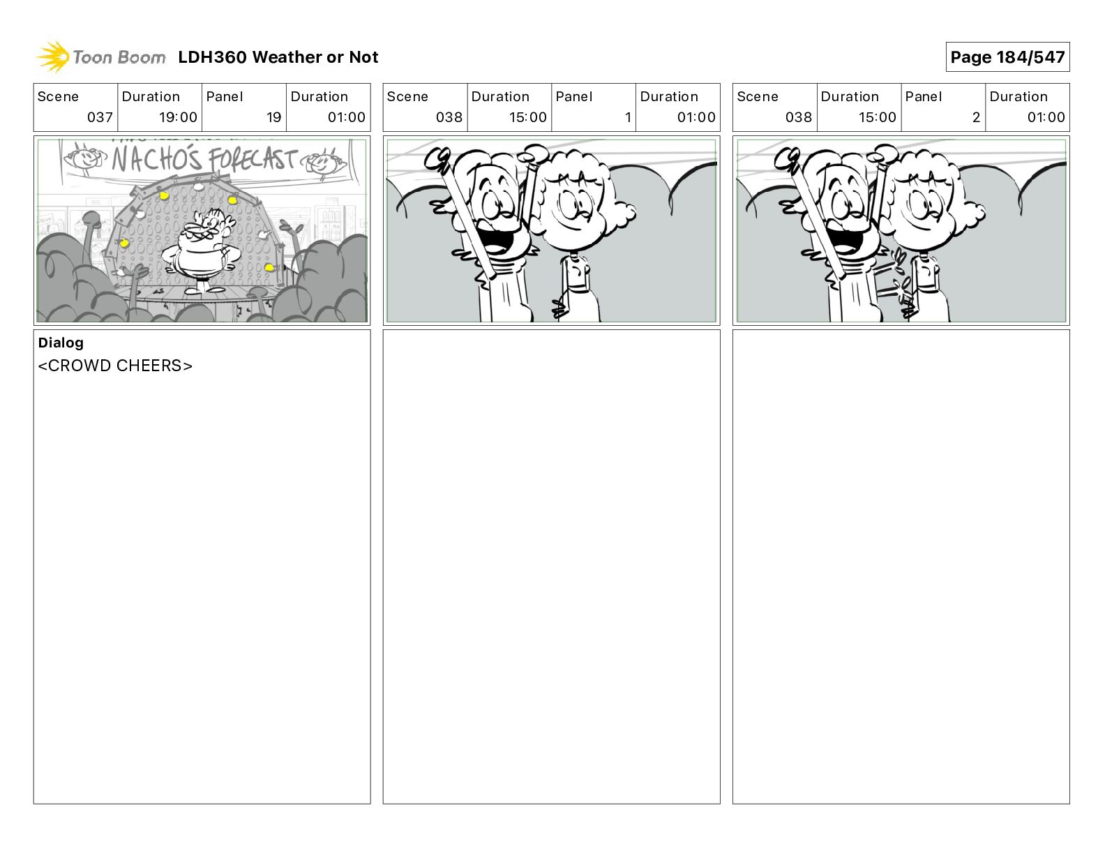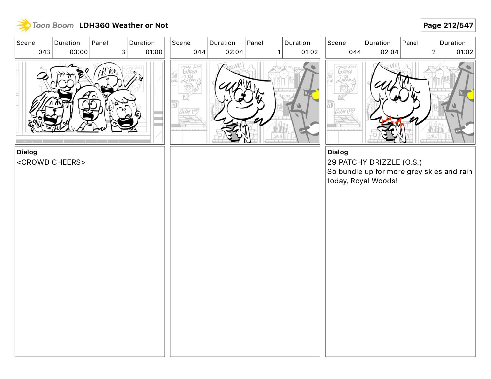 Dialog <CROWD CHEERS> Scene 044 Duration 02 04 Panel 1 Duration 01 02 Scene 044 Duration 02 04 Panel 2 Duration 01 02 Dialog 29 PATCHY DRIZZLE (O.S.) So bundle up for more grey skies and rain today, Royal Woods! LDH360 Weather or Not Page 212/547