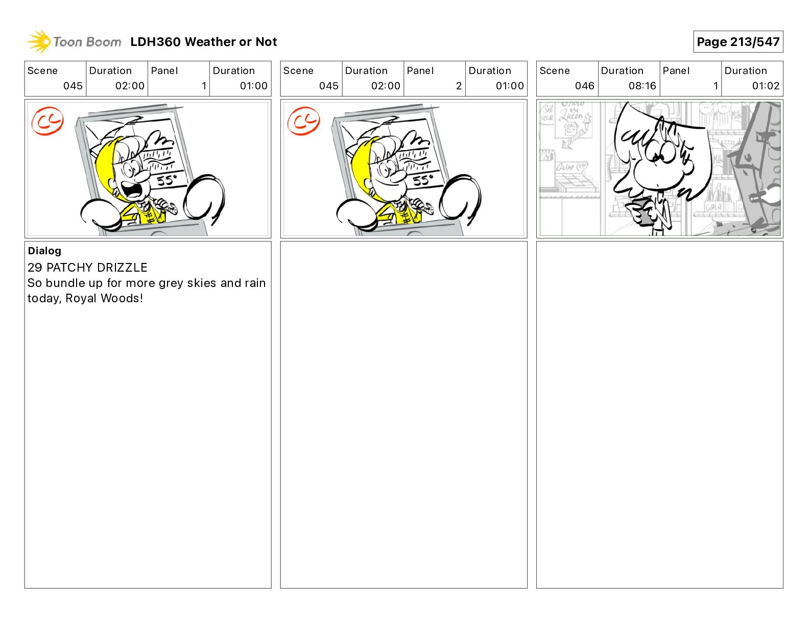 Dialog 29 PATCHY DRIZZLE So bundle up for more grey skies and rain today, Royal Woods! Scene 045 Duration 02 00 Panel 2 Duration 01 00 Scene 046 Duration 08 16 Panel 1 Duration 01 02 LDH360 Weather or Not Page 213/547