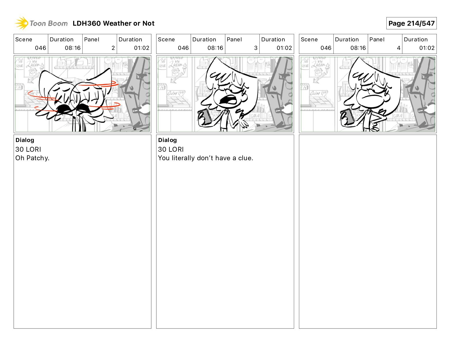 Dialog 30 LORI Oh Patchy. Scene 046 Duration 08 16 Panel 3 Duration 01 02 Dialog 30 LORI You literally donʼt have a clue. Scene 046 Duration 08 16 Panel 4 Duration 01 02 LDH360 Weather or Not Page 214/547
