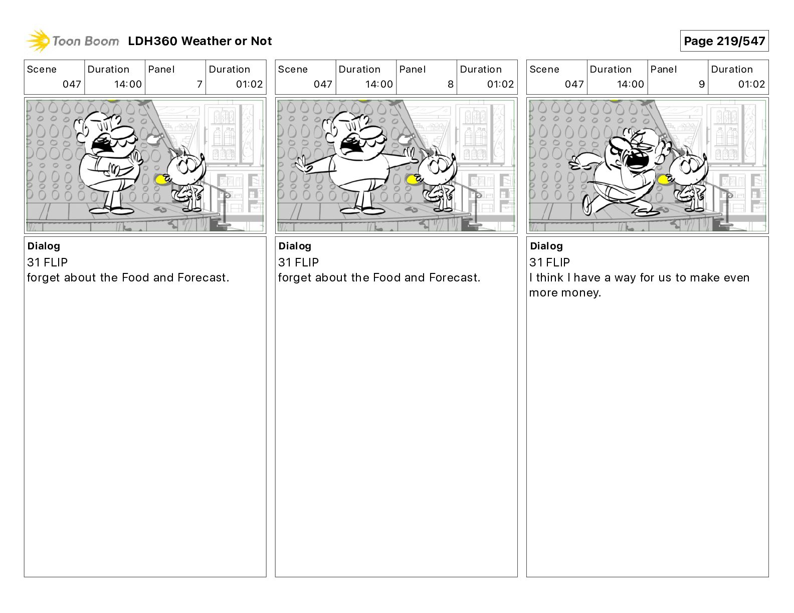 Dialog 31 FLIP forget about the Food and Forecast. Scene 047 Duration 14 00 Panel 8 Duration 01 02 Dialog 31 FLIP forget about the Food and Forecast. Scene 047 Duration 14 00 Panel 9 Duration 01 02 Dialog 31 FLIP I think I have a way for us to make even more money. LDH360 Weather or Not Page 219/547
