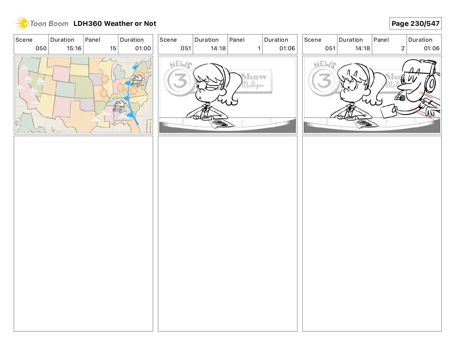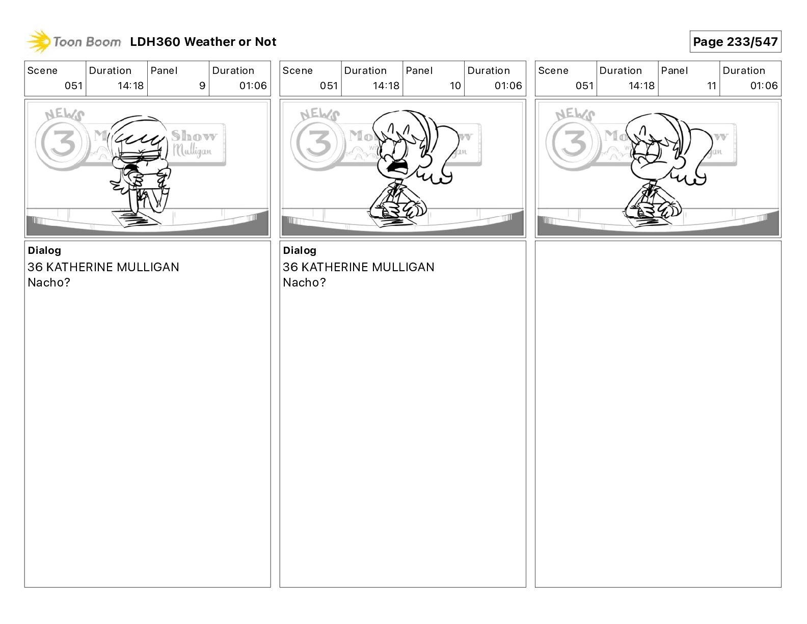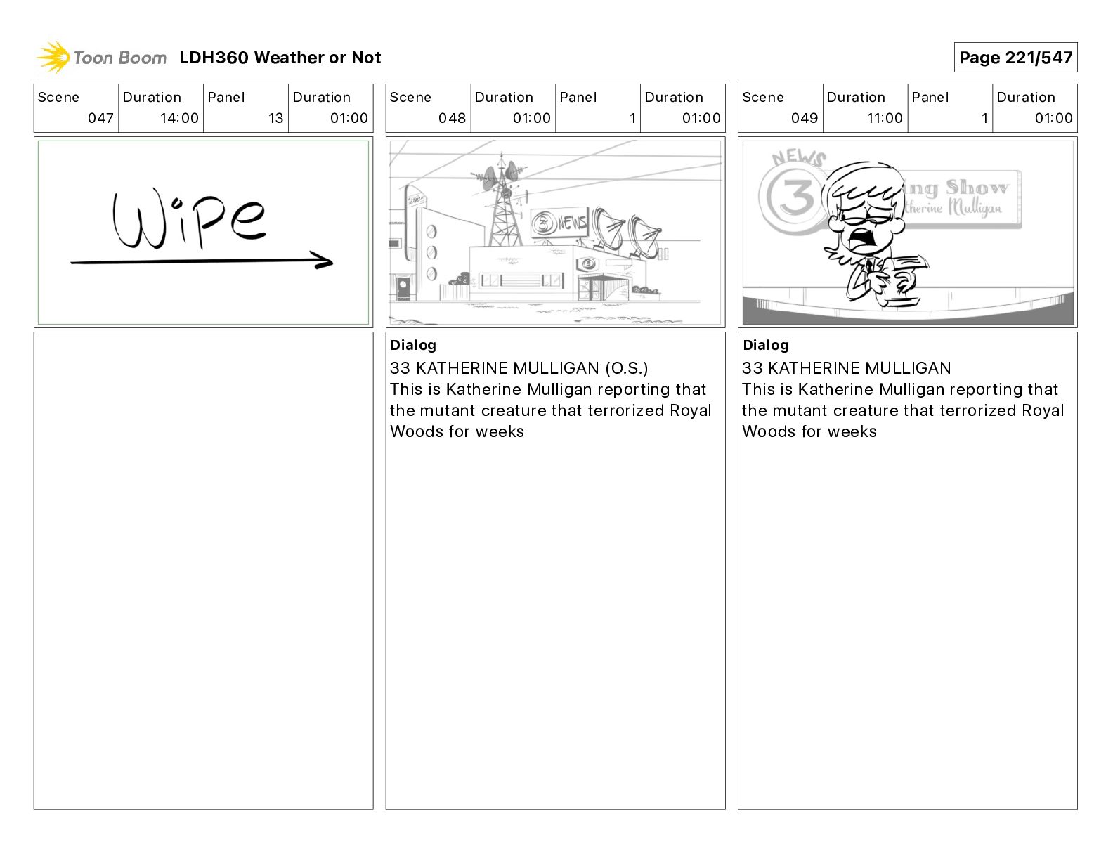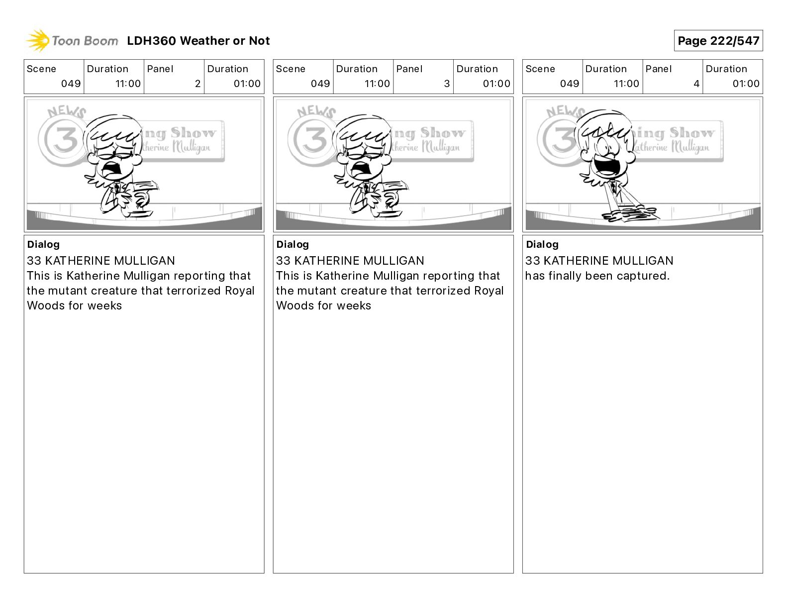 Scene 048 Duration 01 00 Panel 1 Duration 01 00 Dialog 33 KATHERINE MULLIGAN (O.S.) This is Katherine Mulligan reporting that the mutant creature that terrorized Royal Woods for weeks Scene 049 Duration 11 00 Panel 1 Duration 01 00 Dialog 33 KATHERINE MULLIGAN This is Katherine Mulligan reporting that the mutant creature that terrorized Royal Woods for weeks LDH360 Weather or Not Page 221/547